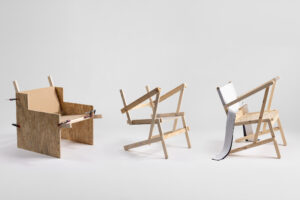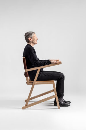 Ästhetisch unterstützen harte Kanten und Versätze den Eindruck einzelner Holzstreben, während Rundungen die Form des Stuhls an den Stellen weicher machen, an denen die NutzerInnen mit ihm interagiert.