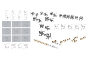 Aesthetically hard edges and offsets support the impression of individual wooden rods, while curves soften the shape of the chair in places where the user interacts with it.