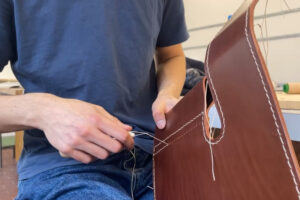 Die ineinandergreifenden Holzverbindungen und Ledernähte wurden in sorgfältiger Handarbeit hergestellt. Modernes CNC-Fräsen verleihen dem Sitz und der Holzlehne ergonomische Rundungen.