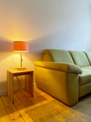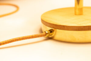 The choice of maple wood with its unique grain for the lamp base and shade provides an elegant tactile experience. The wood is sourced from sustainable forestry, is durable, and resistant to wear. Additionally, maple is particularly translucent, allowing the grain to glow from within when in the dark. Along with the brass MS63, an alloy known for its workability and antibacterial properties, the lamp offers both aesthetic and functional quality. Brass naturally ages and develops a characteristic patina over time. Furthermore, no components of the lamp are glued together – the wood, brass, and electronic parts can be disposed of and recycled separately.