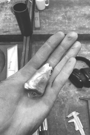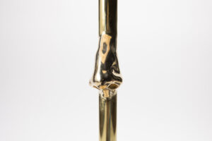 A distinctive feature of Mémoire is the brass light switch in the form of a nose. This switch is visible, yet subtly blends into the design so that it does not stand out. Repeated touching prevents a patina from forming at the spots that are frequently touched, keeping these areas in a golden shine. The resulting unique patina reflects the history of the lamp’s use. This concept is inspired by the tradition where touching specific body parts of statues is believed to bring good luck and has transformed the lamp into a personal keepsake that reveals the connection between its owner and the object over time.