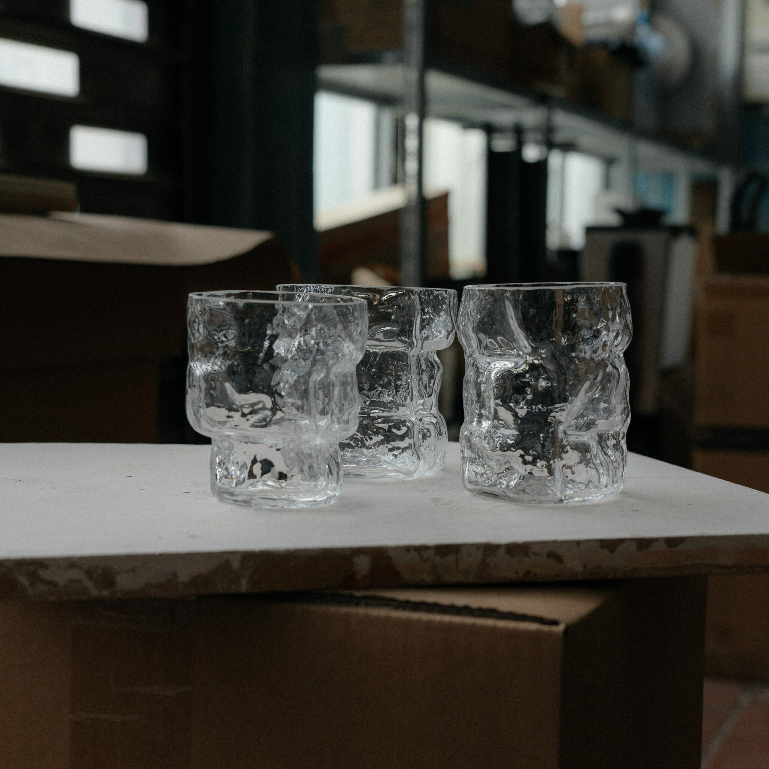 The Fault Line Collection captures this tension in drinking vessels, where glass adopts the fractured texture of stone, and modular molds shape each contour. Tactile traces of material origin and making in everyday rituals.