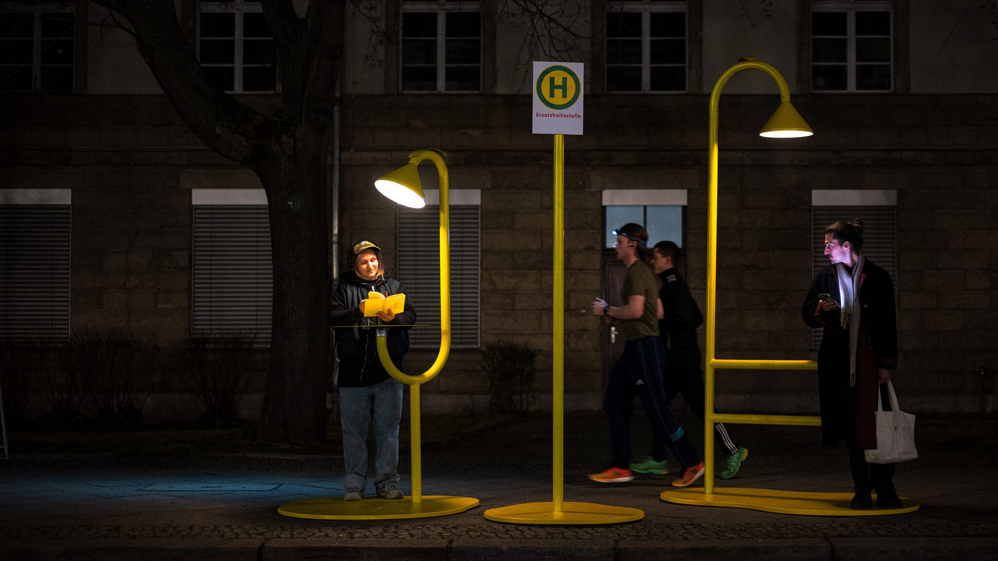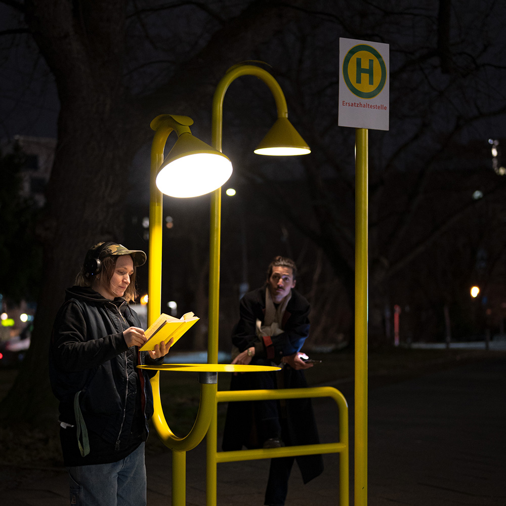 Die Arbeit thematisiert das Warten an Ersatzbushaltestellen – Orten, die durch Anonymität und Identitätslosigkeit geprägt sind – und verwandelt sie in eine komfortable und vertraute Umgebung des Wartens.