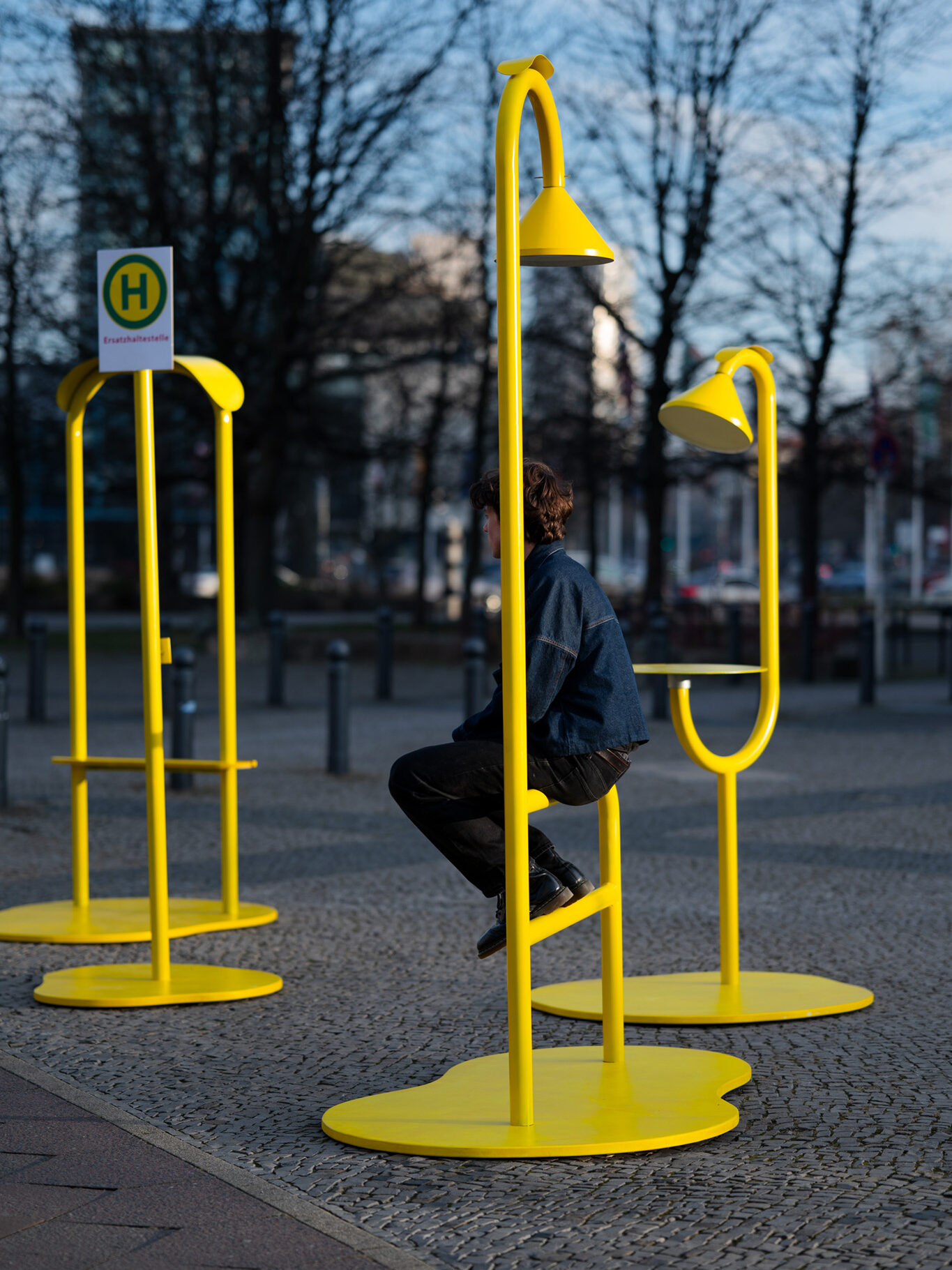 The work addresses the experience of waiting at temporary bus stops — places characterized by anonymity and a lack of identity — and transforms them into a comfortable and familiar environment for waiting.