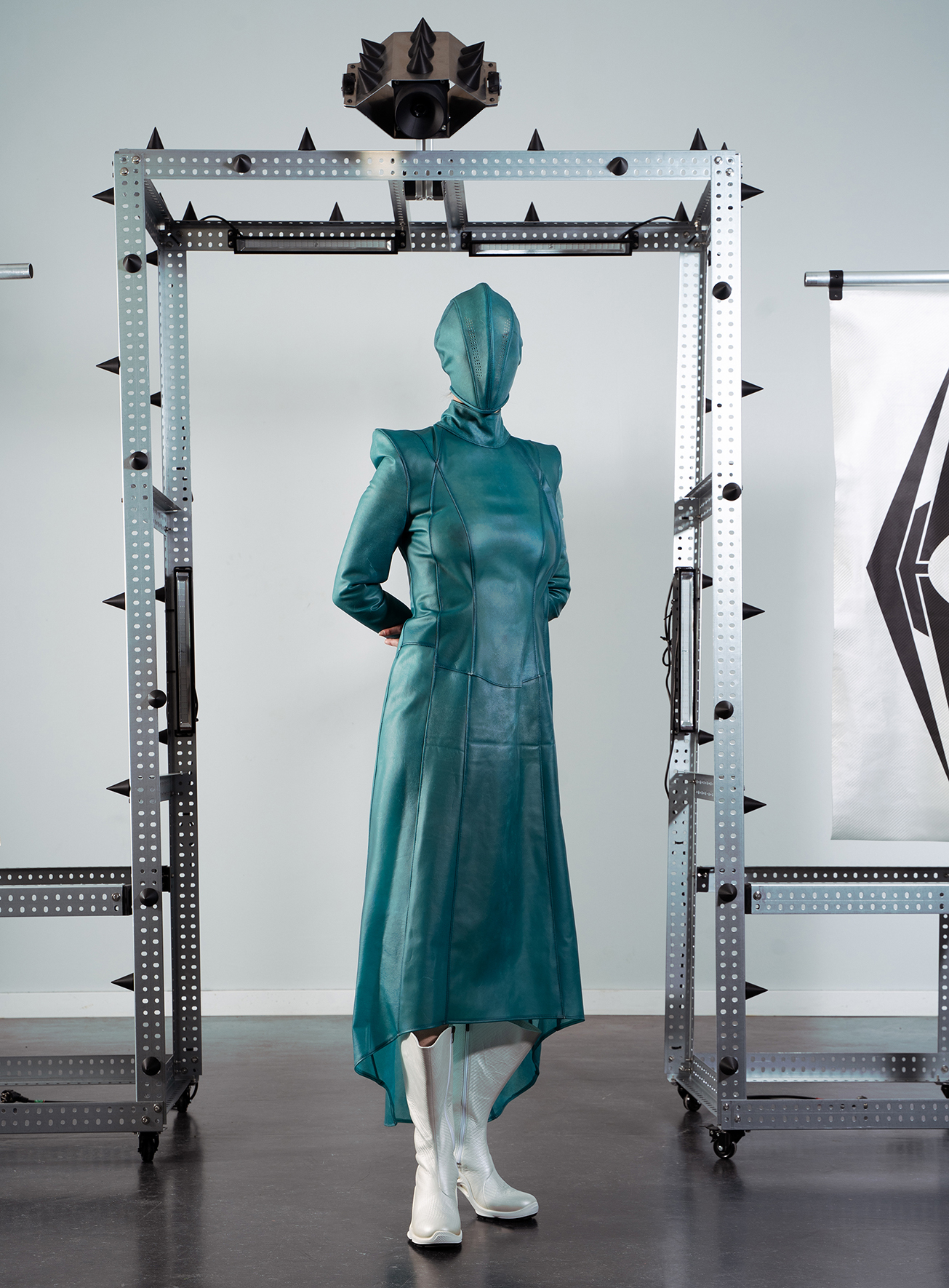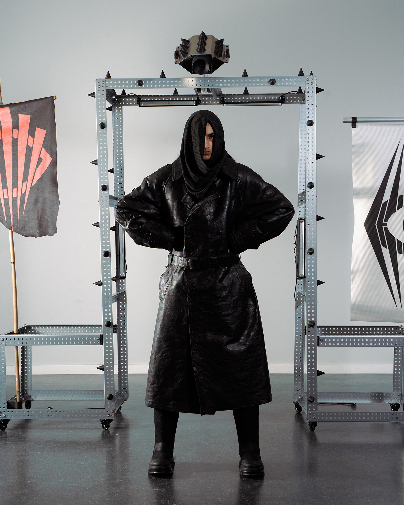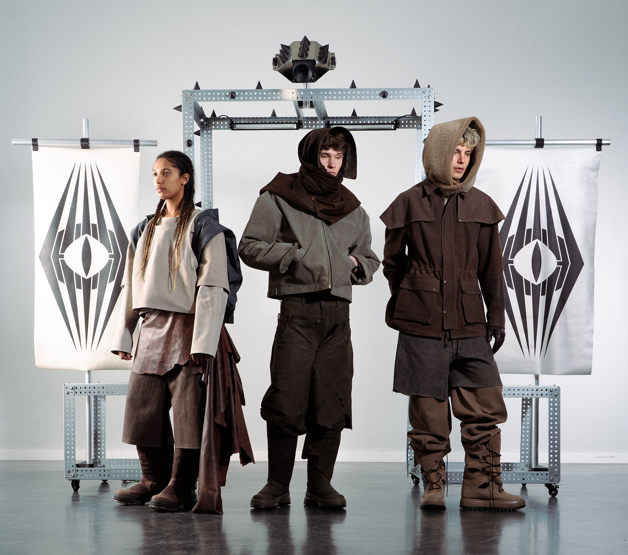 In meiner Bachelorprojekt „Panopticon“ geht es um eine Dystopie, in der die Gesellschaft mittels KI gestützten Überwachungssystemen von einer kleinen Minderheit überwacht wird. Das Machtgefälle wird anhand folgender drei Gruppen visualisiert und soll einen überspitzten Ausblick auf die Zukunft von Gesellschaften bieten, falls die totalitären Gedanken einzelner weiter an Zustimmung gewinnen. Die gesamte Kollektion ist dabei aus Leder entwickelt, welches ich in meinem Praktikum bei Eccoleather selbst designed und angefertigt habe. Ruler – die herrschende Elite, die sich durch technologischen Fortschritt und KI-Überwachungssysteme an die Spitze gesetzt hat. Sie haben sich durch ihre Mittel von der restlichen Bevölkerung entfremdet und verkörpern absolute Kontrolle. people – die unterdrückte Mehrheit, die durch eine strenge Kleiderordnung uniformiert und ihrer Individualität beraubt wird. Sie repräsentieren Machtlosigkeit und Anpassung. Riots – eine Widerstandsbewegung aus Akteuren beider Gruppen, die sich der Überwachung durch Tarnung und Sabotage entziehen. Sie stehen für Hoffnung und Veränderung.