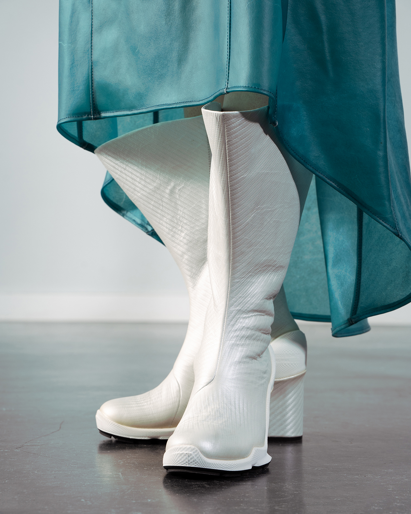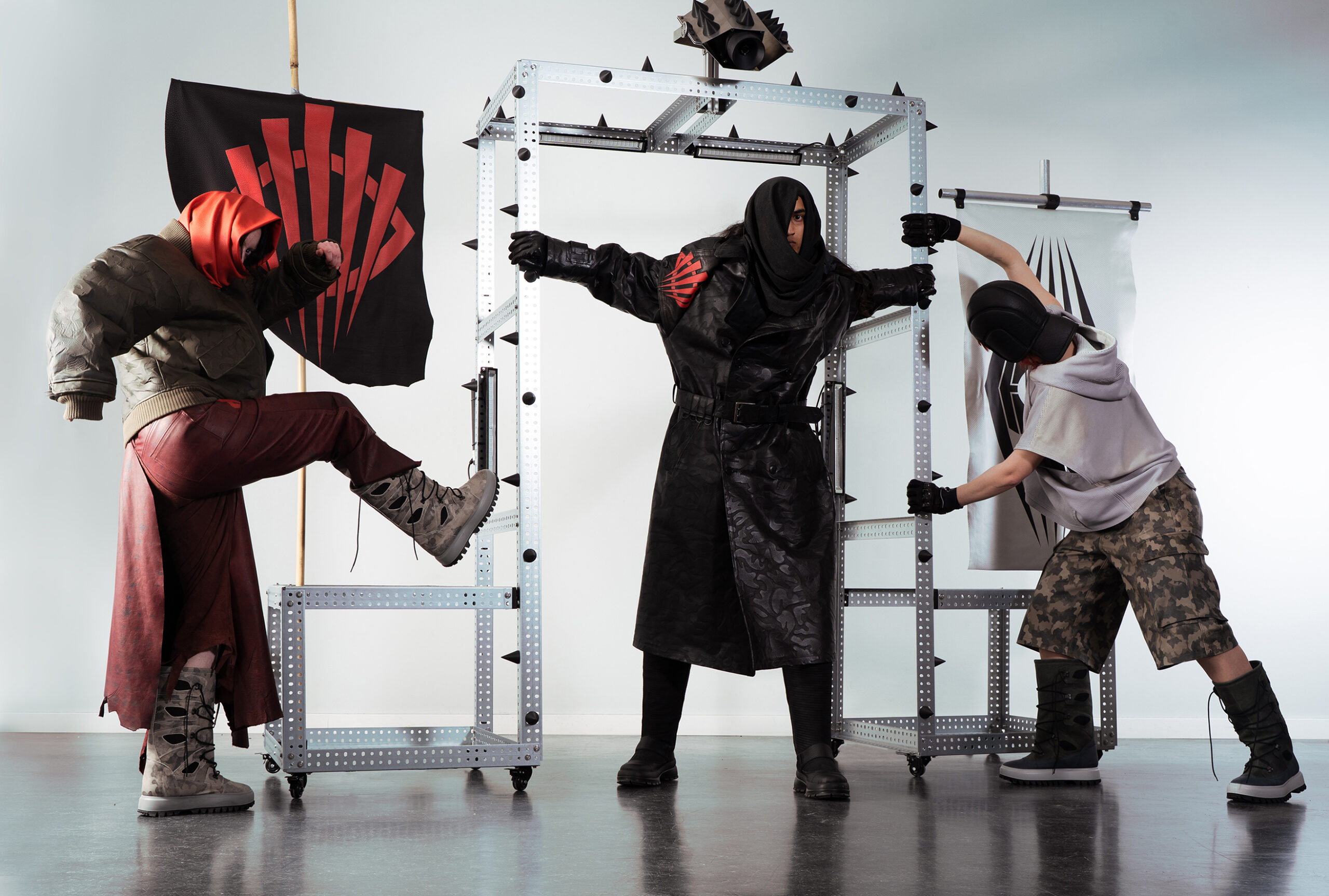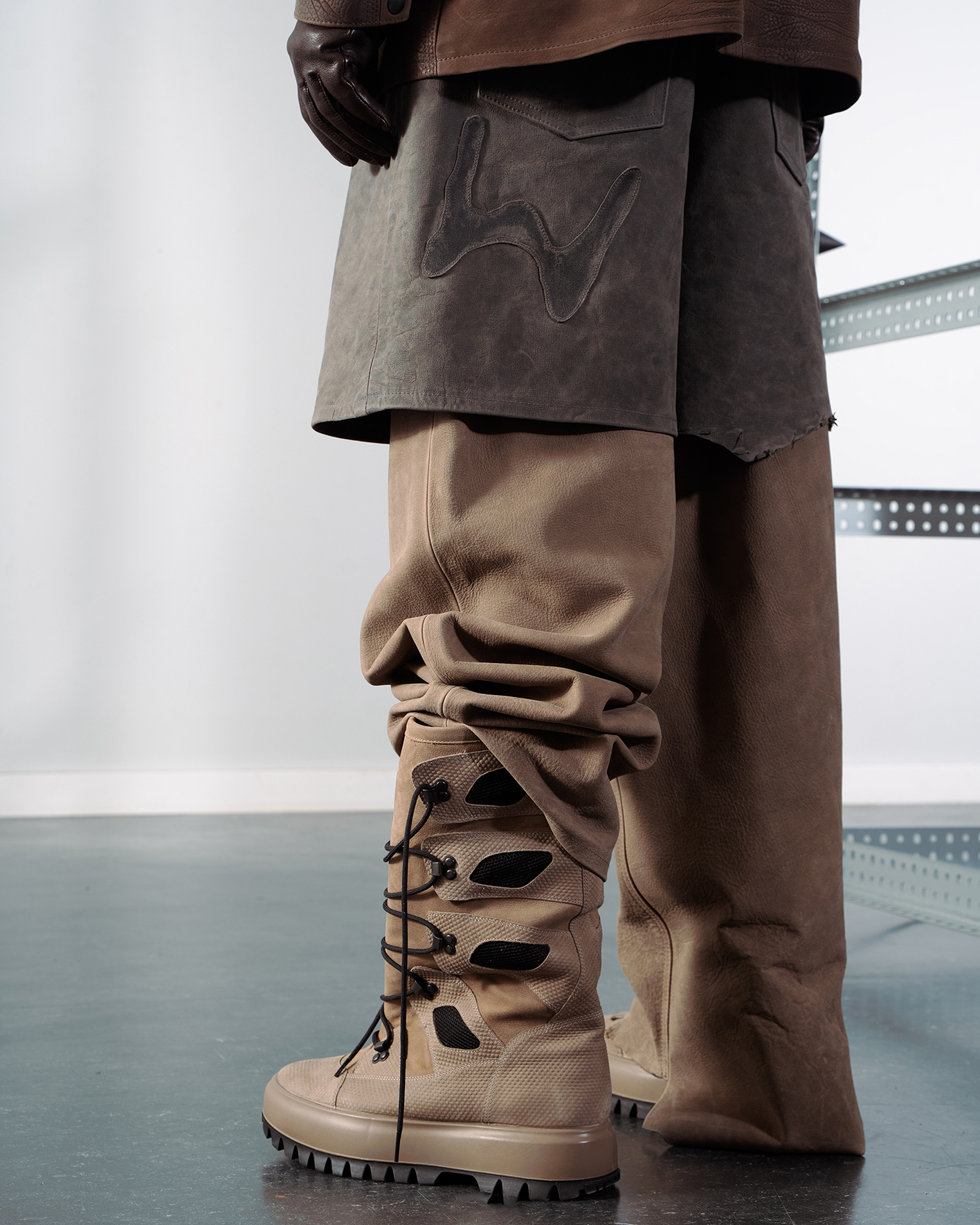 In meiner Bachelorprojekt „Panopticon“ geht es um eine Dystopie, in der die Gesellschaft mittels KI gestützten Überwachungssystemen von einer kleinen Minderheit überwacht wird. Das Machtgefälle wird anhand folgender drei Gruppen visualisiert und soll einen überspitzten Ausblick auf die Zukunft von Gesellschaften bieten, falls die totalitären Gedanken einzelner weiter an Zustimmung gewinnen. Die gesamte Kollektion ist dabei aus Leder entwickelt, welches ich in meinem Praktikum bei Eccoleather selbst designed und angefertigt habe. Ruler – die herrschende Elite, die sich durch technologischen Fortschritt und KI-Überwachungssysteme an die Spitze gesetzt hat. Sie haben sich durch ihre Mittel von der restlichen Bevölkerung entfremdet und verkörpern absolute Kontrolle. people – die unterdrückte Mehrheit, die durch eine strenge Kleiderordnung uniformiert und ihrer Individualität beraubt wird. Sie repräsentieren Machtlosigkeit und Anpassung. Riots – eine Widerstandsbewegung aus Akteuren beider Gruppen, die sich der Überwachung durch Tarnung und Sabotage entziehen. Sie stehen für Hoffnung und Veränderung.