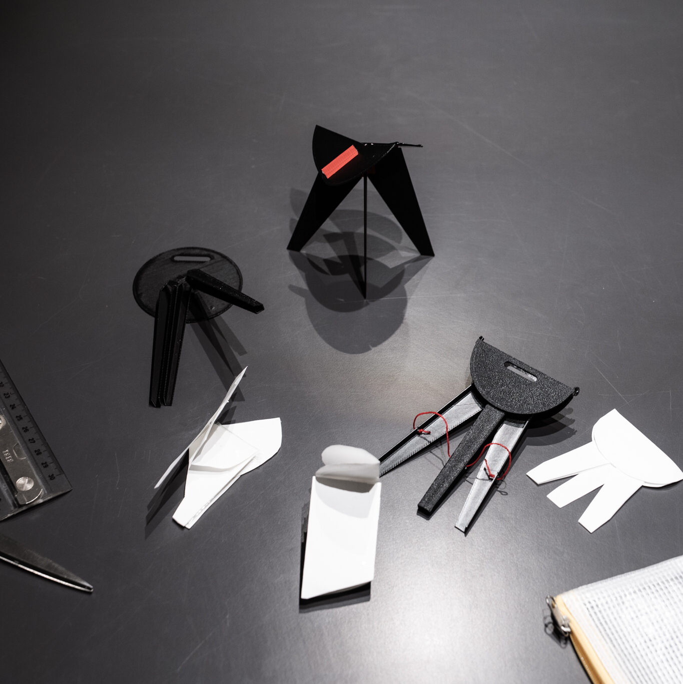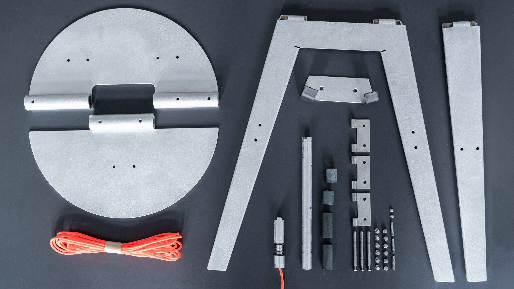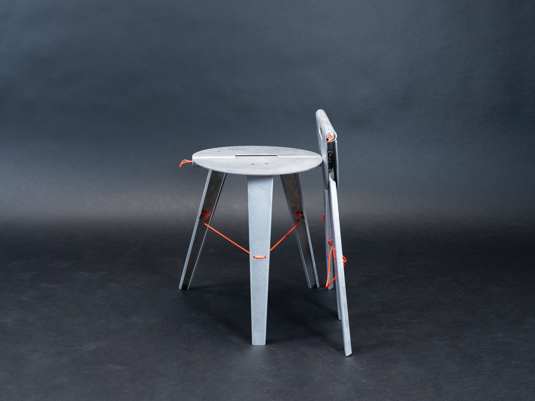 Für die Konstruktion wurde Aluminium gewählt – ein leichtes, robustes und brandschutzgerechtes Material, das sich gut für die Fertigung aus Blech eignet. Die Scharniere sind integraler Bestandteil der Konstruktion und werden direkt aus dem Material herausgearbeitet: Durch das Aufrollen der Blechkanten entstehen stabile Verbindungen, die sowohl die Klappfunktion ermöglichen als auch im zusammengeklappten Zustand einen ergonomischen Griff bilden. Eine integrierte Mechanik im Scharnier fixiert die Sitzfläche sicher in der ausgeklappten und eingeklappten Position. Durch Ziehen an einer Lasche kann der Mechanismus gelöst und der Hocker ein- oder ausgeklappt werden.