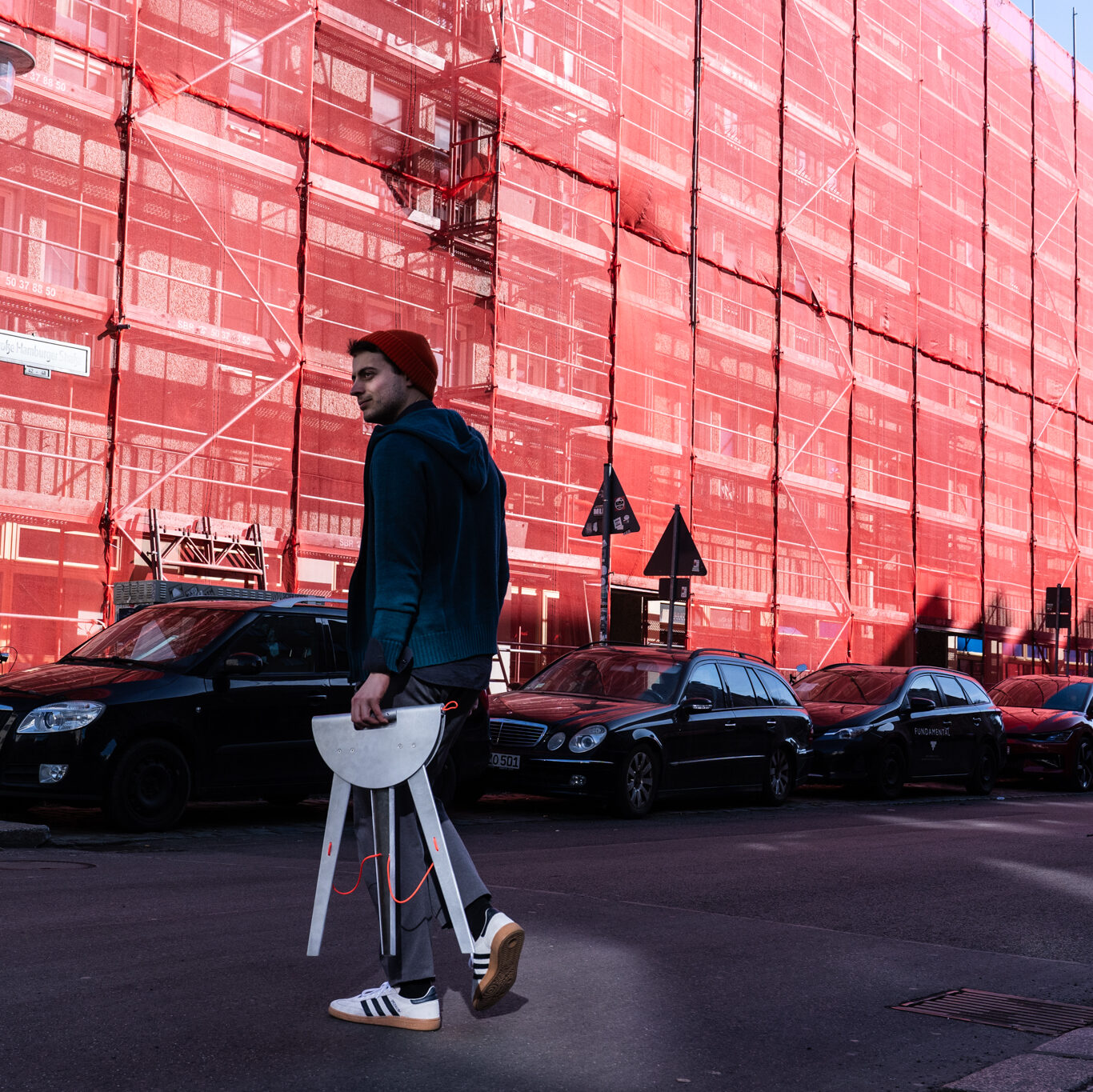 The design of the stool is shaped by two key requirements: it must stand stable on uneven surfaces – such as typical sidewalks – and, when folded, take up as little space as possible to keep escape routes and movement areas clear. From this, the form of a three-legged, foldable stool was developed.