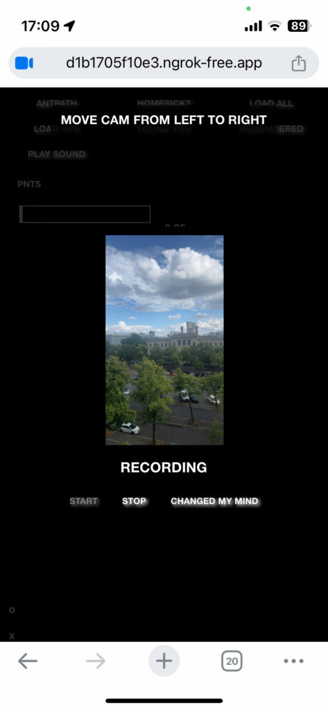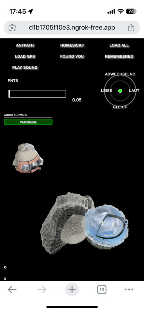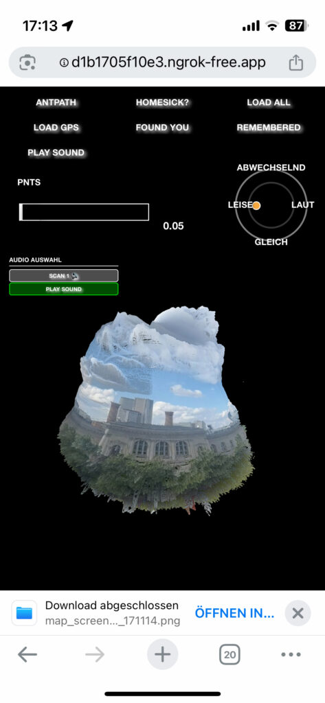 The Project ‚at a certain point‘ is a Webbrowser application that invites you to built your own map based on alternative data. User capture their enviroment with a Panorama Picture that gets transferred into a Point Cloud and placed at the users current GPS Location in a map. If your enviroment causes your Panorama to look shaky or blurry the scan in the map will do too. The Sound of the moment of recording alters the scans appearance too.
