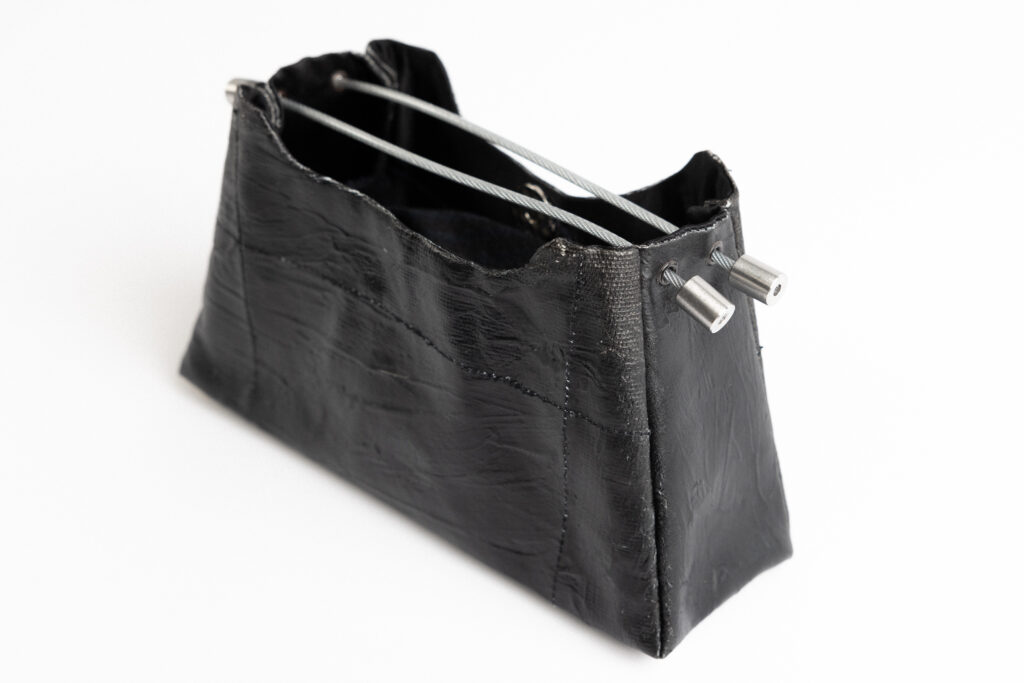 Materially, the clutch bag is made from fabric coated in two distinct layers: a flexible inner layer and a harder outer shell, like a crust. This combination allows the object to feel closed and rigid at first glance, yet to break in a controlled way and reveal its volume and usability. The layered structure gradually exposes a relationship between material, form, and user, offering a tactile experience where defacement becomes a personal point of entry.