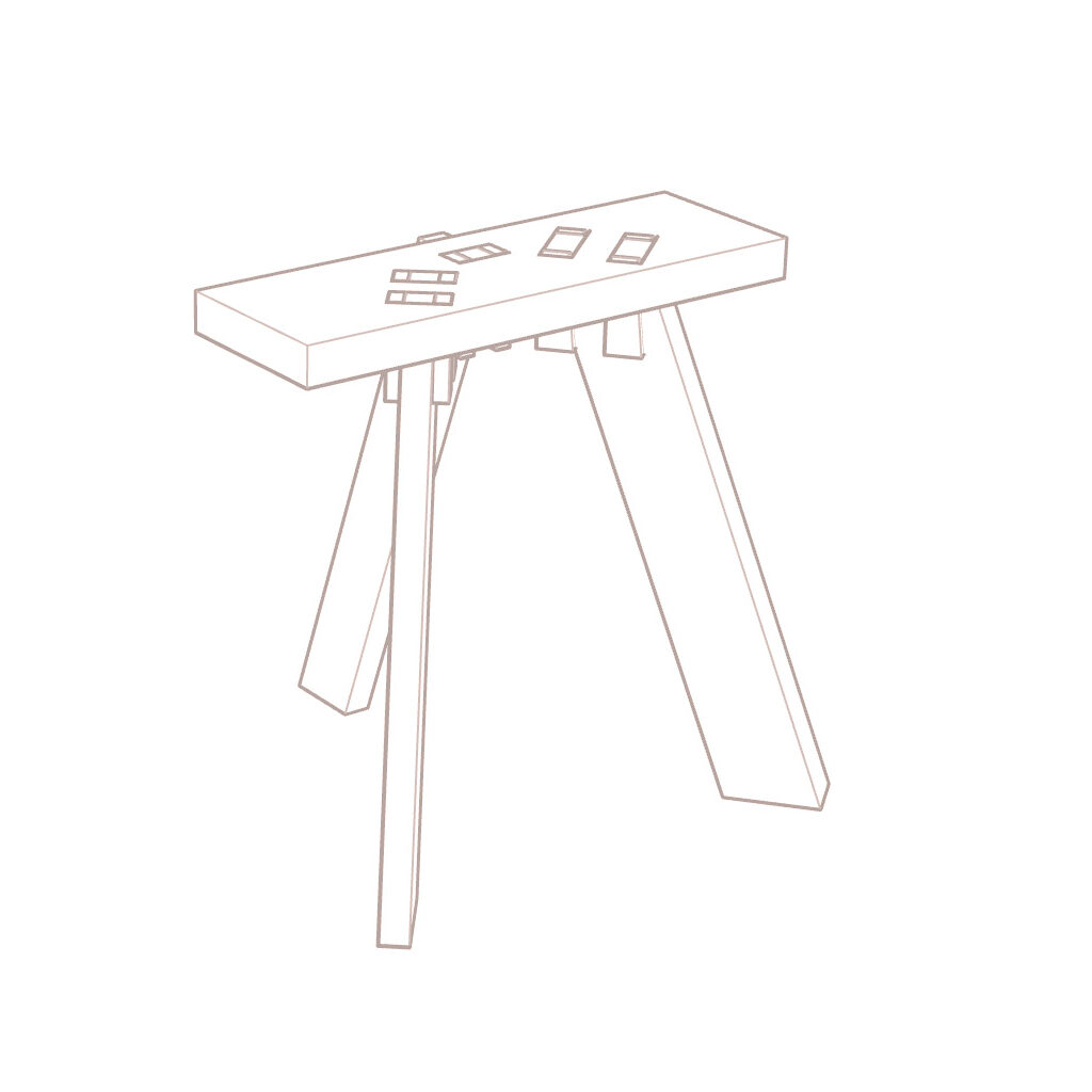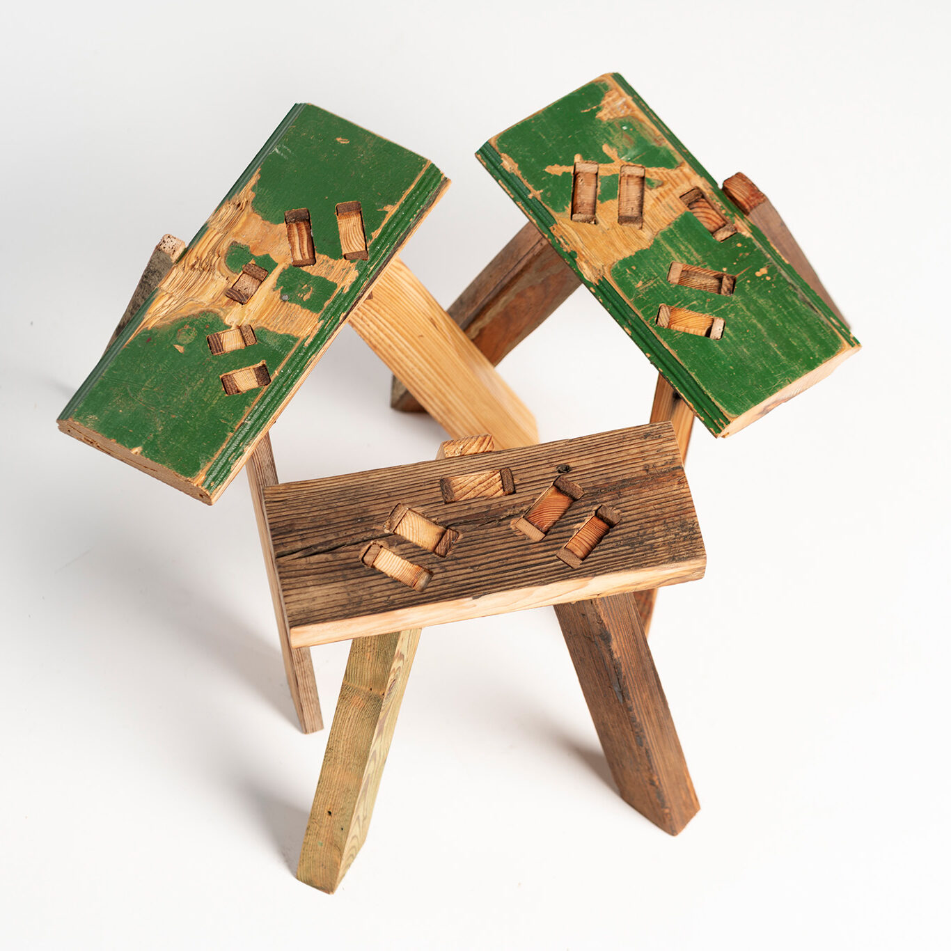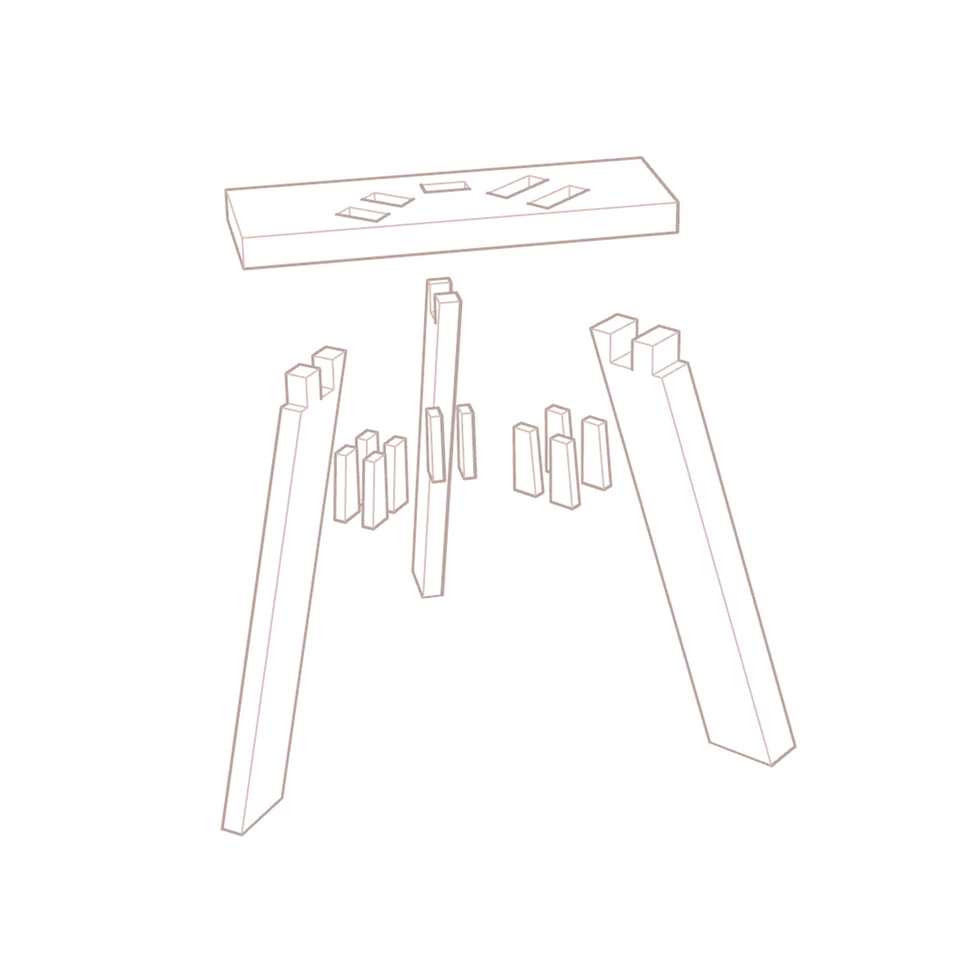 I used wedge pins that work through pressure alone, requiring no glue or screws. This allows the stools to be easily assembled, disassembled, and repaired if a part breaks. Each piece is recorded digitally, so replacement parts can be reproduced using archived templates. If the wedge pin becomes loose over time, it can be hammered deeper, sanded flat, or replaced with a larger one.