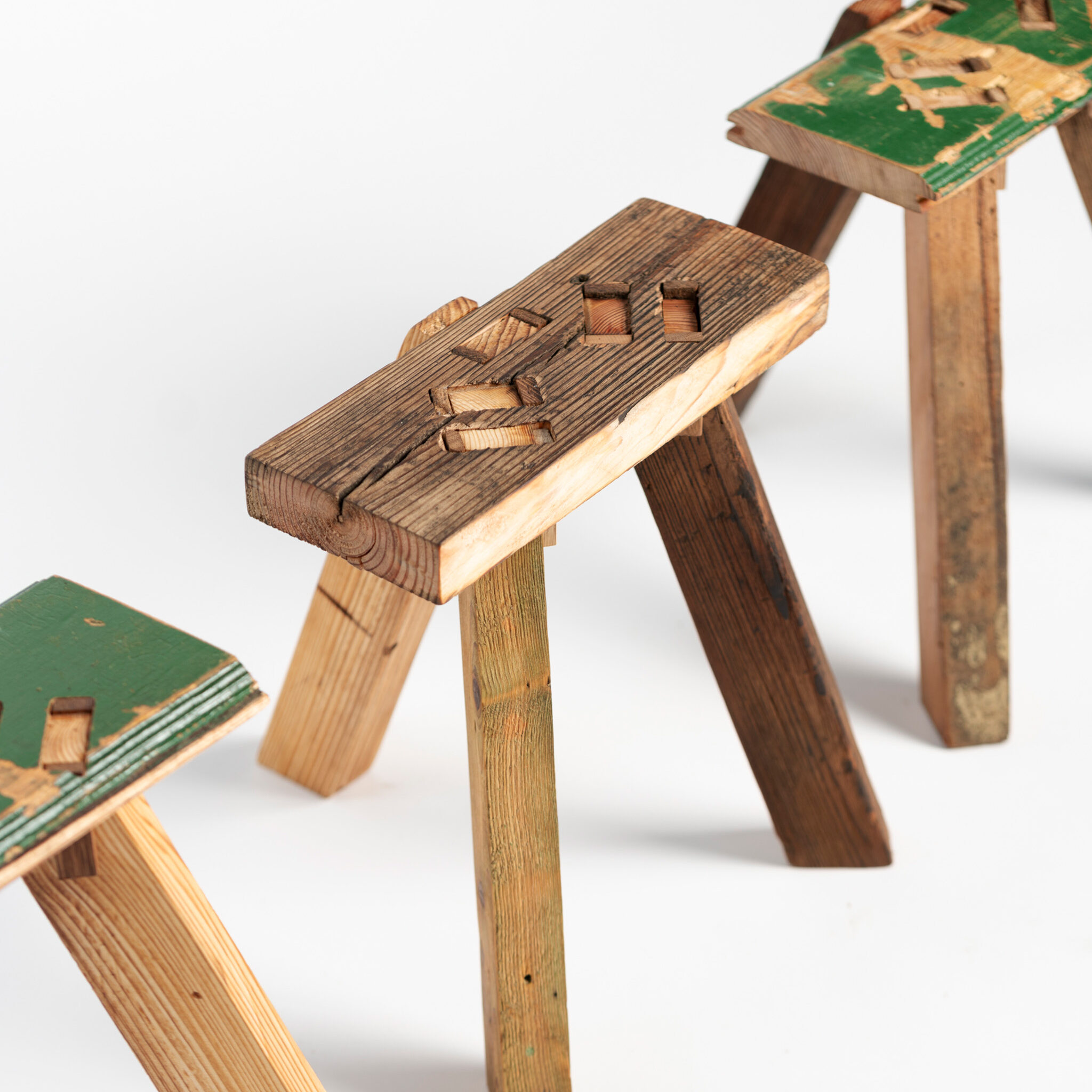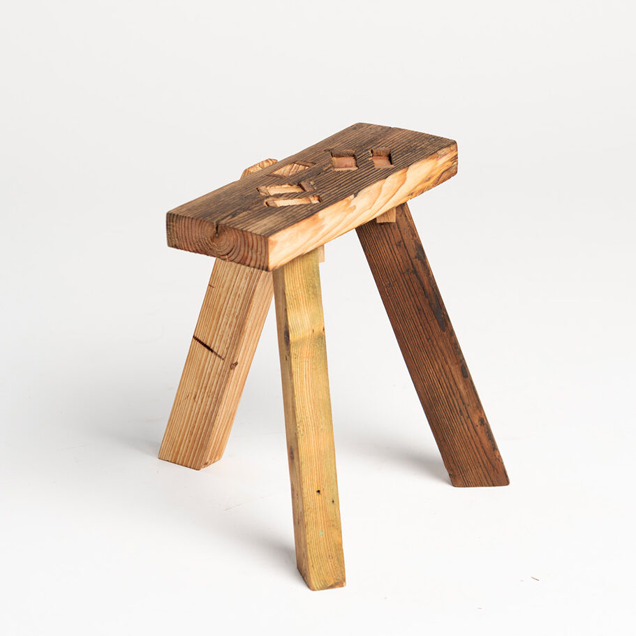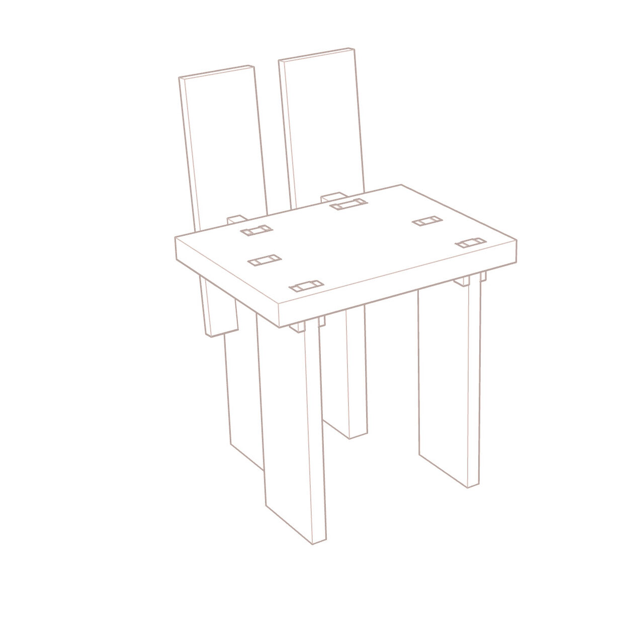 I used wedge pins that work through pressure alone, requiring no glue or screws. This allows the stools to be easily assembled, disassembled, and repaired if a part breaks. Each piece is recorded digitally, so replacement parts can be reproduced using archived templates. If the wedge pin becomes loose over time, it can be hammered deeper, sanded flat, or replaced with a larger one.