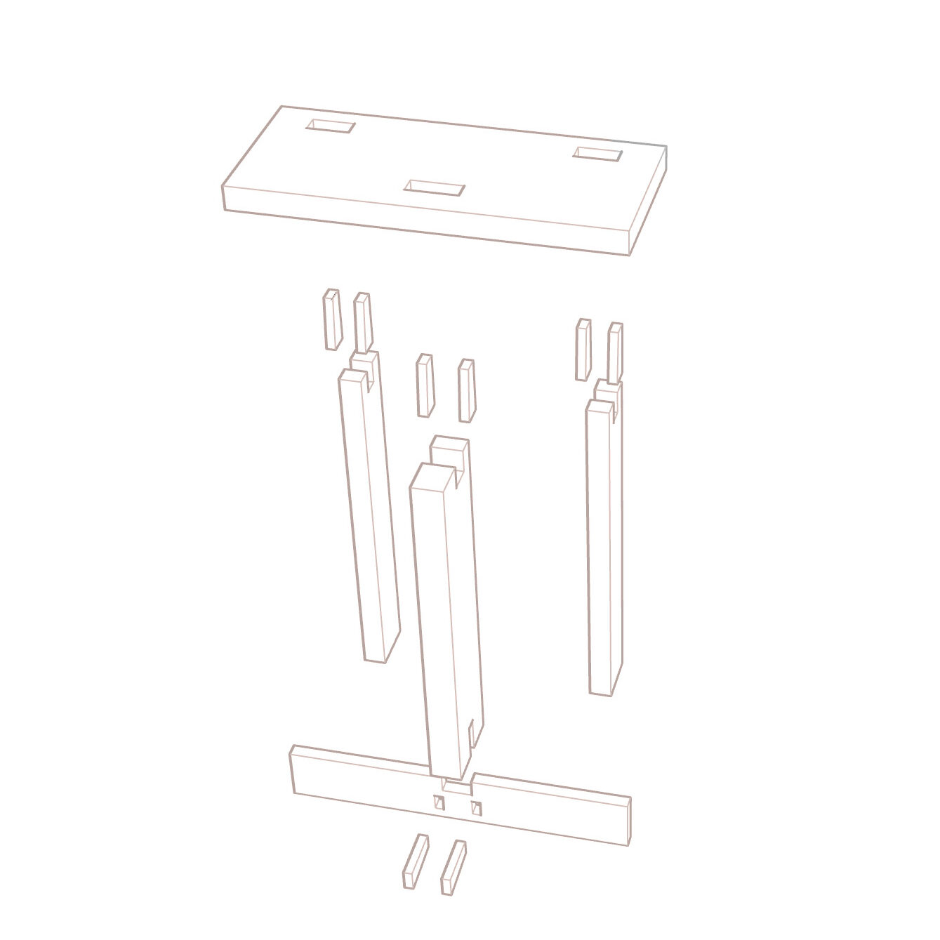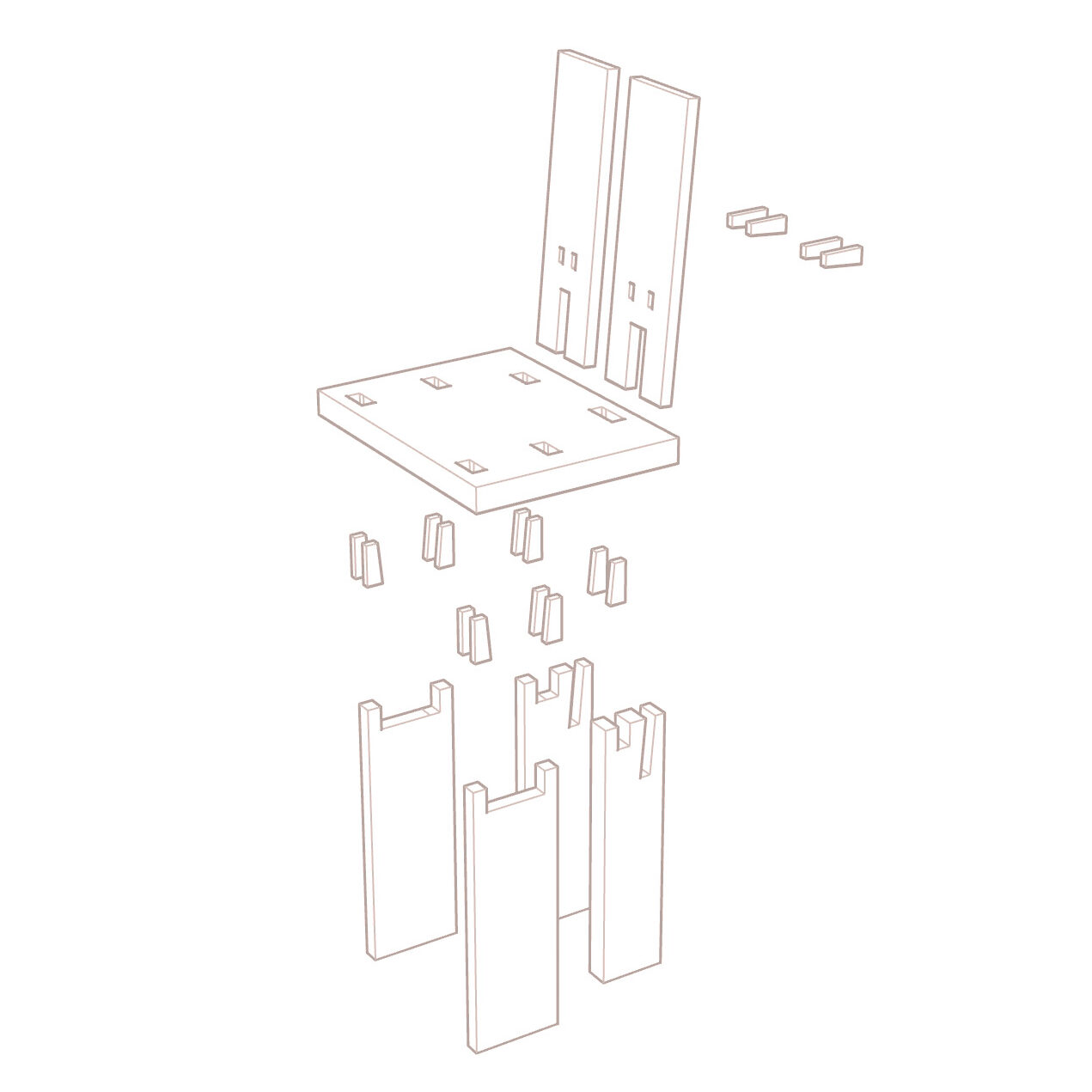 Ich habe Keilzapfen verwendet, die allein durch Druck funktionieren und keinen Leim oder Schrauben benötigen. So lassen sich die Hocker leicht zusammenbauen, zerlegen und reparieren, wenn ein Teil kaputt geht. Jedes Teil wird digital aufgezeichnet, so dass Ersatzteile anhand der archivierten Vorlagen reproduziert werden können. Wenn sich der Keilstift im Laufe der Zeit lockert, kann er tiefer gehämmert, plangeschliffen oder durch einen größeren ersetzt werden.