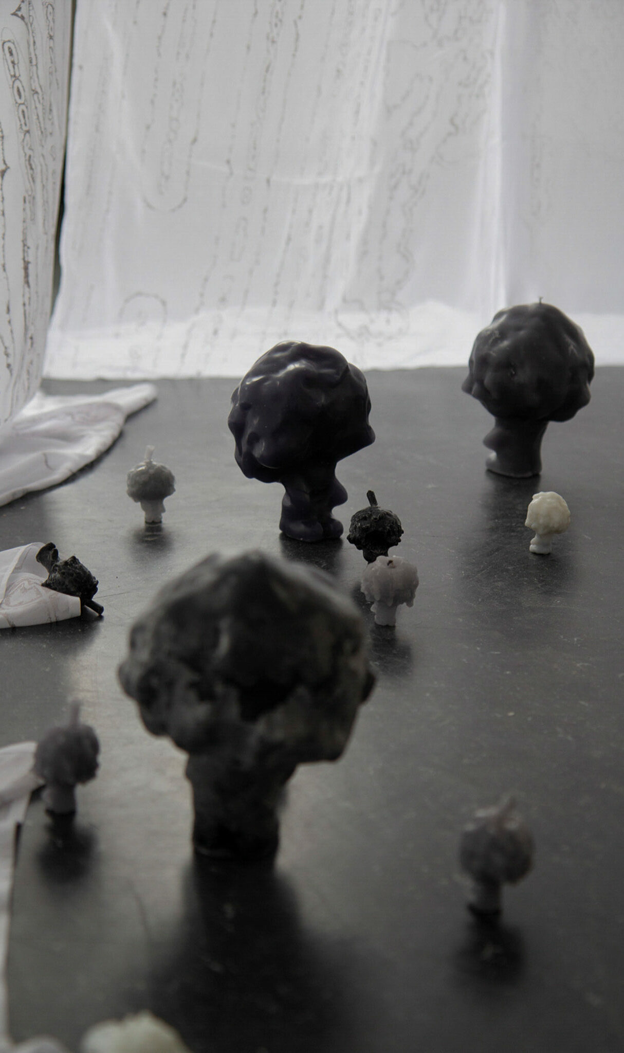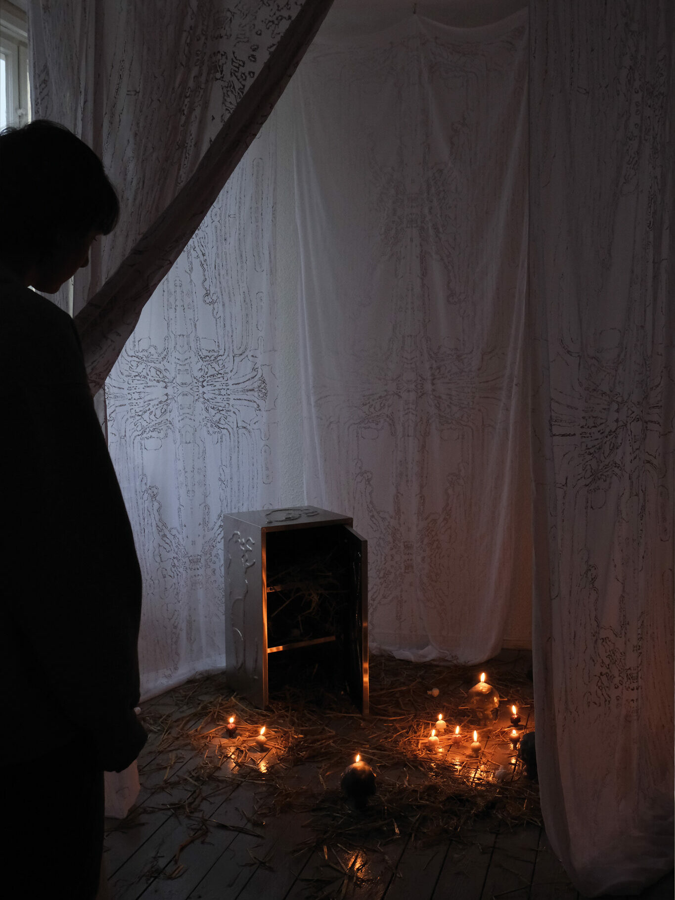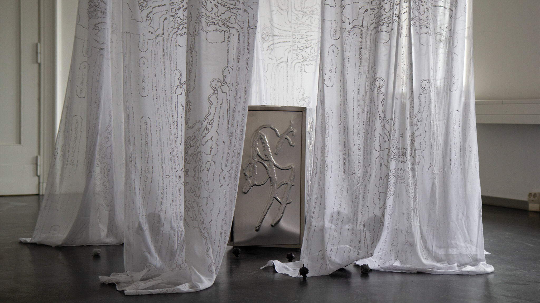 ALLE KÜHE DUCKEN SICH is a translation of dreams into patterns and physical objects. Based on the documentation of numerous dreams, a selection was visualized and abstracted. The result is a collection of collages that serve as the basis for further development into material objects. Three final objects were created from different materials such as wax, fabric and sheet aluminum: Wax figures, transparent curtains with light gray prints and a small aluminum cabinet with embossing. The process takes up the fragmentation of dreaming, which manifests itself in abstraction, lack of memory and the choice of materials during the realization. It explores how the unconscious can be translated into a tangible, physical form.