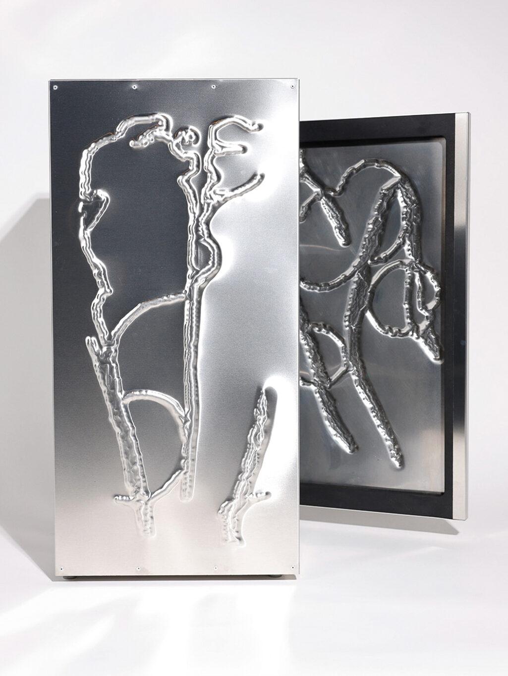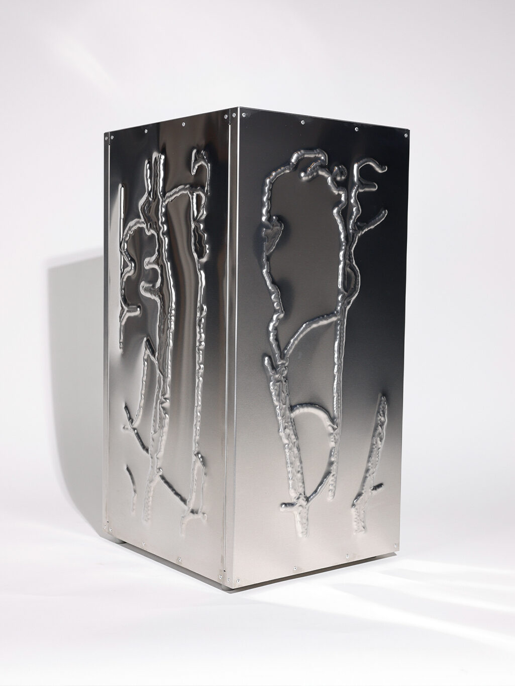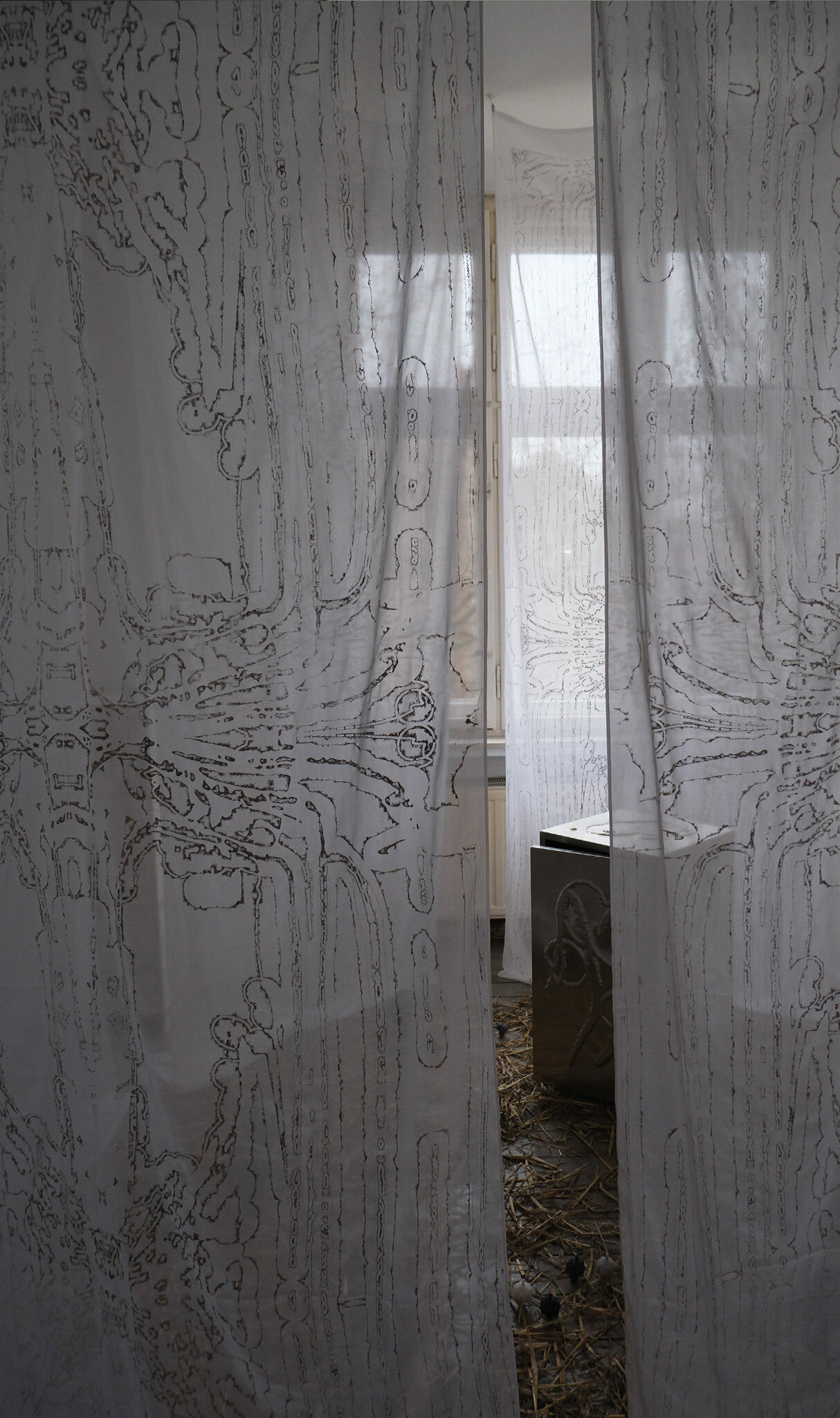 ALLE KÜHE DUCKEN SICH is a translation of dreams into patterns and physical objects. Based on the documentation of numerous dreams, a selection was visualized and abstracted. The result is a collection of collages that serve as the basis for further development into material objects. Three final objects were created from different materials such as wax, fabric and sheet aluminum: Wax figures, transparent curtains with light gray prints and a small aluminum cabinet with embossing. The process takes up the fragmentation of dreaming, which manifests itself in abstraction, lack of memory and the choice of materials during the realization. It explores how the unconscious can be translated into a tangible, physical form.