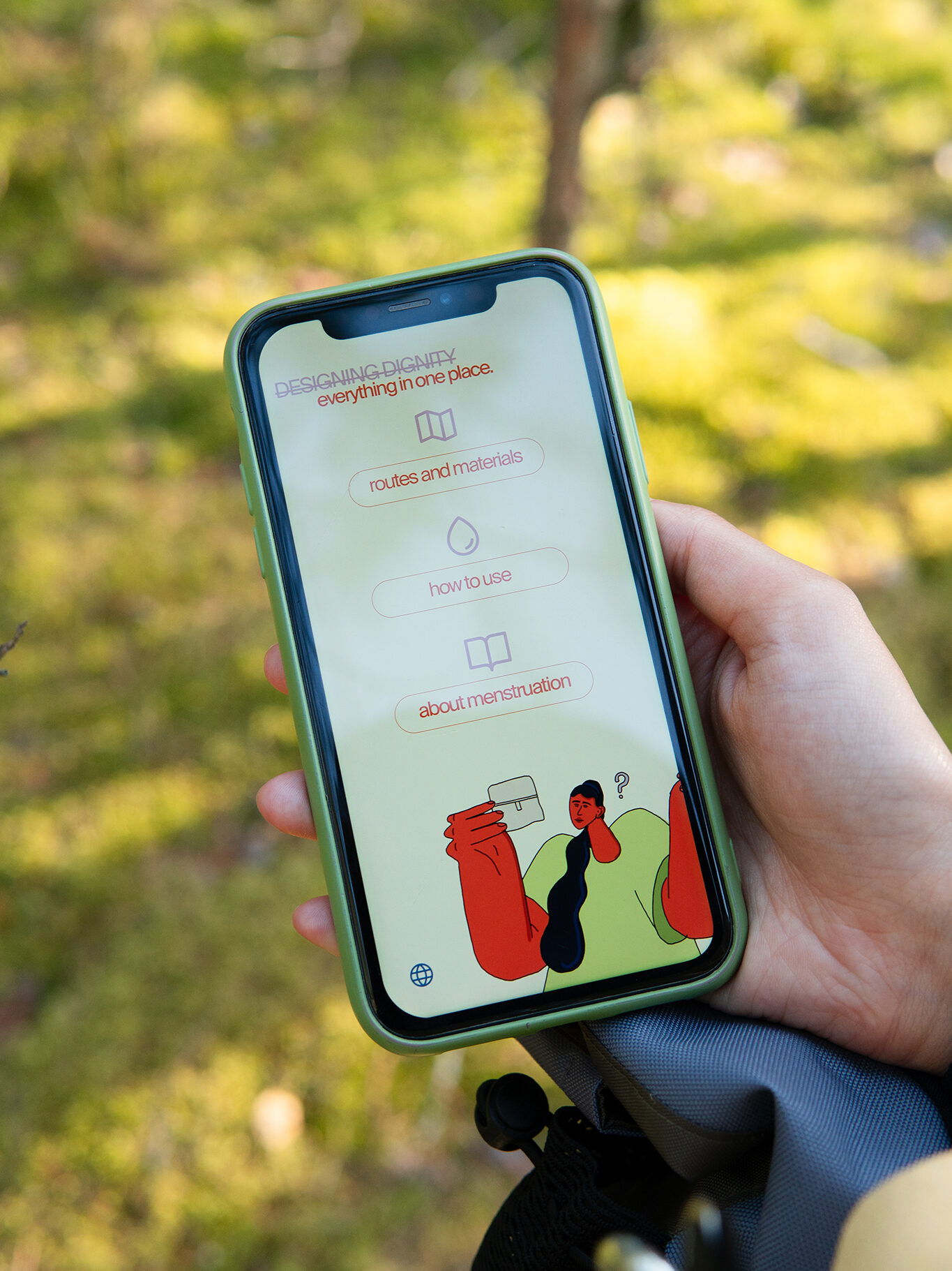 It combines a versatile sanitary pad, a specially designed cleaning bag, a sturdy organisation bag and an accompanying app with instructions, maps and information.