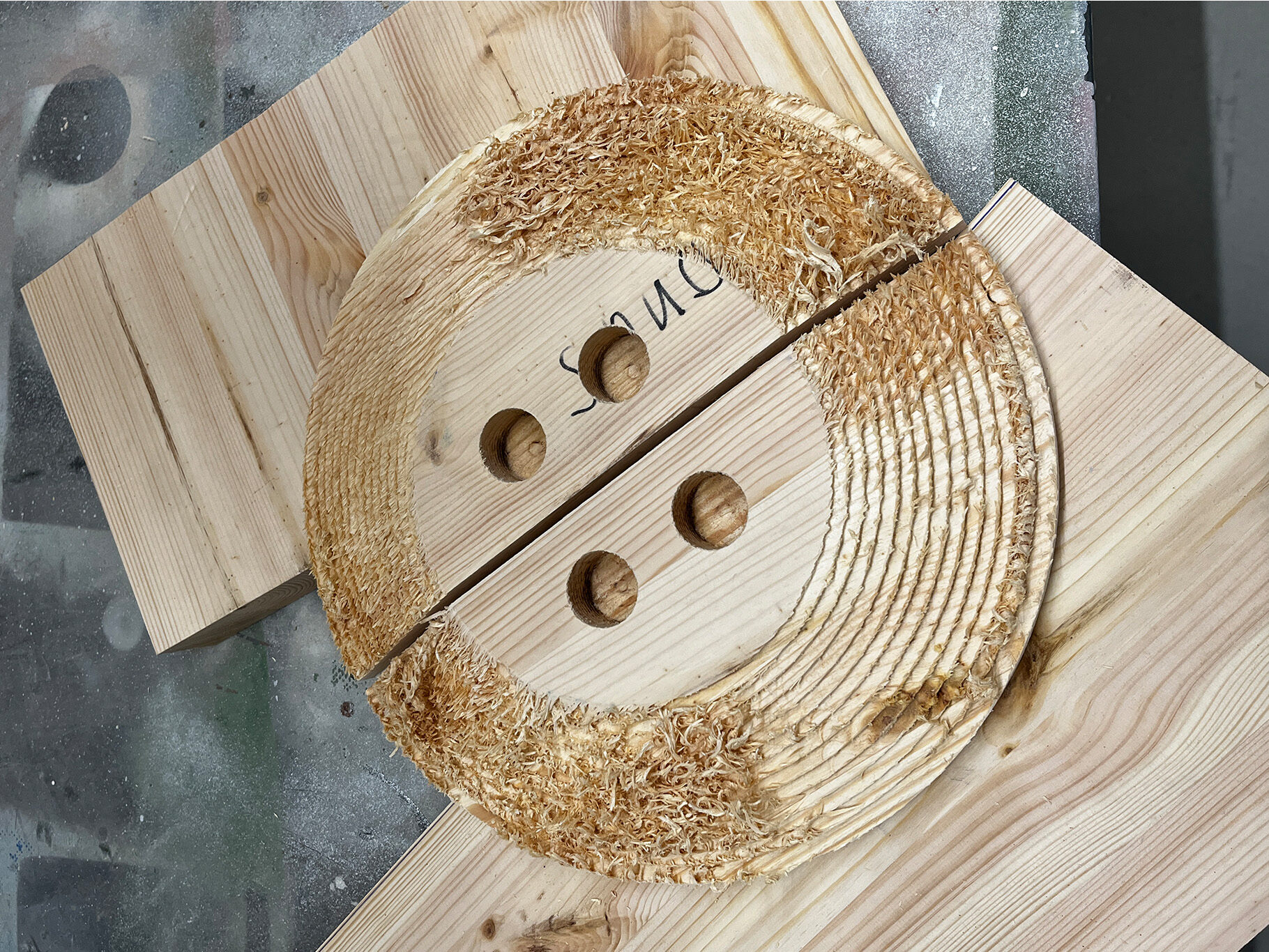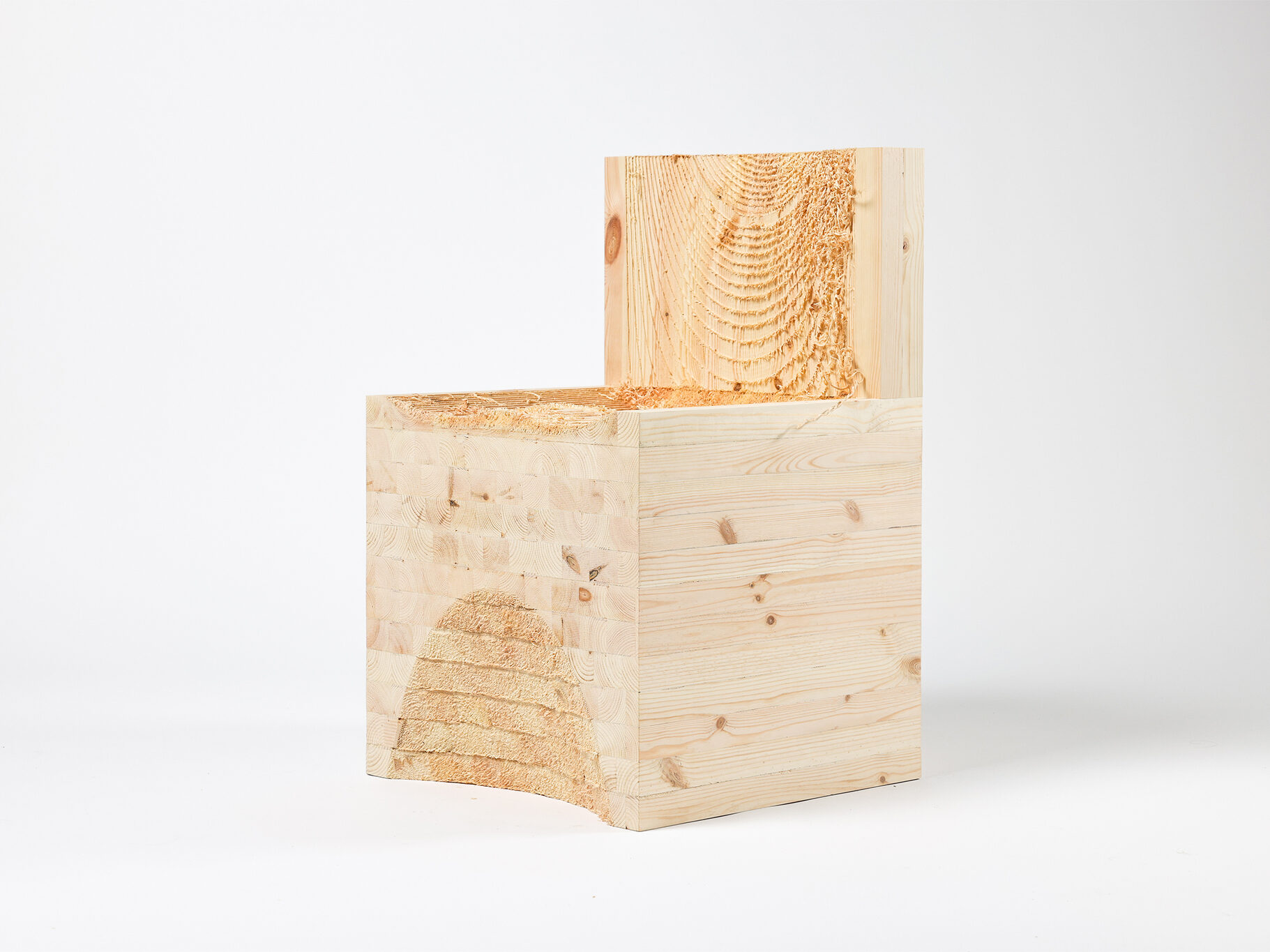 Instead of creating perfect, interchangeable surfaces, it uses the specific qualities of CNC milling to make the manufacturing process visible. The usual finishing step i s omitted, leaving a fringed texture of roughly milled spruce wood. The result is three objects: a sideboard with large surfaces and tactile handles, a side table with a wave shaped base, and a chair whose functional areas intentionally remain imperfect. This creates a new aesthetic that challenges expectations of perfect, industrially produced objects.