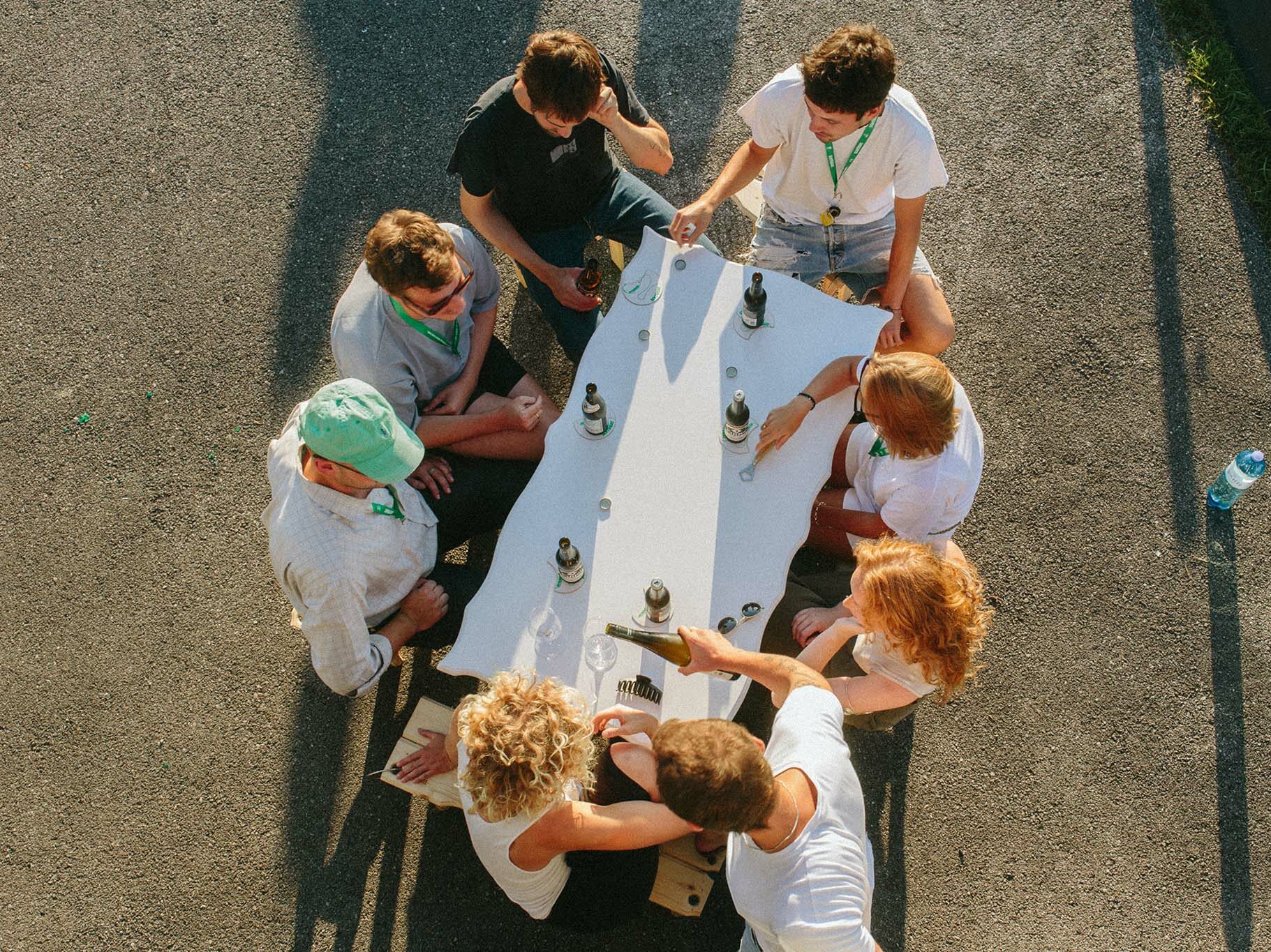 benches, stools, and tables can be flexibly combined to enable different scenarios for sitting together. The “Dazuhock-Botschaft” (sit-down message)