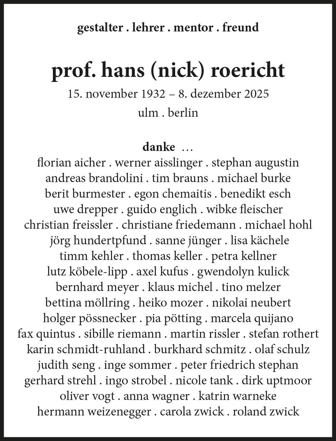 Hans (Nick) Roericht ist am 8. Dezember 2025 verstorben. Mit ihm verliert die Designwelt einen der klarsten Denker des 20. Jahrhunderts – einen Gestalter, Lehrer und Mentor, der Gestaltung stets als gesellschaftliche Aufgabe verstand.