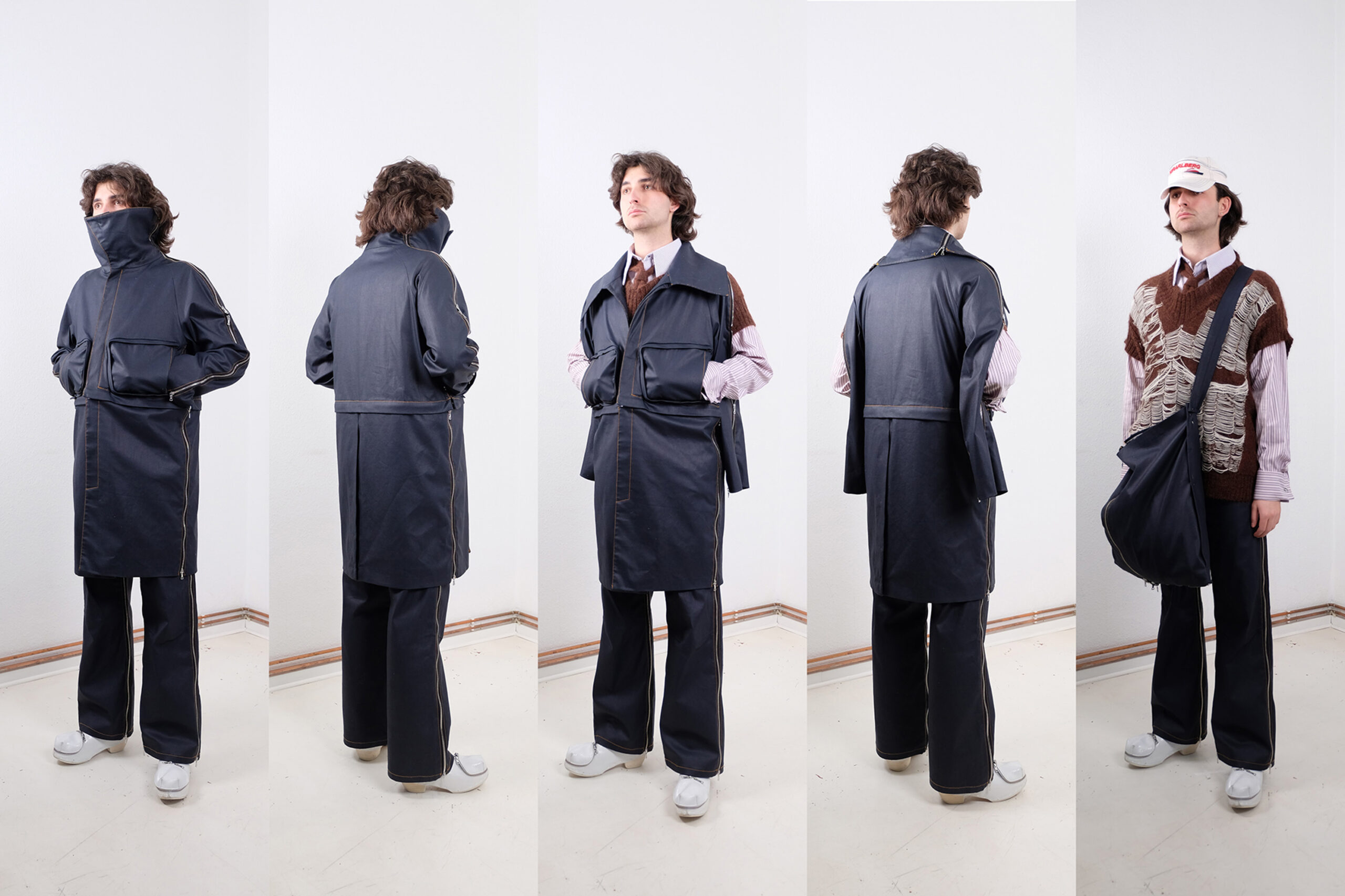 New material, technical and functional solutions are combined with the old design language to facilitate our everyday life in a sustainable way. The combination of opposites creates an intergenerational aesthetic. Practicality is always in the foreground, created by multi-use and combinability. Hybrid shapes are created to combine accessories with clothing. The focus is on detailed craftmanship and selection of shapes and fabrics.