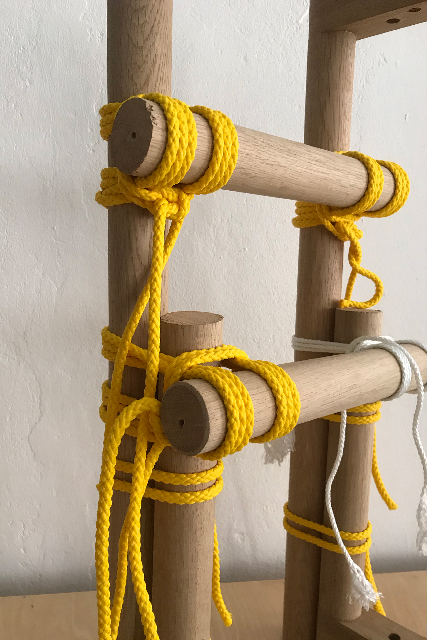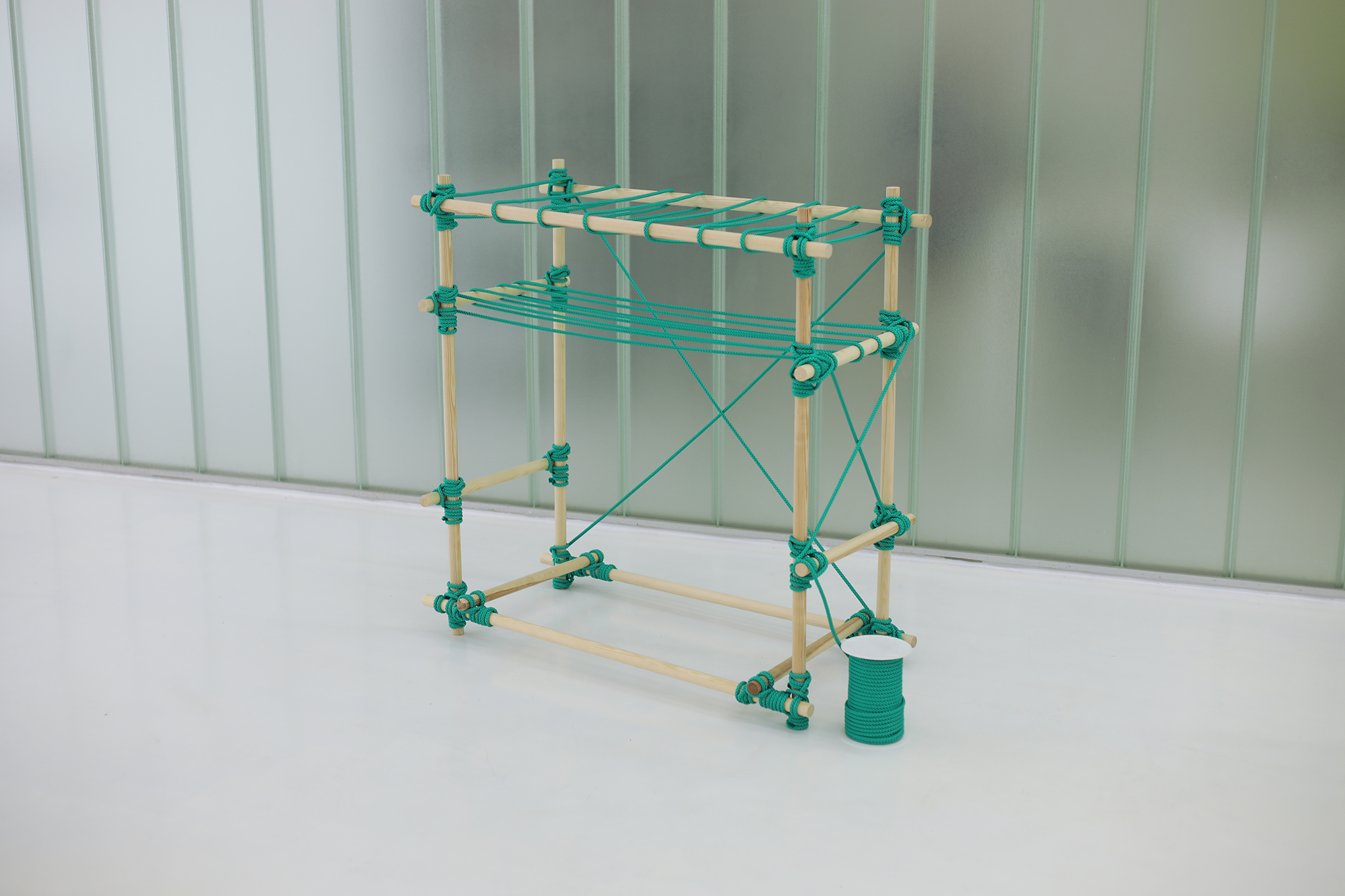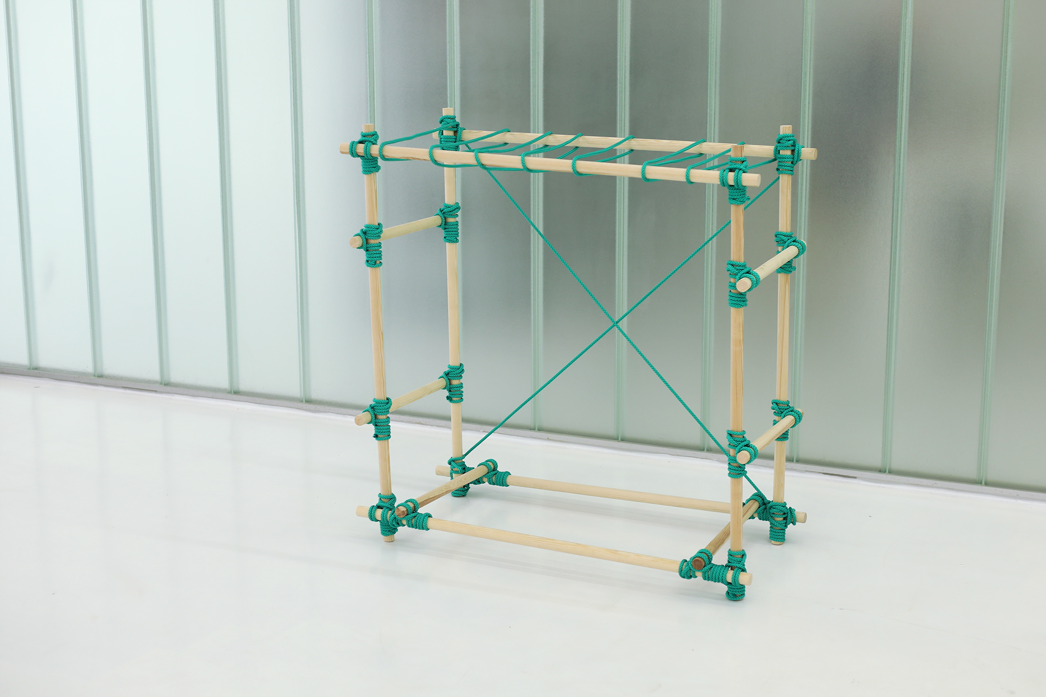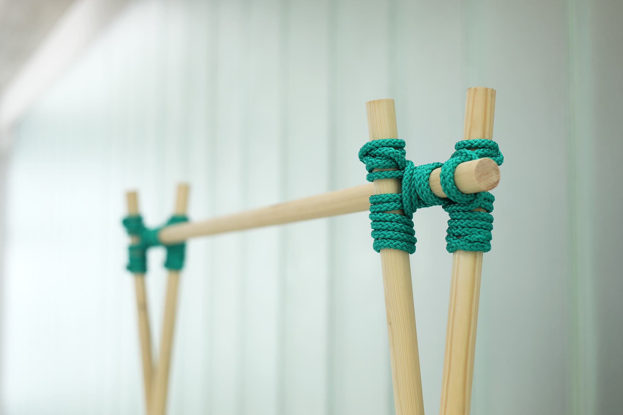 With KNOTTY different constructions can be built using just your hands and the use of very simple tools. The bars were bought at the right length or cut to size with a saw and tied with the rope. A rolling hitch and a square lashing hold the bars together. For its aesthetic, it takes inspiration from bondage – an erotic play from fetish subcultures that ties people for movement restriction. While binding the pieces of wood, KNOTTY become bondage for furniture – be it as a table, shelf, clothes rail or shoe rack.