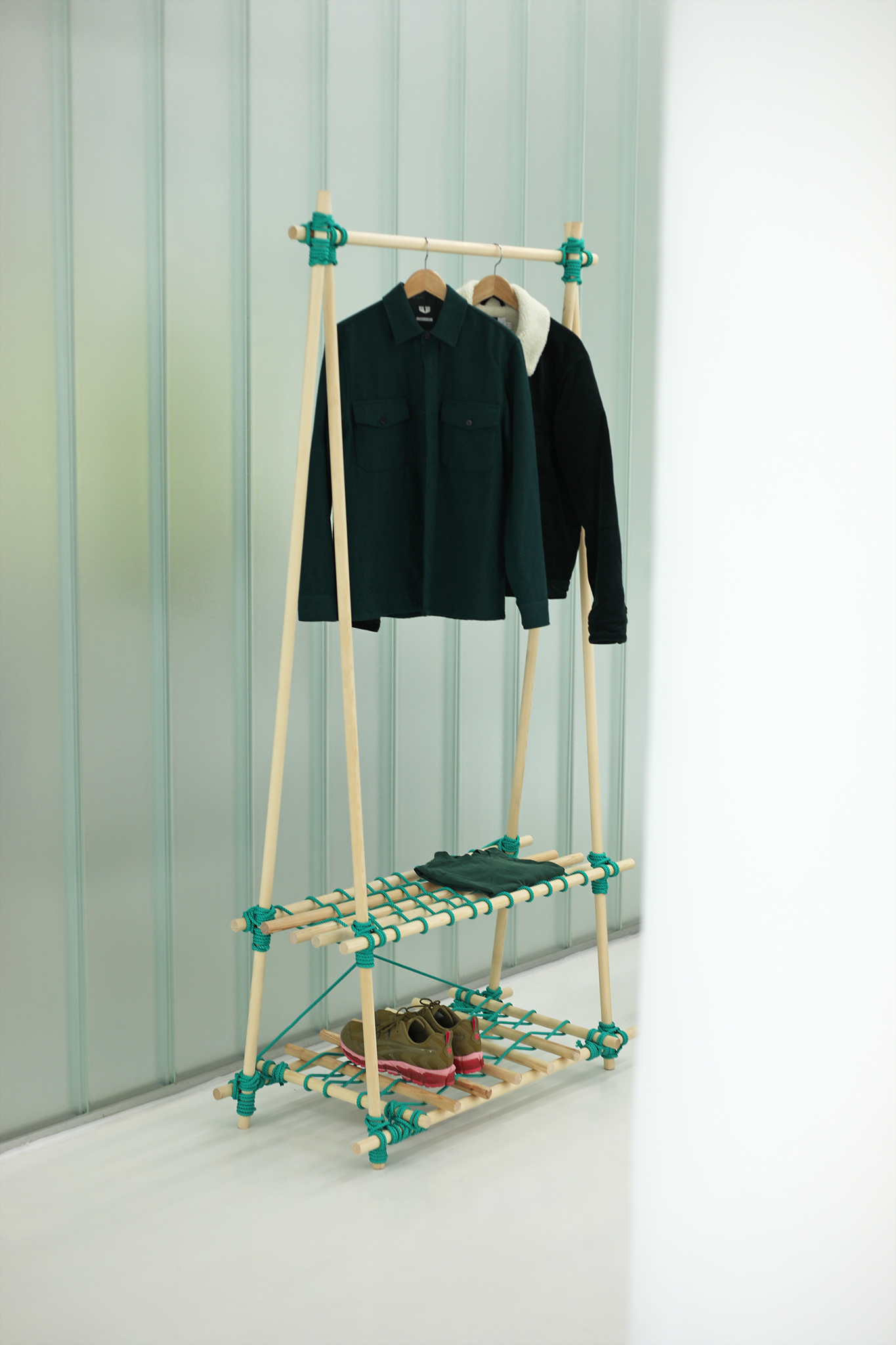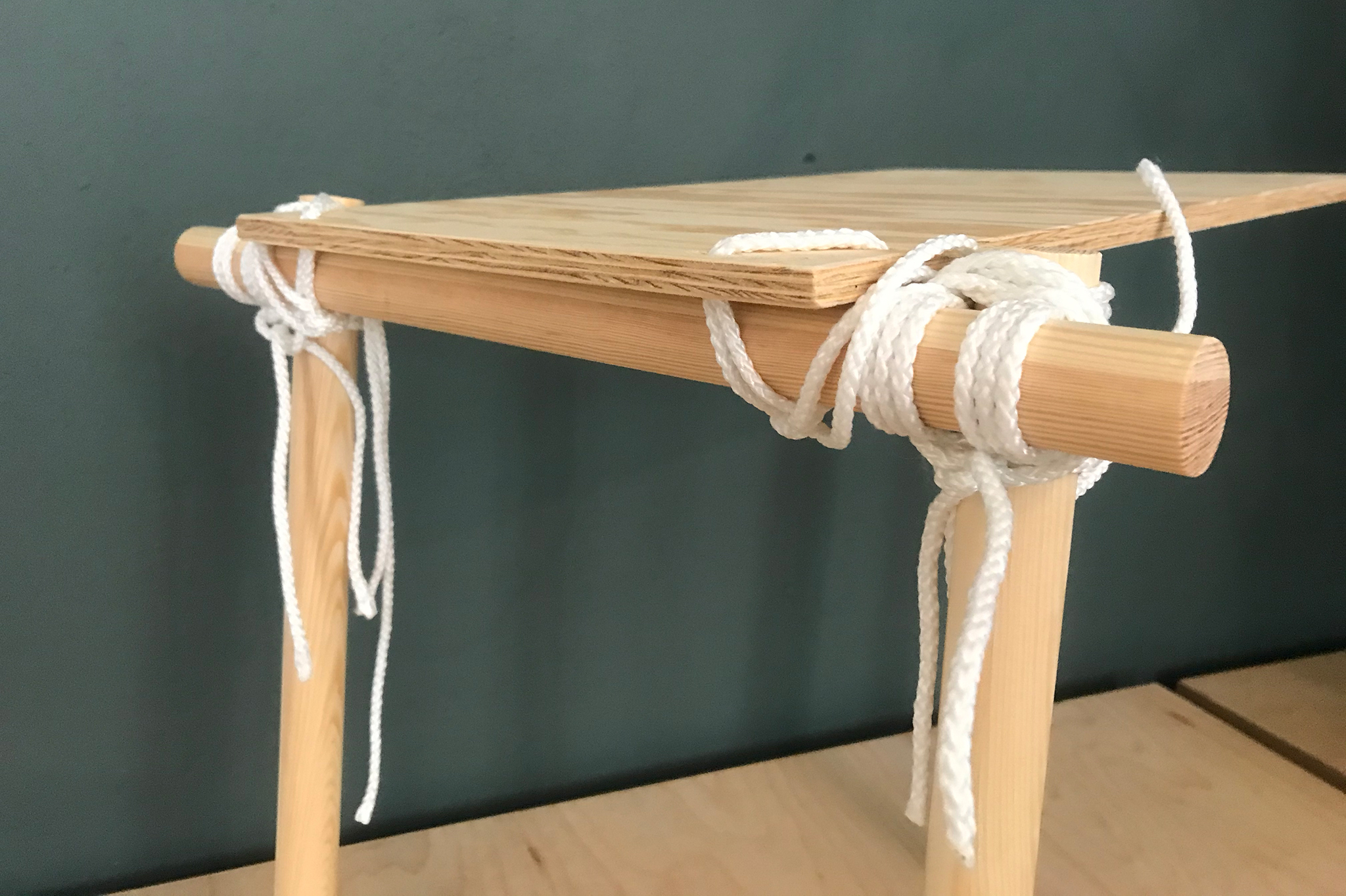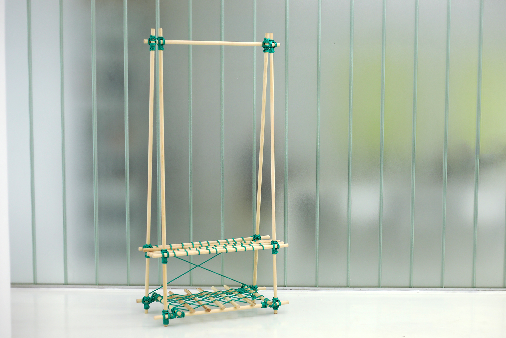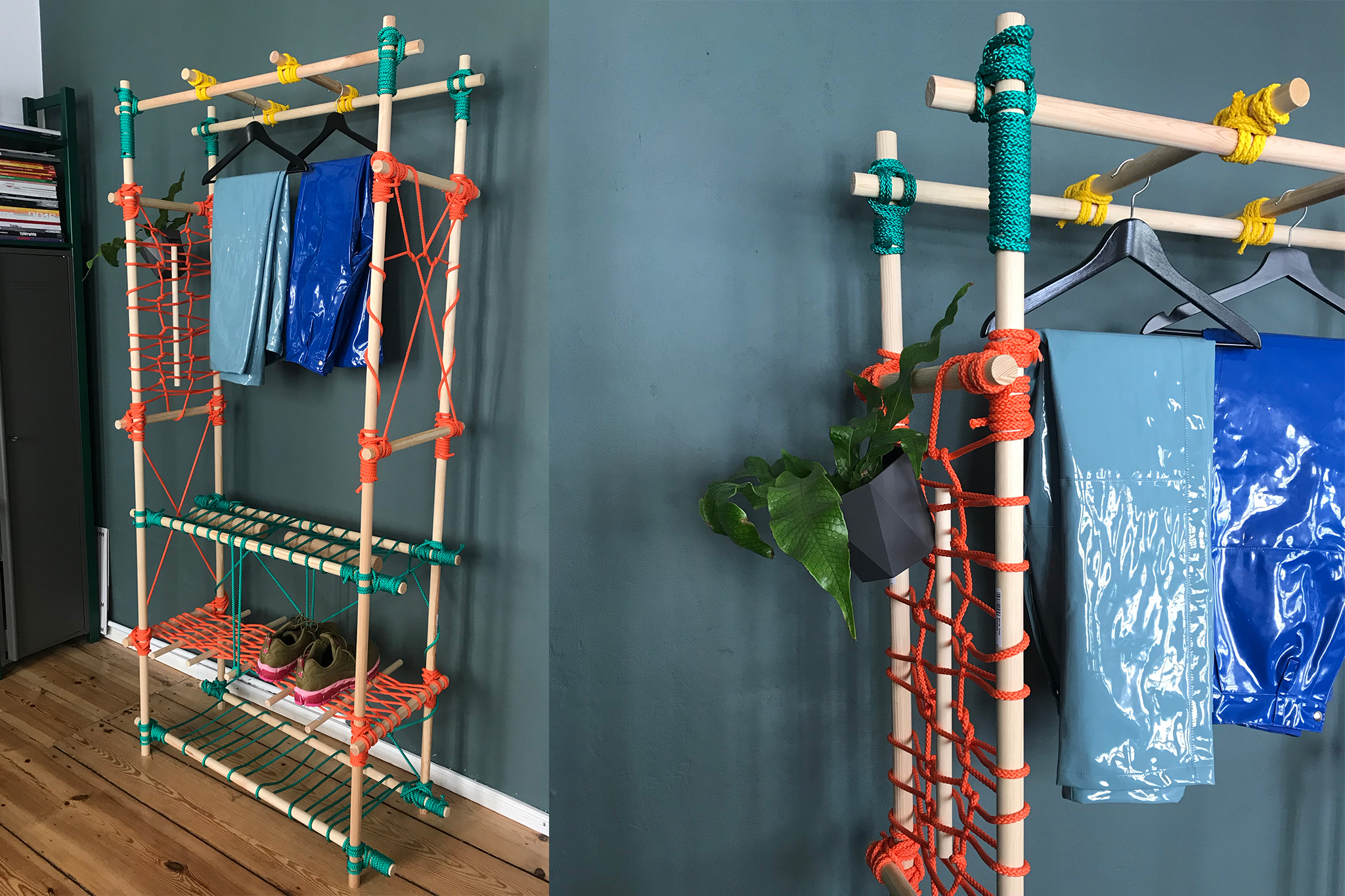 With KNOTTY different constructions can be built using just your hands and the use of very simple tools. The bars were bought at the right length or cut to size with a saw and tied with the rope. A rolling hitch and a square lashing hold the bars together. For its aesthetic, it takes inspiration from bondage – an erotic play from fetish subcultures that ties people for movement restriction. While binding the pieces of wood, KNOTTY become bondage for furniture – be it as a table, shelf, clothes rail or shoe rack.