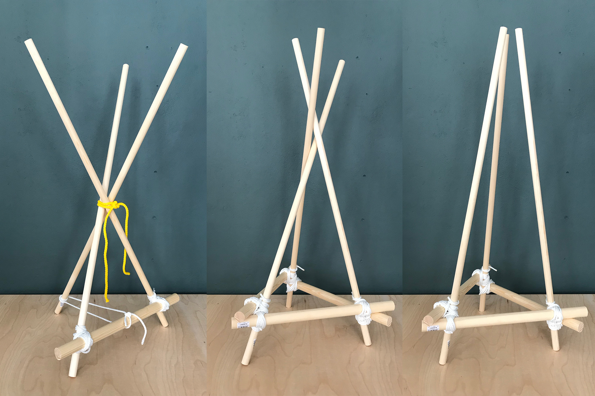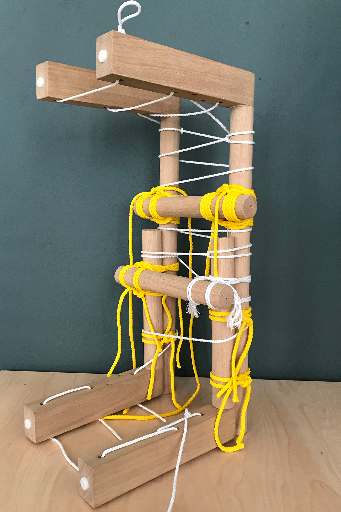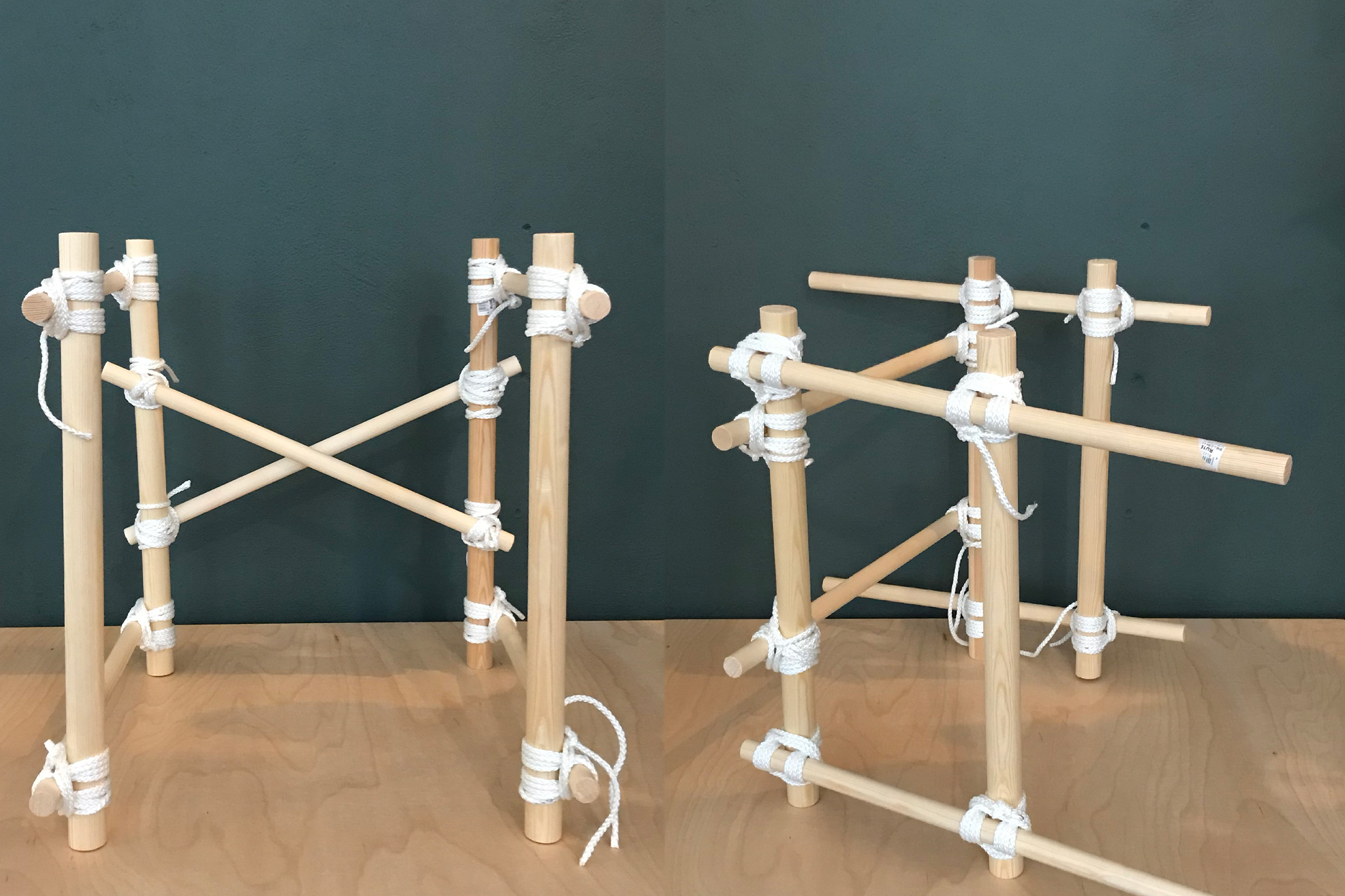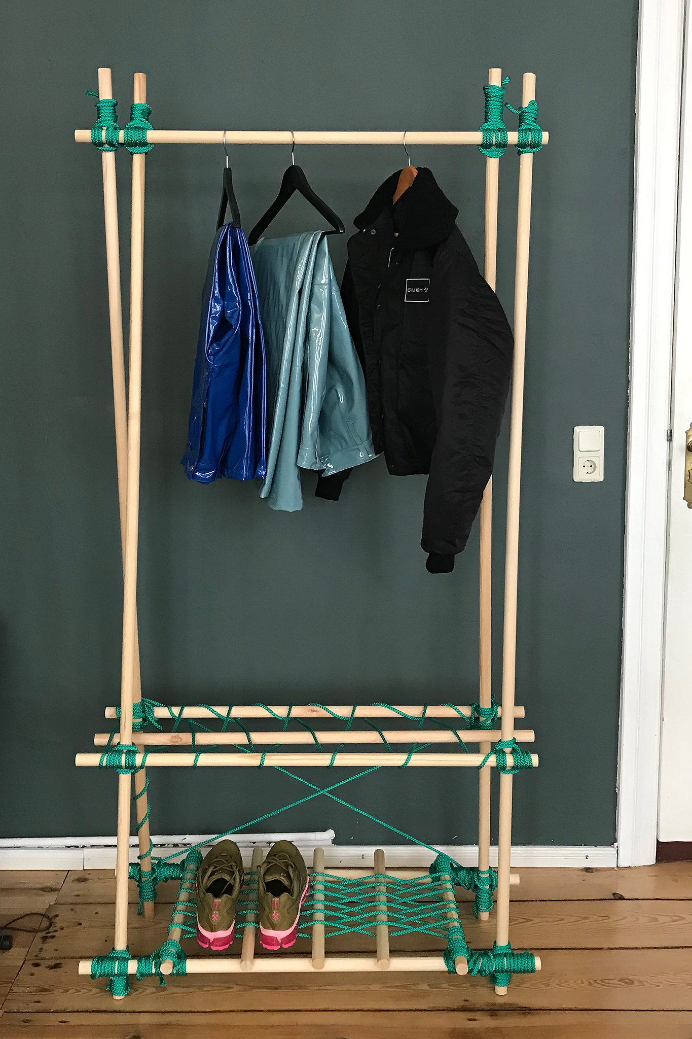 With KNOTTY different constructions can be built using just your hands and the use of very simple tools. The bars were bought at the right length or cut to size with a saw and tied with the rope. A rolling hitch and a square lashing hold the bars together. For its aesthetic, it takes inspiration from bondage – an erotic play from fetish subcultures that ties people for movement restriction. While binding the pieces of wood, KNOTTY become bondage for furniture – be it as a table, shelf, clothes rail or shoe rack.