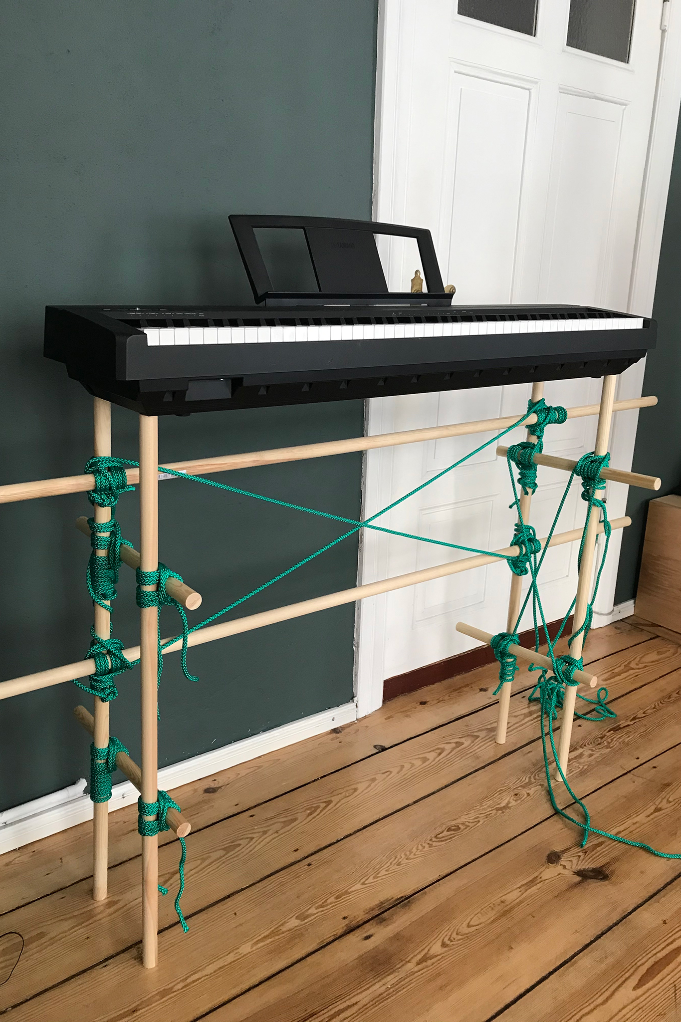 Mit KNOTTY können verschiedene Konstruktionen mit Handarbeit und sehr einfachen Werkzeugen gebaut werden. Die Stäbe werden in der richtigen Länge gekauft oder mit einer Säge zugeschnitten und mit dem Seil zusammengebunden. Ein Stopperstek und ein Kreuzbund halten die Stäbe zusammen. Für seine Ästhetik ist es vom Bondage inspiriert – einem erotischen Spiel aus Fetisch-Subkulturen, indem Menschen für Bewegungseinschränkungen eingebunden werden. Beim Binden der Holzstäbe wird KNOTTY zum Bondage für Möbel – sei es als Tisch, Regal, Kleiderstange oder Schuhregal.