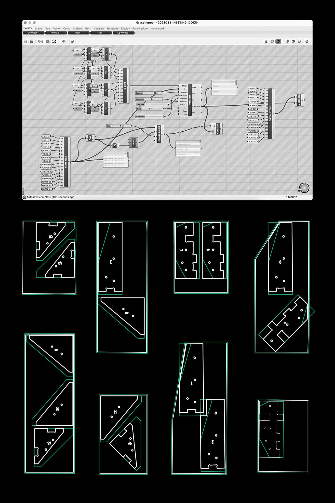Therefore, this project shows an attempt, to enable the use of waste and off-cut panels for serial furniture production. For this purpose a digital system was developed which allows the handling of different board thicknesses and formats. The exemplary piece of furniture was not designed in 3D, but programmed with the help of Rhino-Grasshopper. The parametrics made possible by this allow the individual furniture parts to adapt to each other, depending on the panel thickness. A modified nesting algorithm allows the use of non-rectangular remnant panels.
