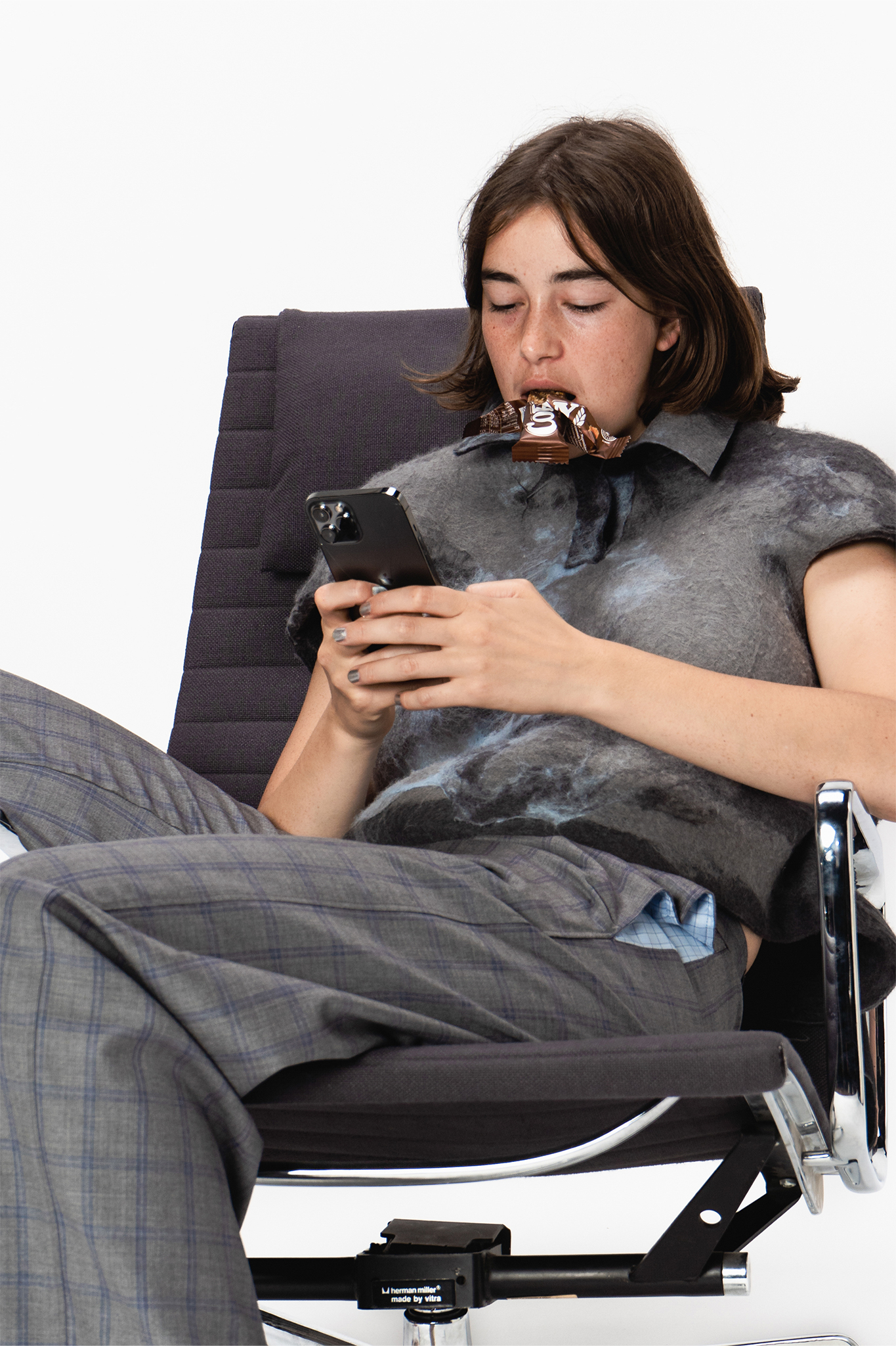The era of “girl bosses” is over – now only #girlresting #girllayingdown. I’m not about shining winners, I’m about all those who get through. It’s okay not to like your job. It’s okay to keep it anyway because it finances you. It’s okay if life happens after work. It’s okay if things don’t go optimally #quietquitting. Optimizing is over – maintenance is in. Reference points in my research are female passing bodies laying down, sitting, lolling. I process these positions in my pattern development as well as in sculptural moldings from hand-made felt.