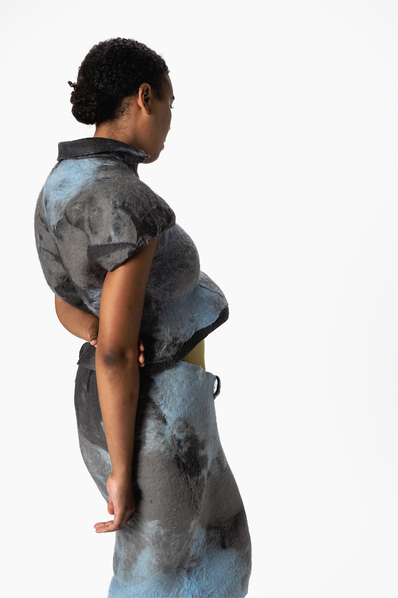 Die Ära der „girlbosse“ ist zugrunde gegangen – now only #girlresting #girllayingdown. Es geht mir nicht um strahlende Gewinner*innen, sondern um all die, die durch kommen. Es ist okay, deinen Job nicht zu mögen. Es ist okay, ihn trotzdem zu behalten, weil er dich finanziert. Es ist okay, wenn das Leben nach Arbeit stattfindet. Es ist okay, wenn es nicht optimal läuft #quietquitting. Optimizing is over – maintenance is in. Referenzpunkte in meiner Recherche sind weiblich gelesene Körper, die liegen, sitzen fläzen. Diese Positionen verarbeite ich sowohl in meiner Schnittentwicklung als auch in skulpturalen Abformungen aus handgemachten Filz.