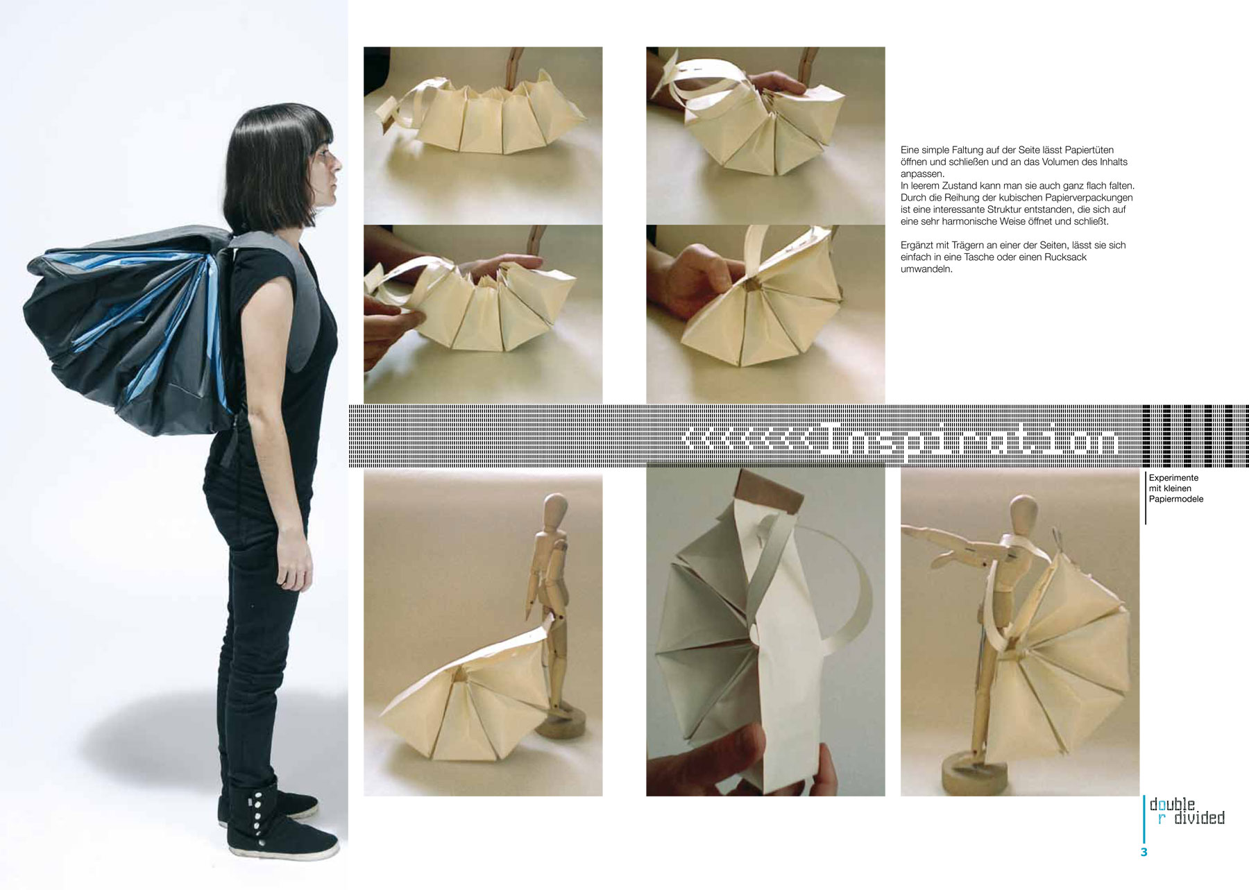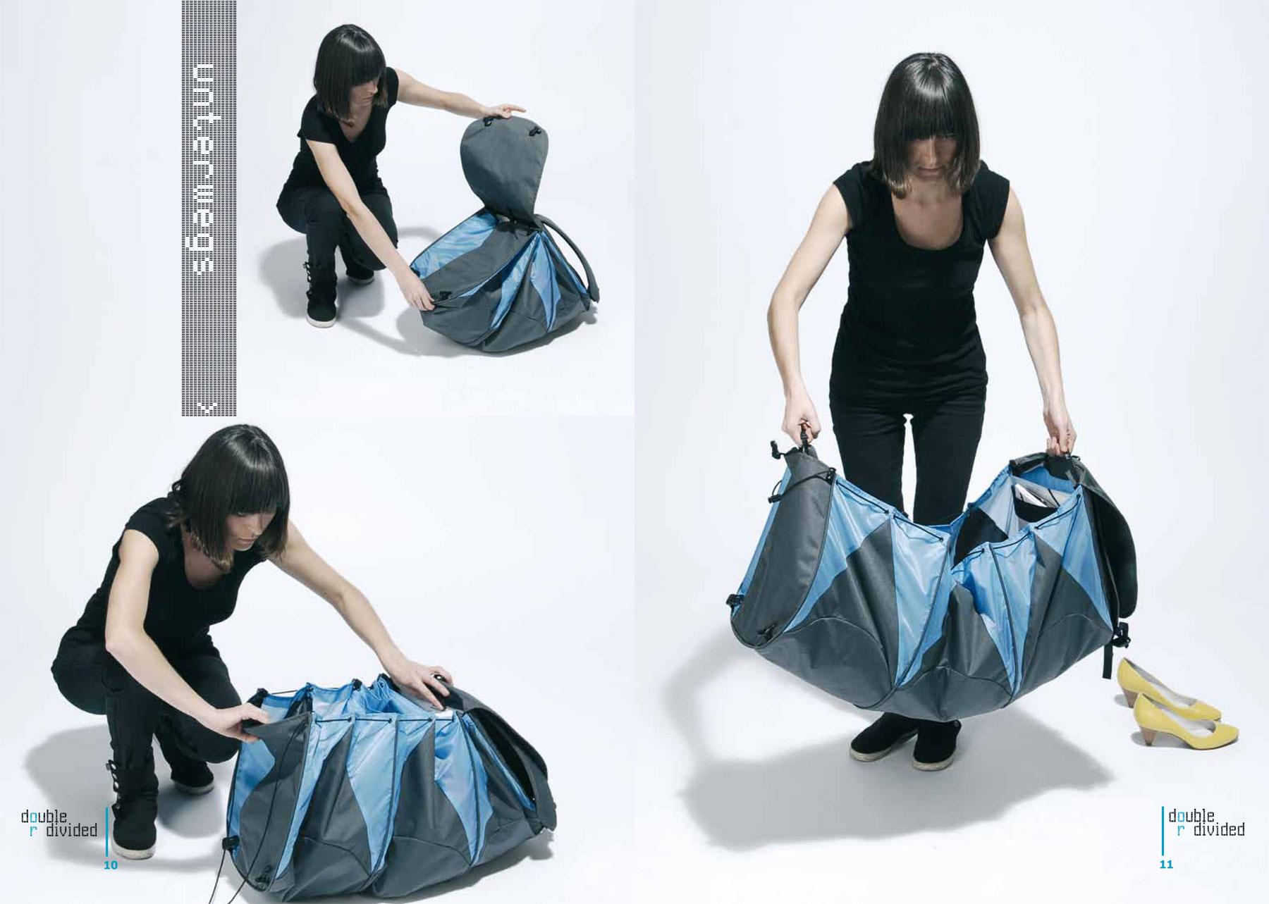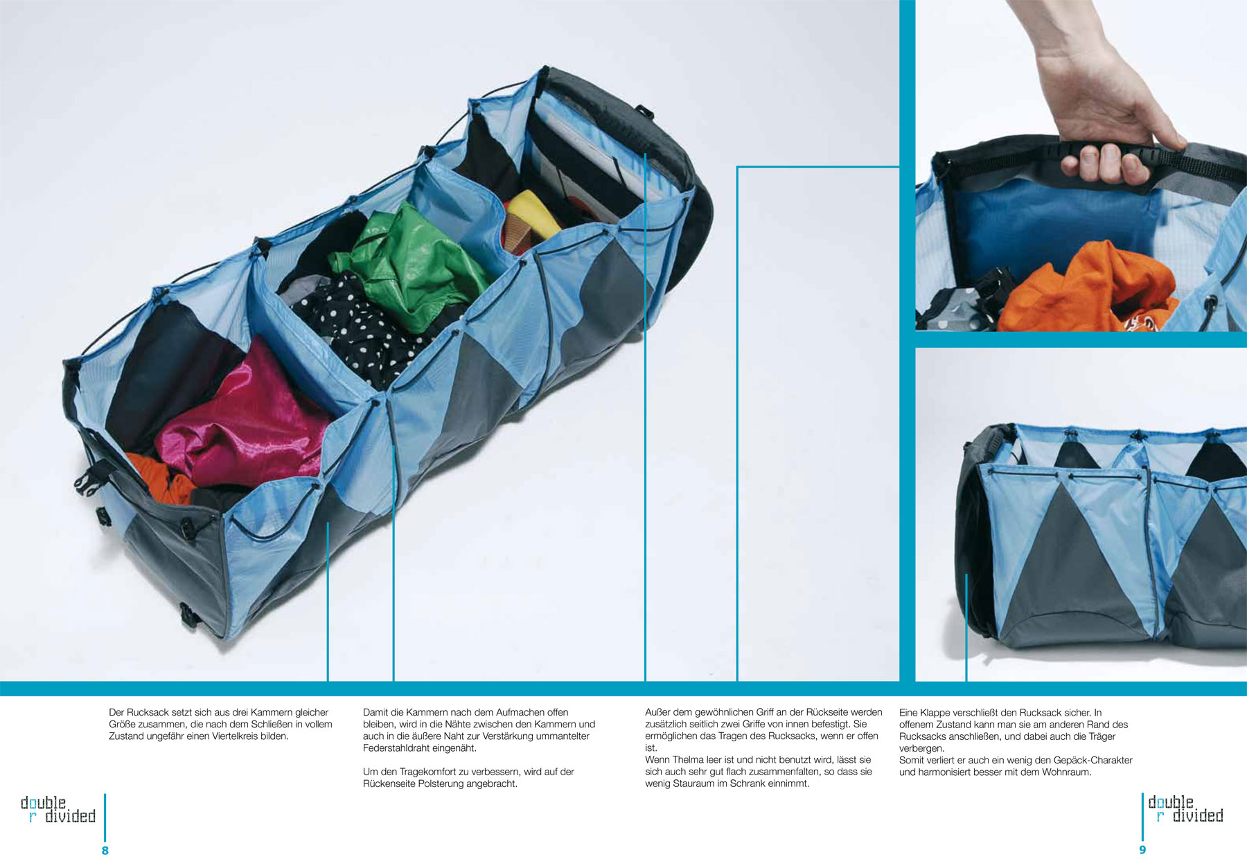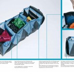 Telma ist ein Rucksack, der den Schrank auf Reisen ersetzt. In einer einfachen Bewegung falten sich die Taschen des Rucksacks so aus, dass der Nutzer bequem und schnell hineingreifen kann. Die Unterteilung in drei gleich große Kammern lässt die Sachen sortieren, so dass benutzte Kleidung nicht mit der sauberen durcheinander kommt. Eine Schnur, die durch die Seitenwände aller Kammern läuft sorgt dafür, dass das schlangenförmige Gebilde schnell zu einem kompakten Rucksack verwandelt werden kann.