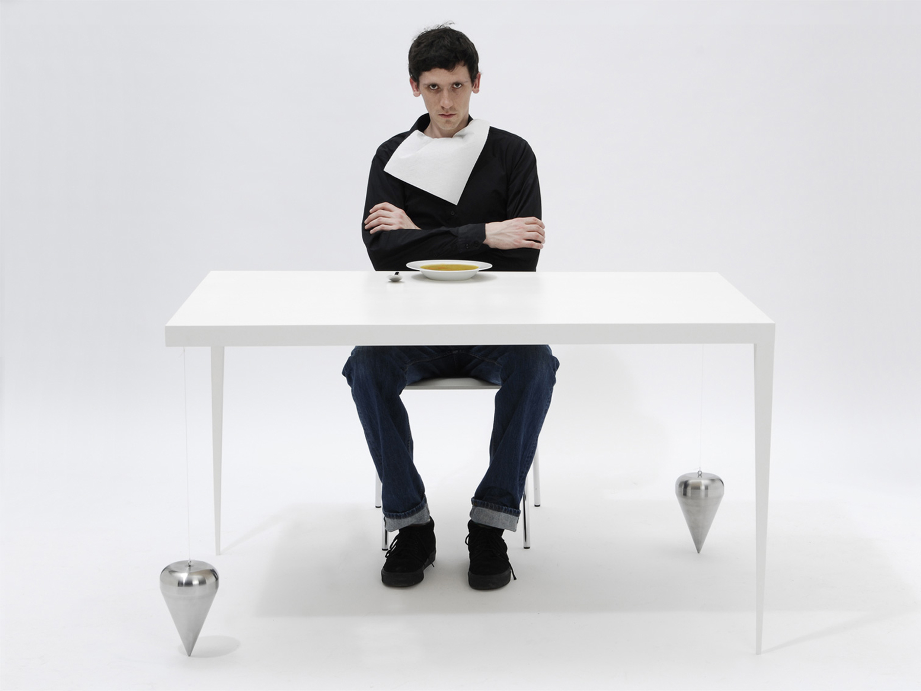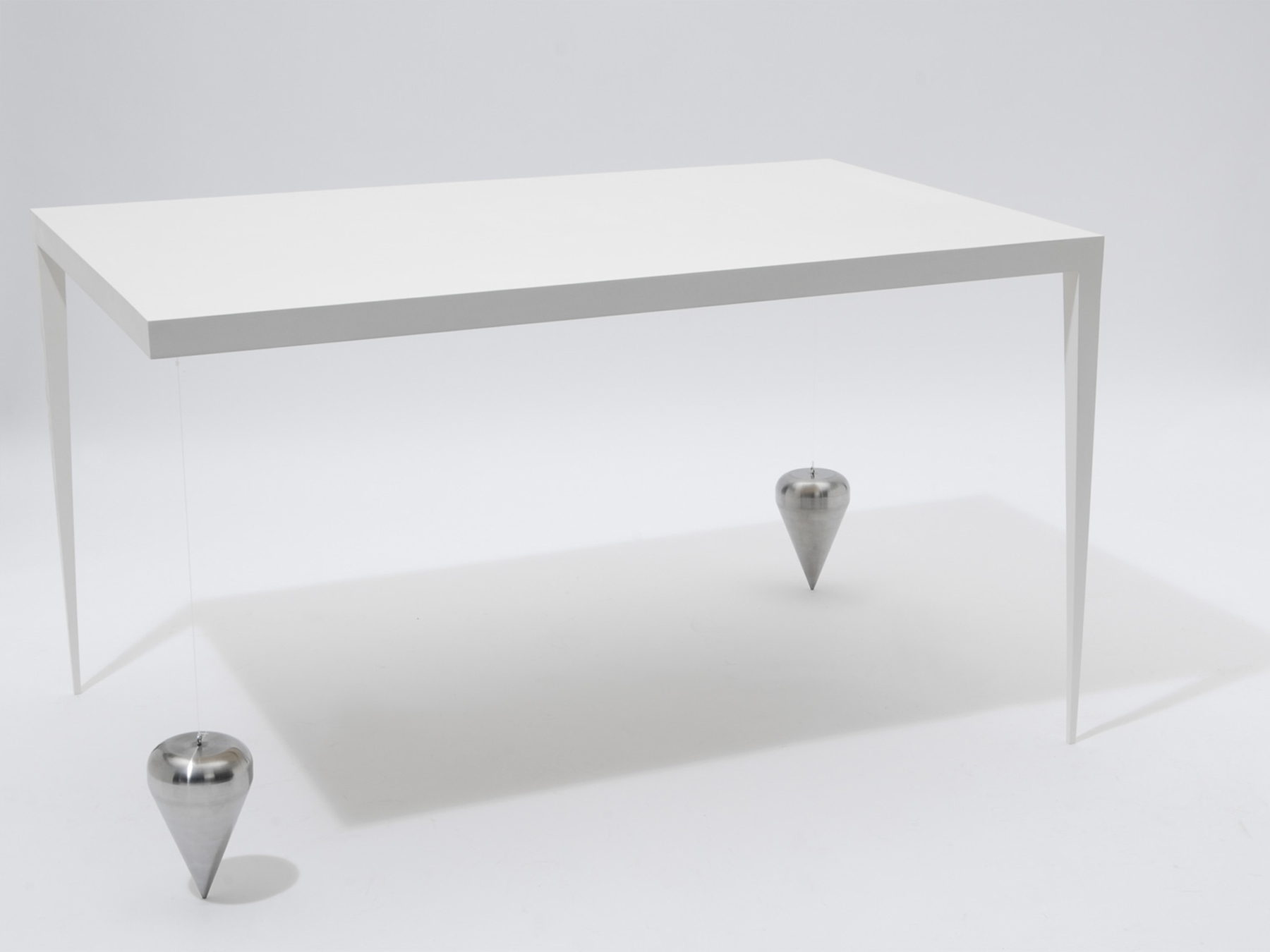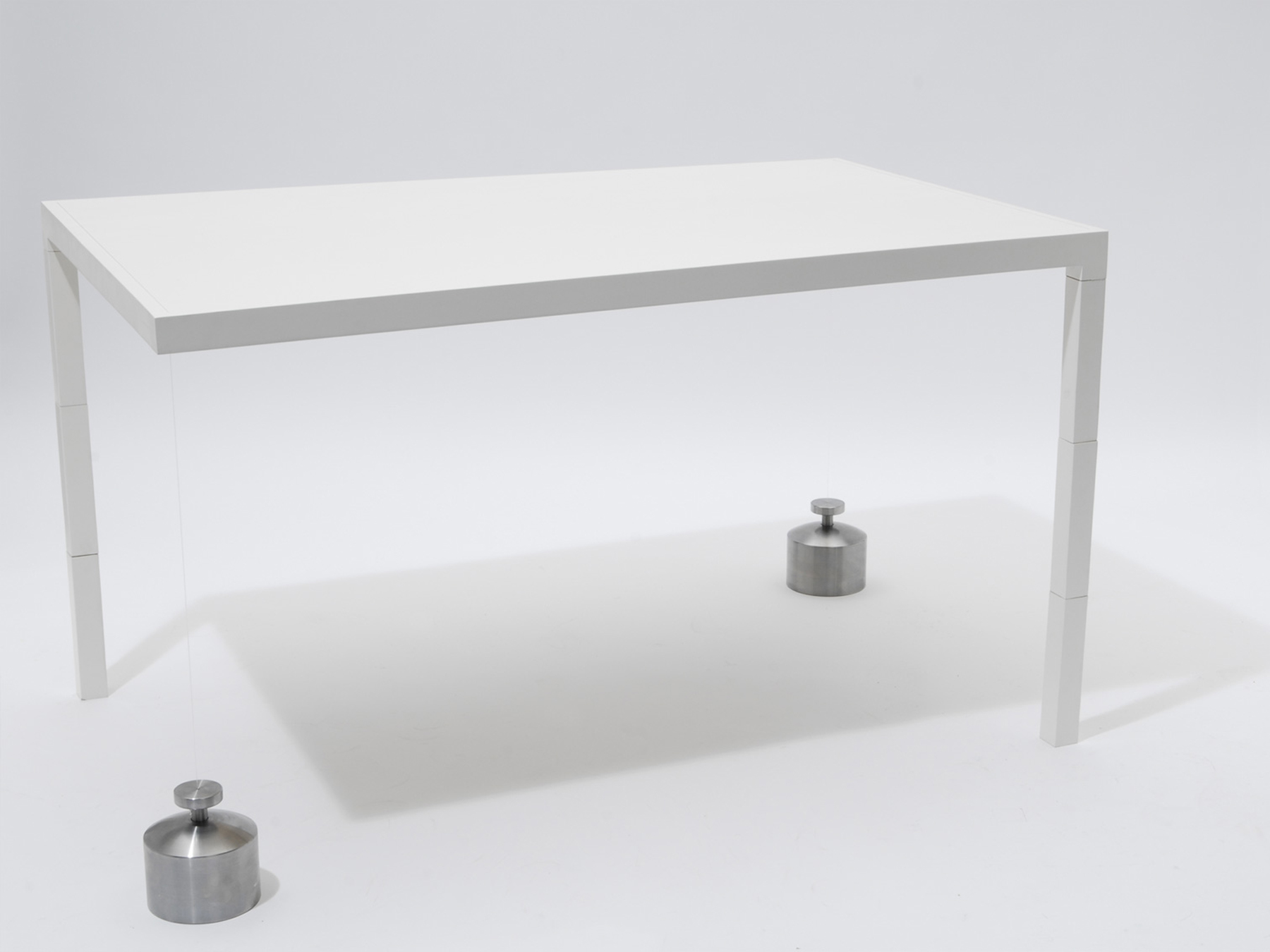Ein Tisch, der nur zwei Beine hat, fällt zwangsläufig um. Oder? Die drei Varianten der Tisch-Reihe Suppenkaspar sind jeweils mit nur zwei Tischbeinen ausgestattet. Sie werden durch Gewichte im Gleichgewicht gehalten, die über dünne, nahezu unsichtbare Fäden mit der Tischfläche verbunden sind. Auf diese Weise erhalten die zweibeinigen Tische eine erstaunliche Stabilität. Jedoch ist es nicht ratsam, sich bequem auf der Tischkante niederzulassen!