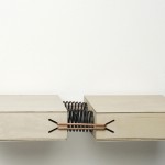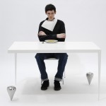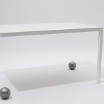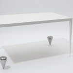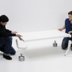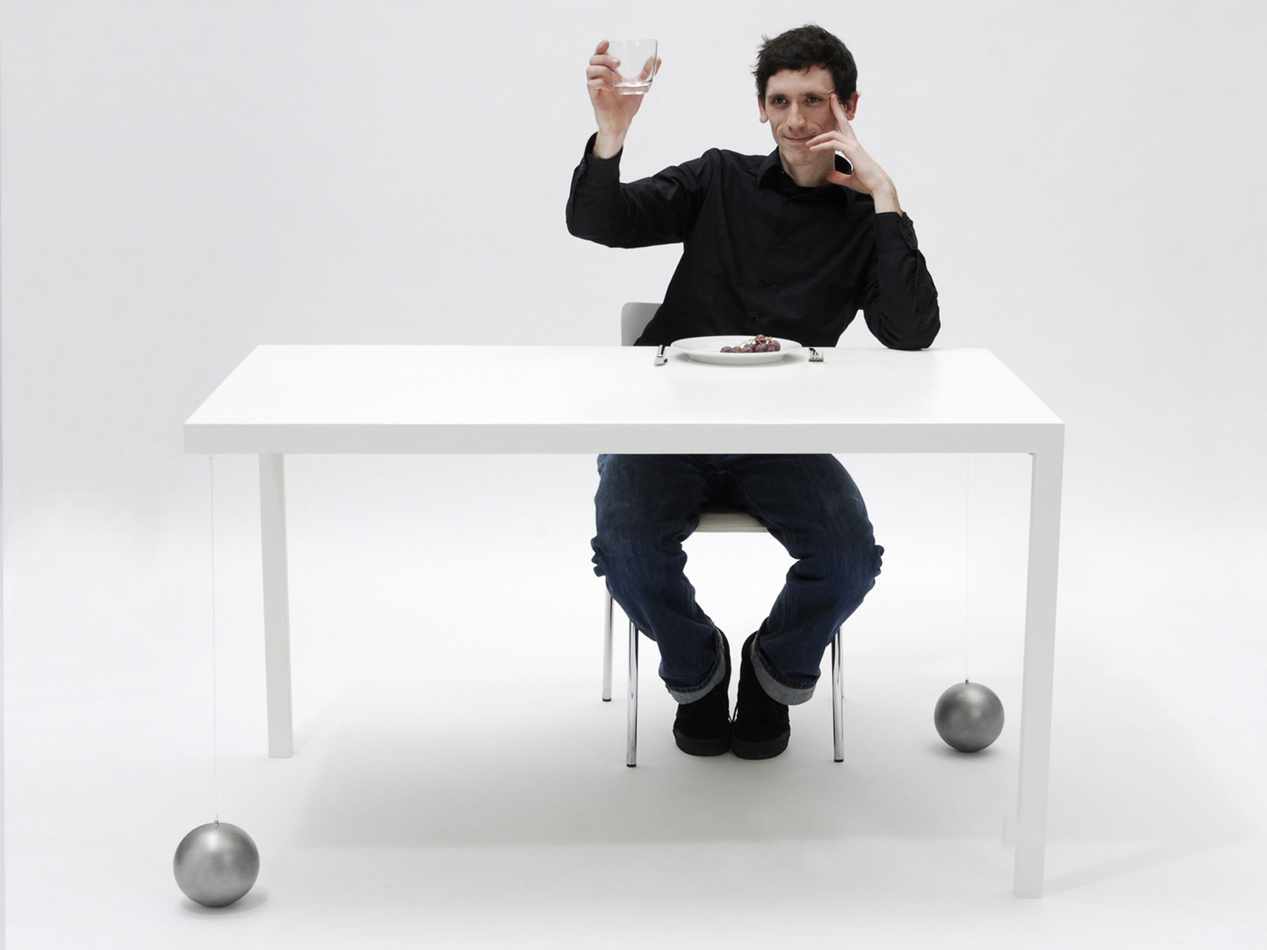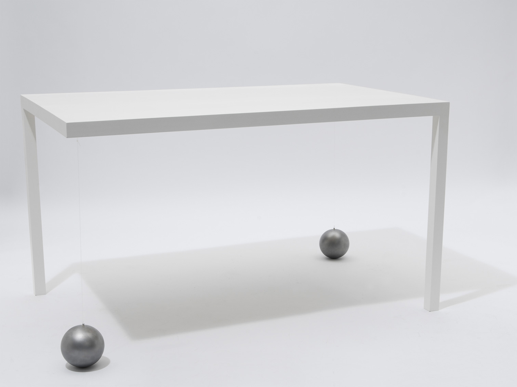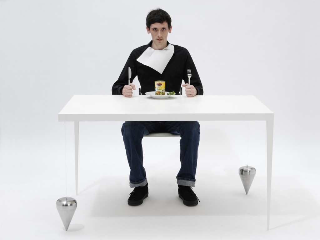 Ein Tisch, der nur zwei Beine hat, fällt zwangsläufig um. Oder? Die drei Varianten der Tisch-Reihe Suppenkaspar sind jeweils mit nur zwei Tischbeinen ausgestattet. Sie werden durch Gewichte im Gleichgewicht gehalten, die über dünne, nahezu unsichtbare Fäden mit der Tischfläche verbunden sind. Auf diese Weise erhalten die zweibeinigen Tische eine erstaunliche Stabilität. Jedoch ist es nicht ratsam, sich bequem auf der Tischkante niederzulassen!