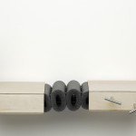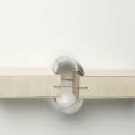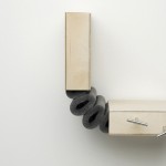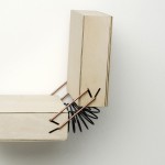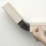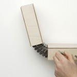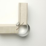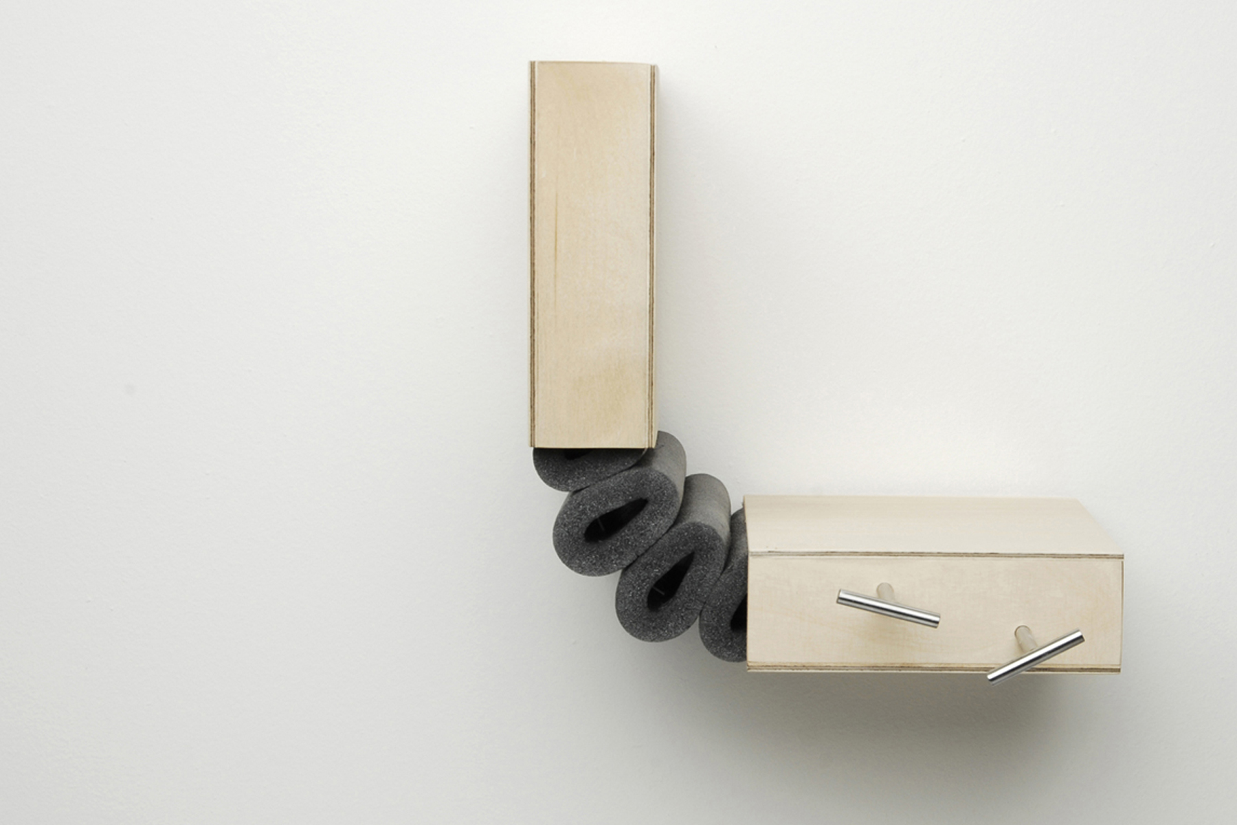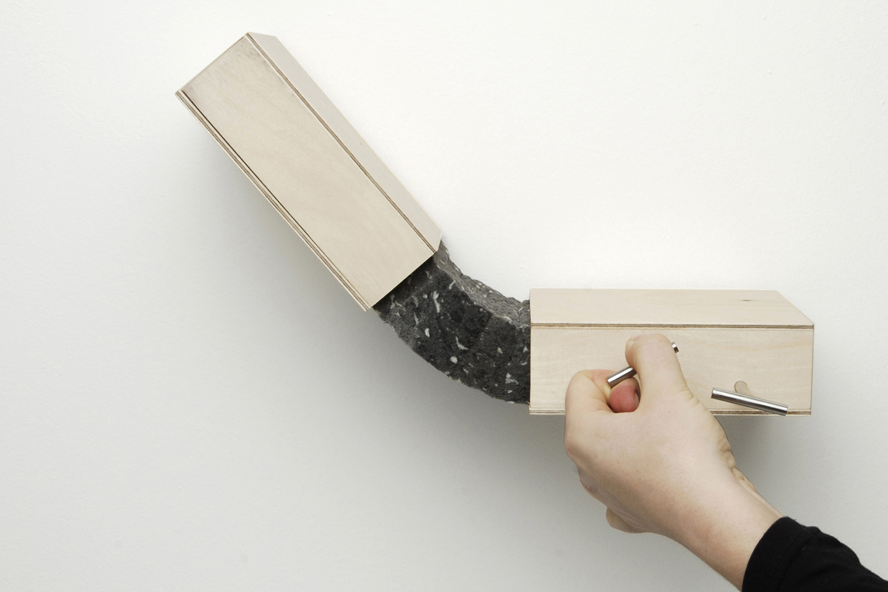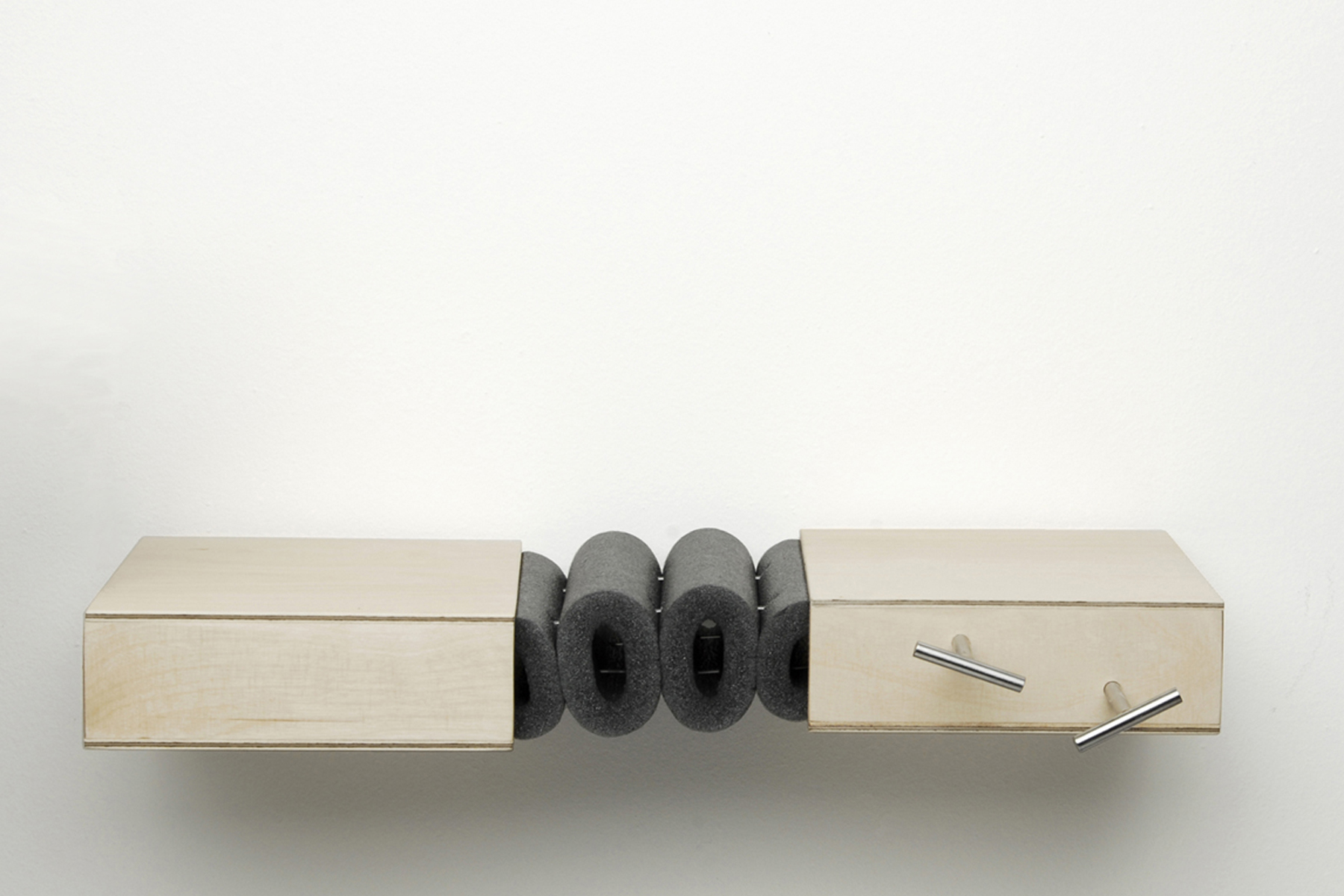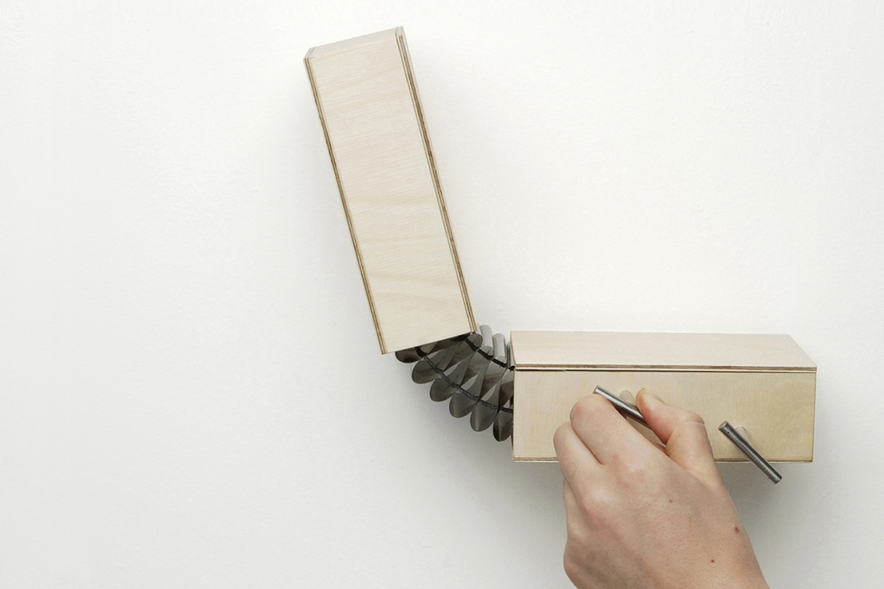 Durch ausreichend große Spannung werden zwei Elemente starr miteinander verbunden. Bei einem Arm, der stark angespannt wird, lassen sich nicht gleichzeitig Ober- und Unterarm gegeneinander bewegen. Diesen Aspekt griffen wir auf und integrierten ihn in eine Serie von Gelenken. Zwei Flächen werden an jeweils zwei Punkten gleichmäßig verspannt und dadurch horizontal verbunden. Lockert oder löst man eine dieser Verbindungen, dehnt sie sich in die entgegen gesetzte Richtung aus und bildet einen Winkel. Auf diese Weise entsteht ein in zwei Richtungen bewegliches Scharnier.