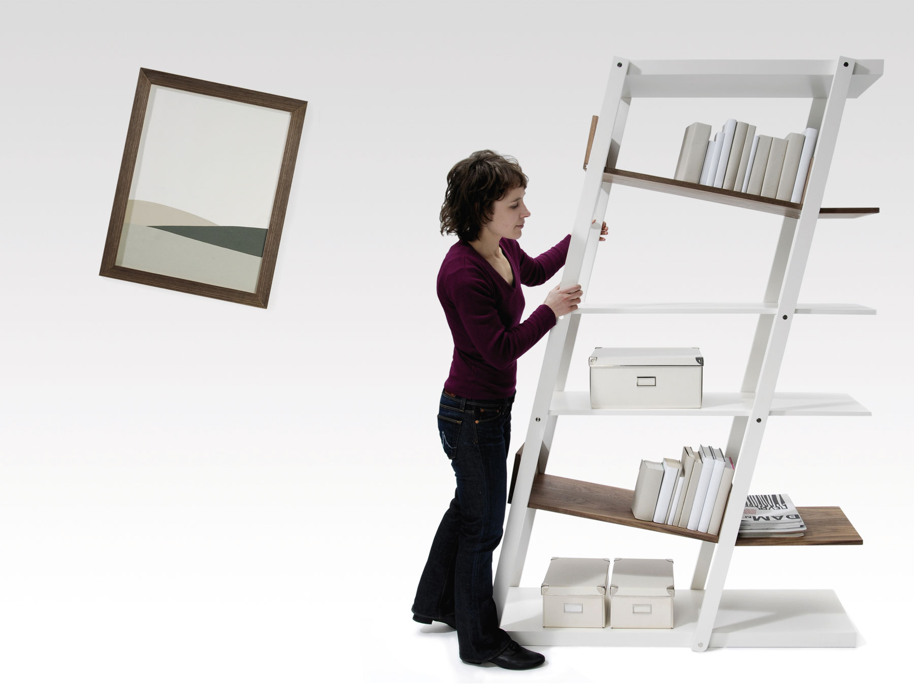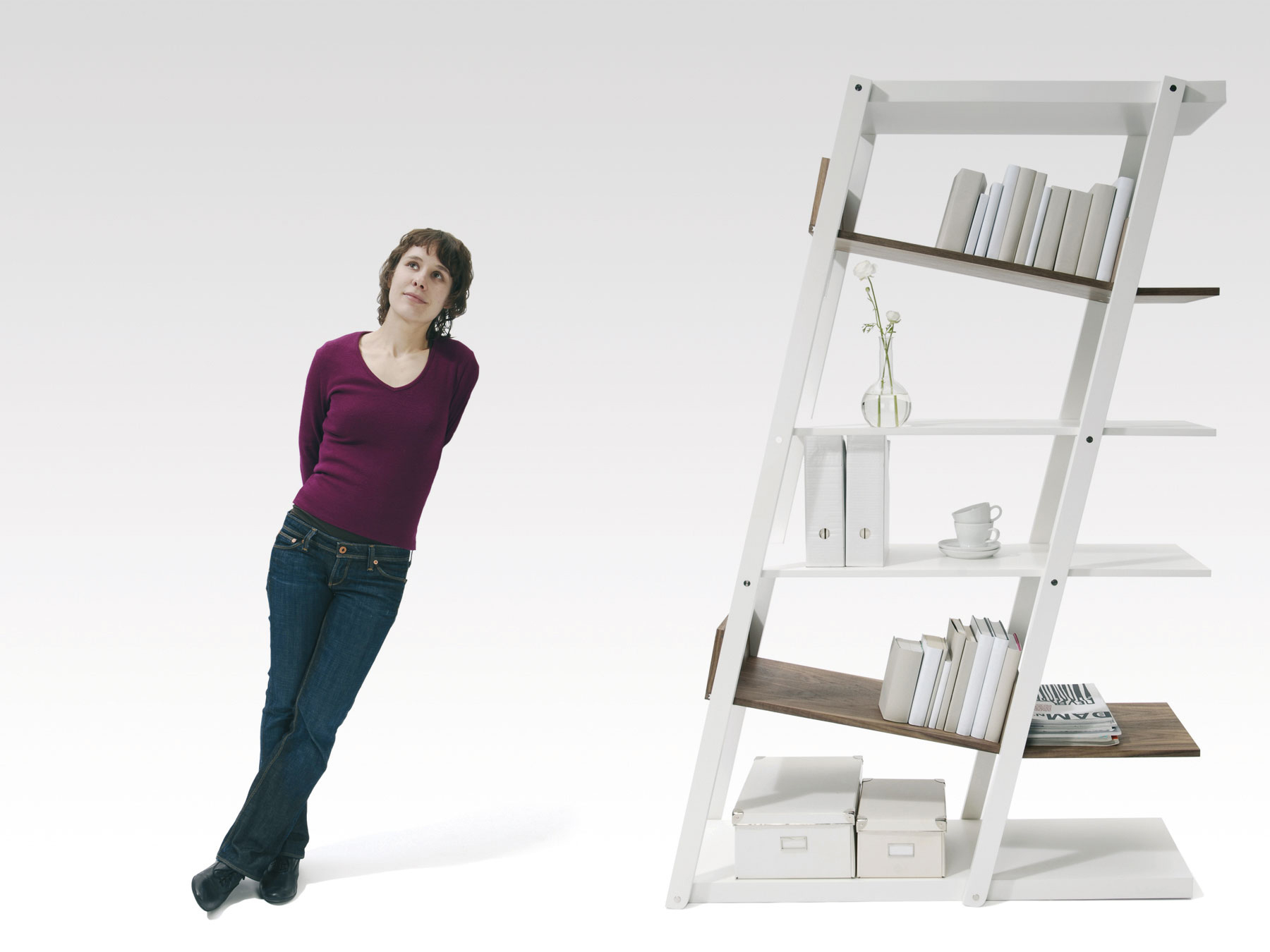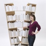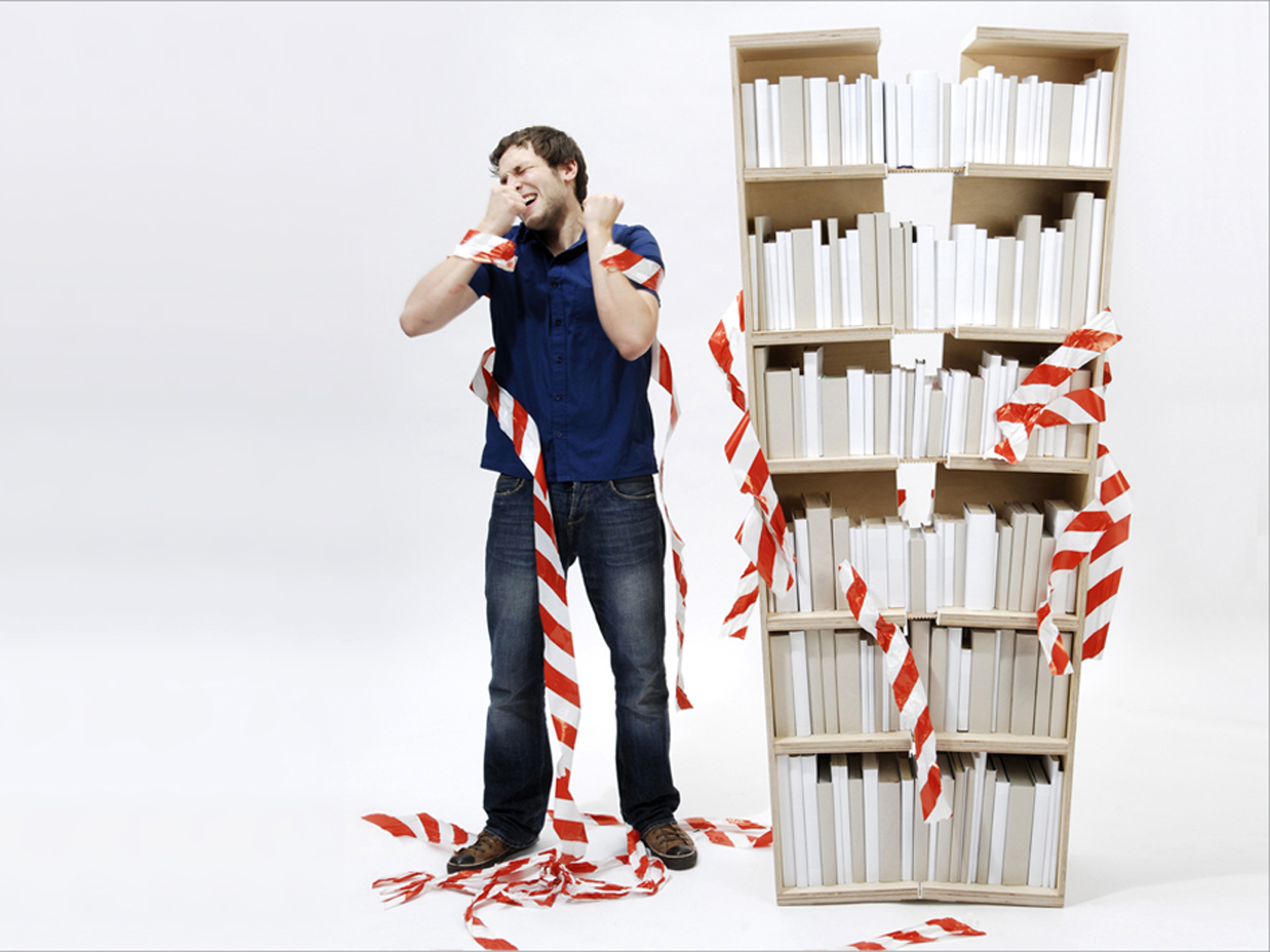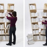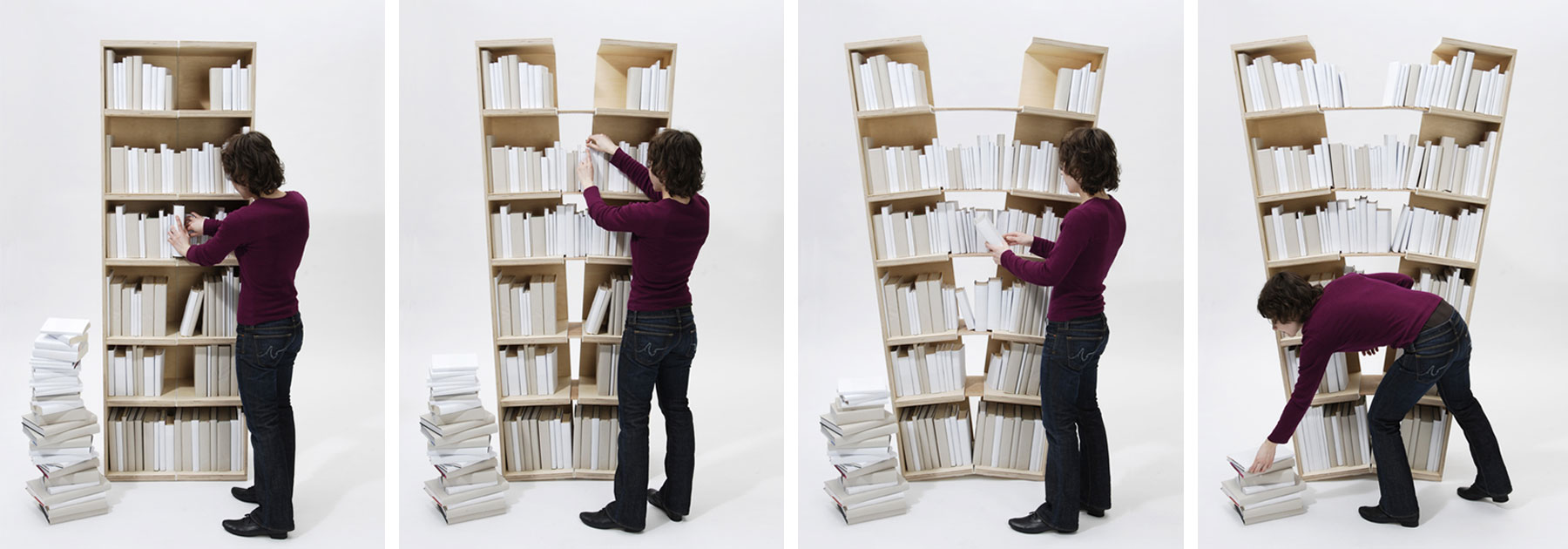Bücherregale scheinen häufig aus allen Nähten zu platzen. Man versucht, immer noch ein weiteres Buch in eine letzte, viel zu schmale Lücke zu quetschen. Dieses Regal gibt dem Druck nach. Es nimmt zu, um weitere Bücher aufnehmen zu können und buchstäblich zu platzen. Zwischen den geteilten Hälften spannt sich ein, zuvor in der Sandwichkonstruktion der Regalböden verborgener Bogen auf, der die nutzbare Fläche beträchtlich erweitert. Je mehr Bücher hinzugefügt werden, desto mehr vergrößert sich das Regal und verändert allmählich seine klassisch-rechteckige zu einer v-förmigen Kontur. Erst an einem definierten Endpunkt erreicht das Regal seine maximale Größe.