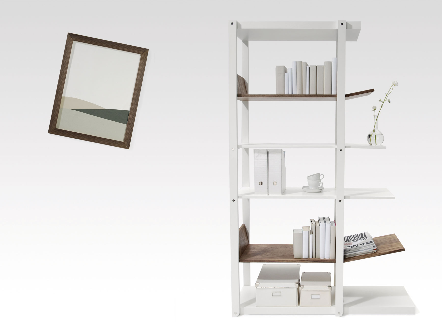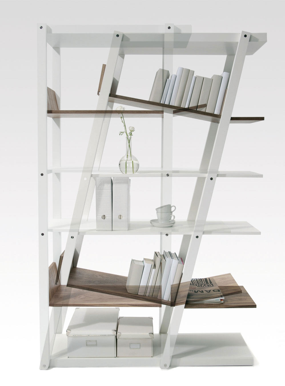 Ohne ein stabilisierendes Rückenkreuz gerät ein Regal leicht ins Schwanken und verliert das Gleichgewicht. Dadurch wird eine Parallelogrammverschiebung ermöglicht und das Regal neigt sich zur Seite. Der sich bildende Überhang kann für neue Funktionen genutzt werden. Durch eine Kombination aus Drehpunkten und festen Verbindungen stellen sich einige Regalböden beim Kippen schräg.