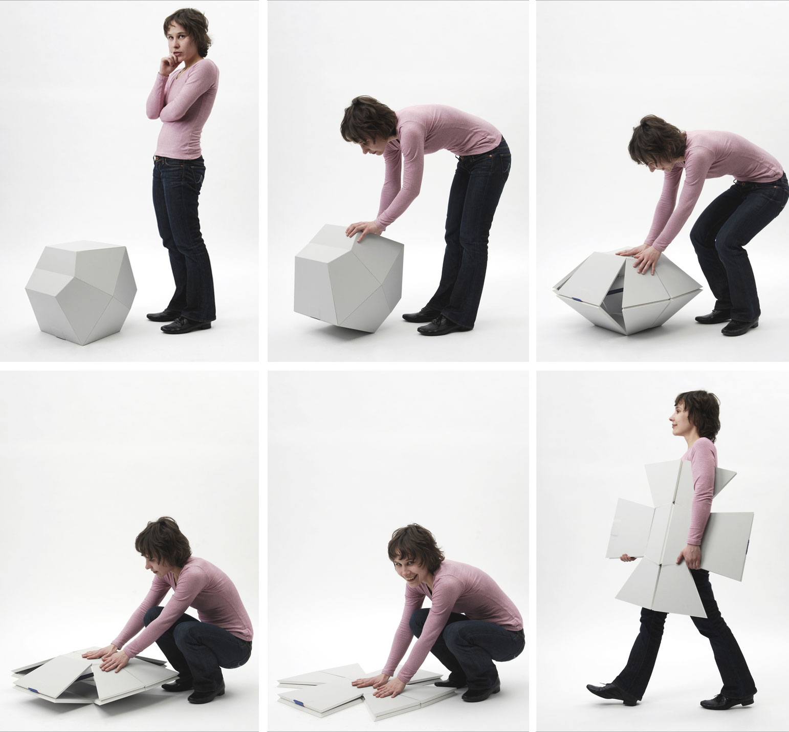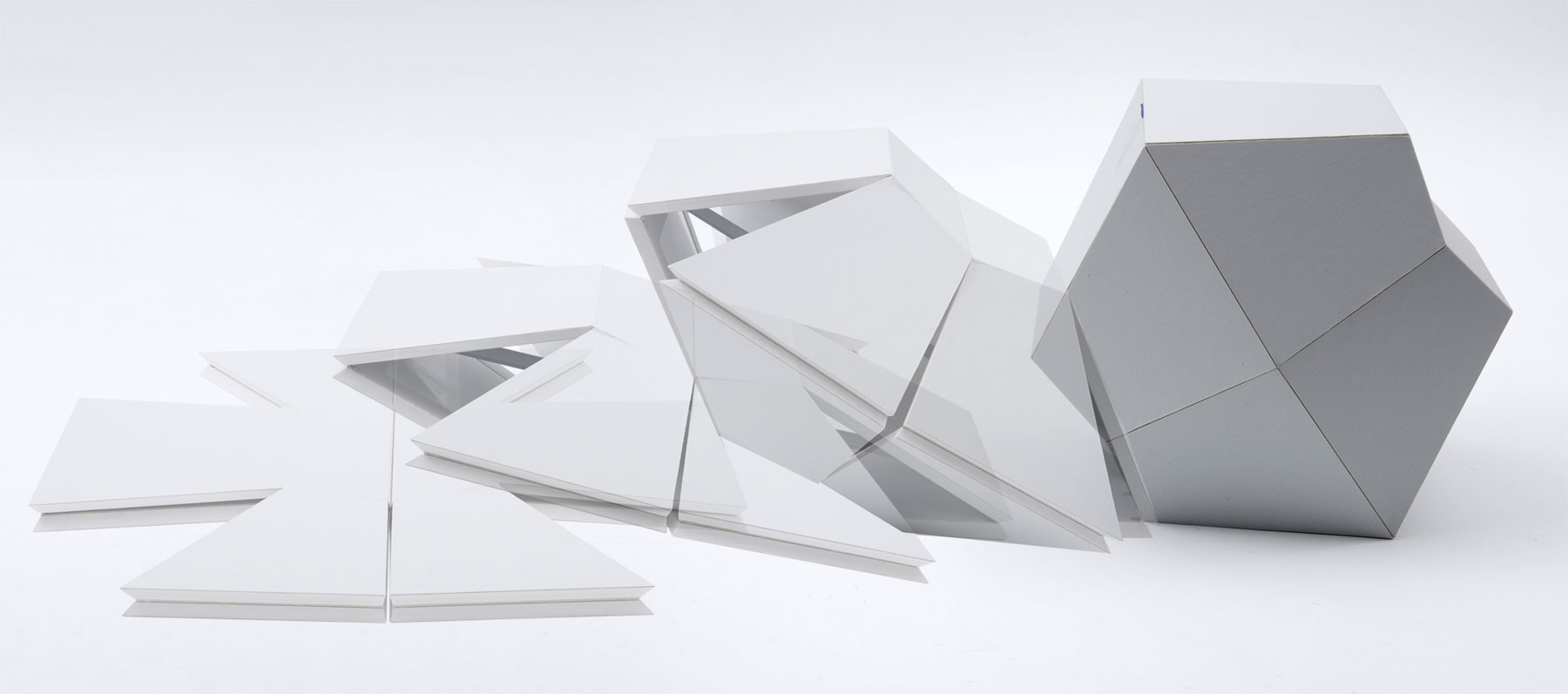 Ausgangspunkt für diesen Entwurf war die Idee eines sich durch Spannung aus dem Boden entfaltenden Hockers. Daraus entwickelte sich ein zunächst flaches Objekt, aus dem aufgrund seiner Geometrie ein Hocker entsteht, wenn die Spannung freigegeben wird. Ein im Inneren befestigtes Gummiband lässt ruckartig einen dreidimensionalen Körper aus der Fläche entstehen. Die Kanten der einzelnen Flächen dieses Hockers treffen aufeinander und stabilisieren sich gegenseitig.