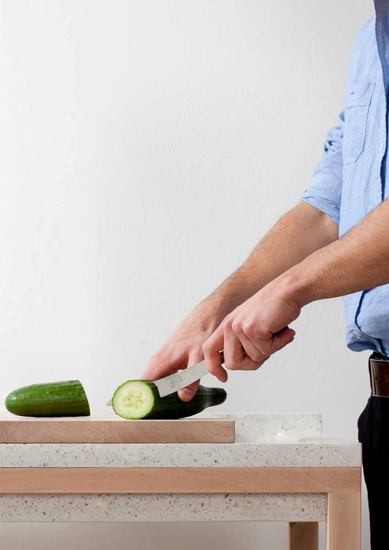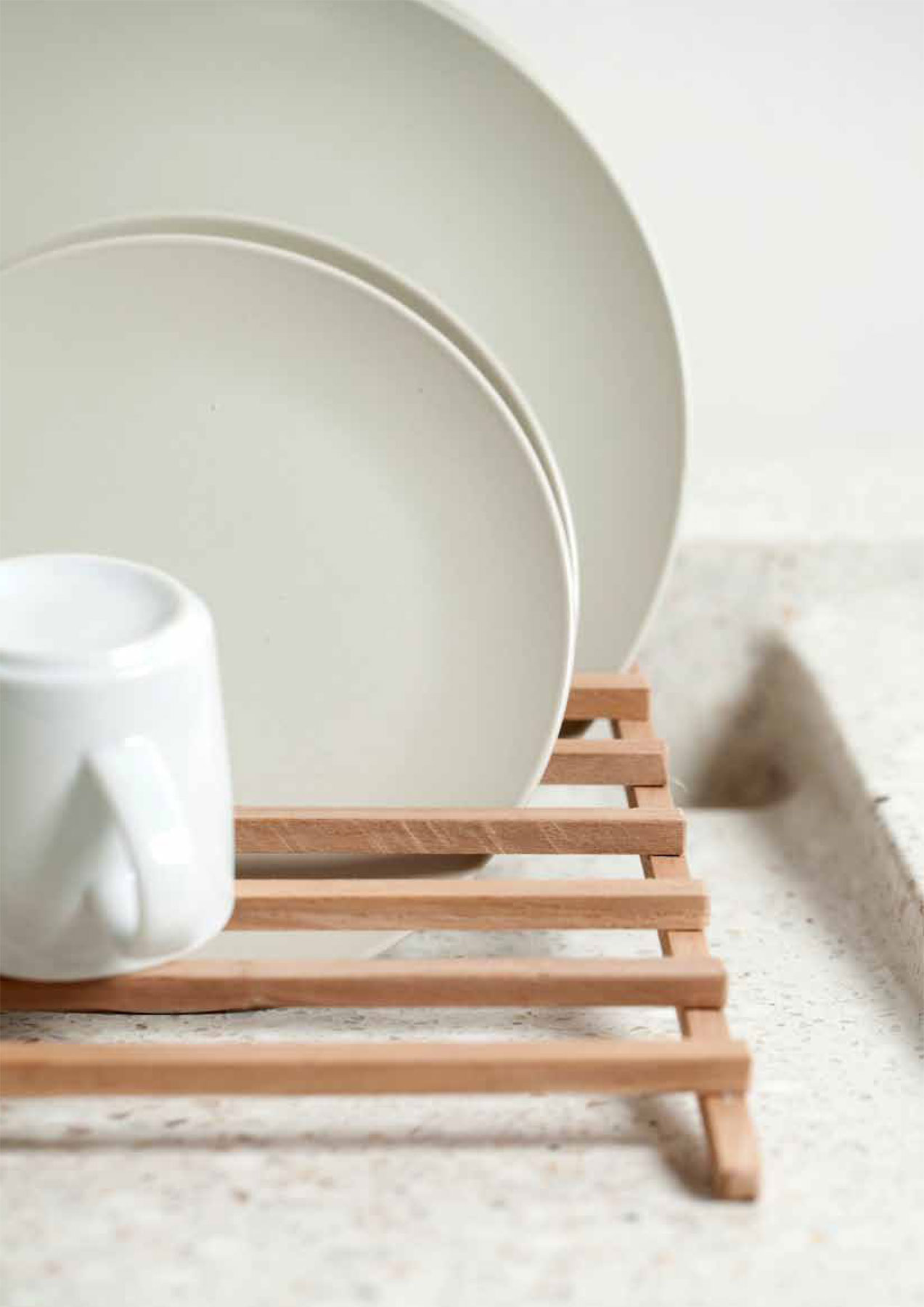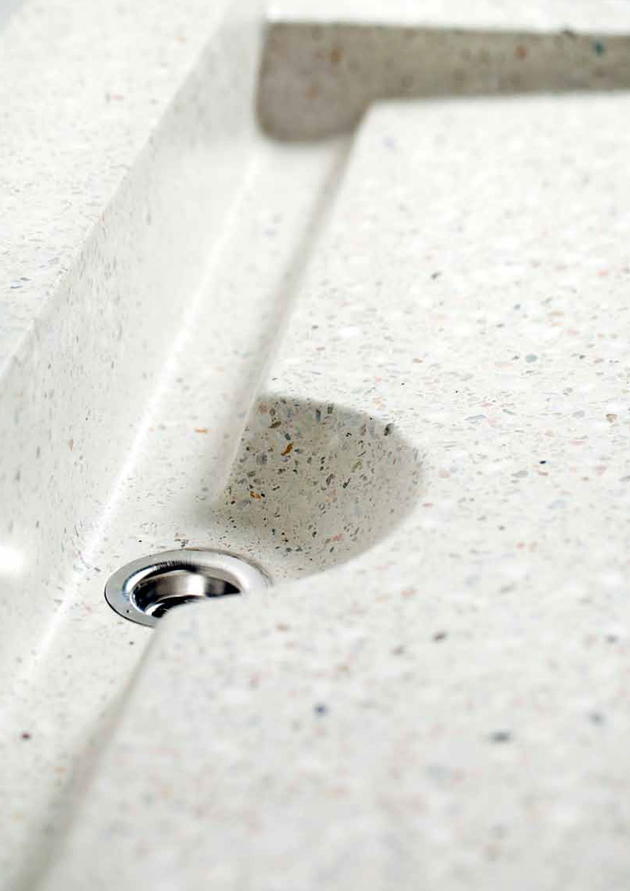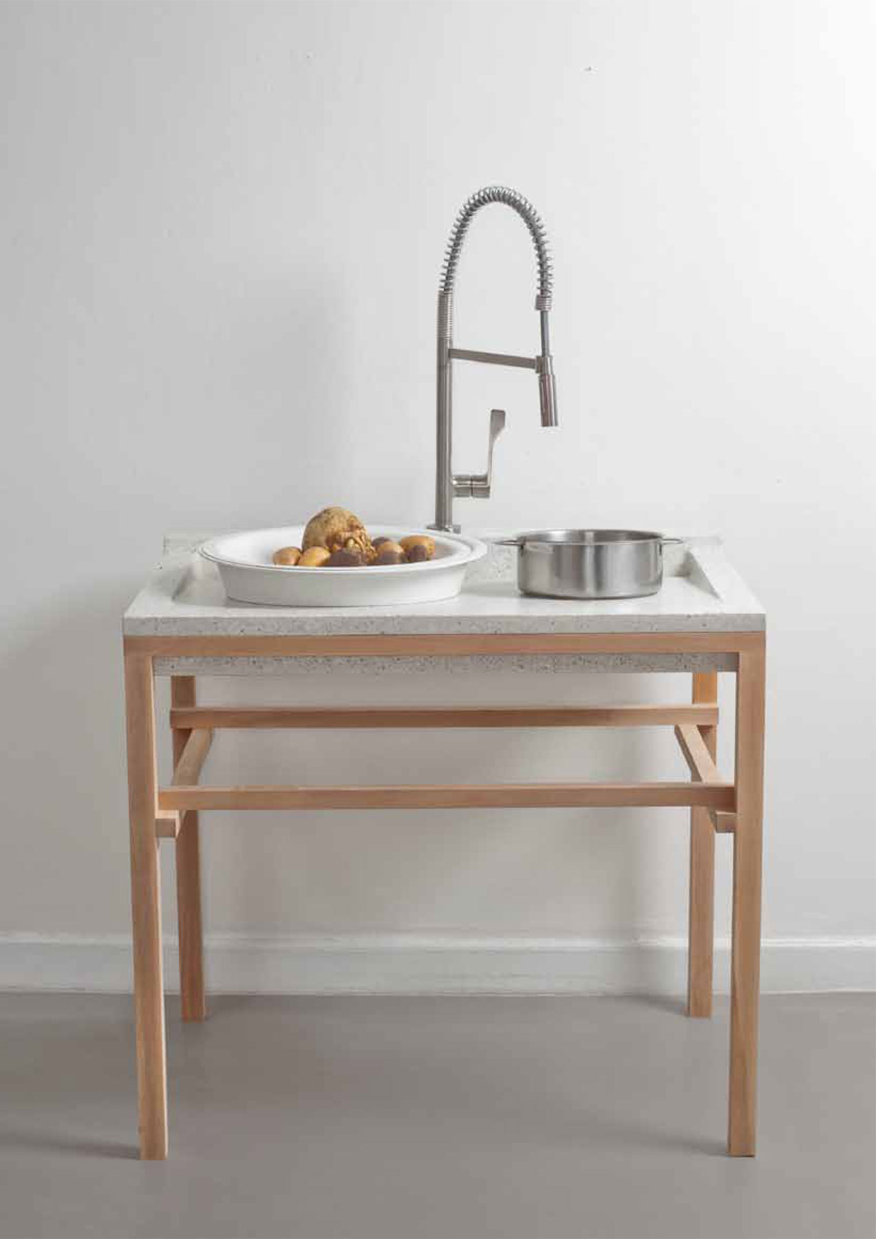 Plat‘eau ist ein Waschtisch, der viel Raum für genussvollen und flexiblen Umgang mit Wasser in der Küche schafft. Auf der leicht abfallenden Fläche darf Wasser ungehindert fließen, sprudeln und spritzen, während sie auch als Arbeitsplatte zum Einsatz kommt. Hier können Lebensmittel zubereitet, Teig ausgerollt und das Backblech geschrubbt werden.