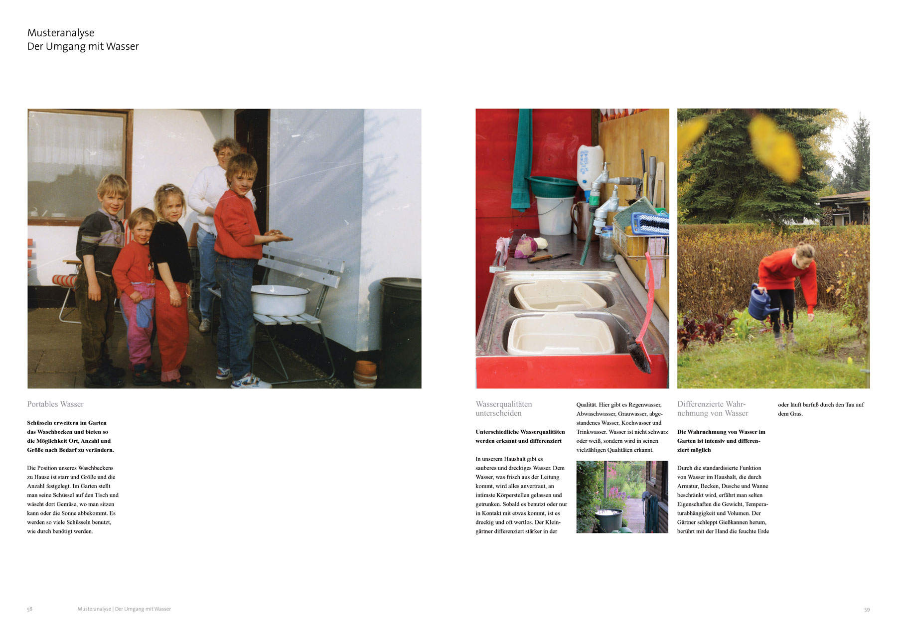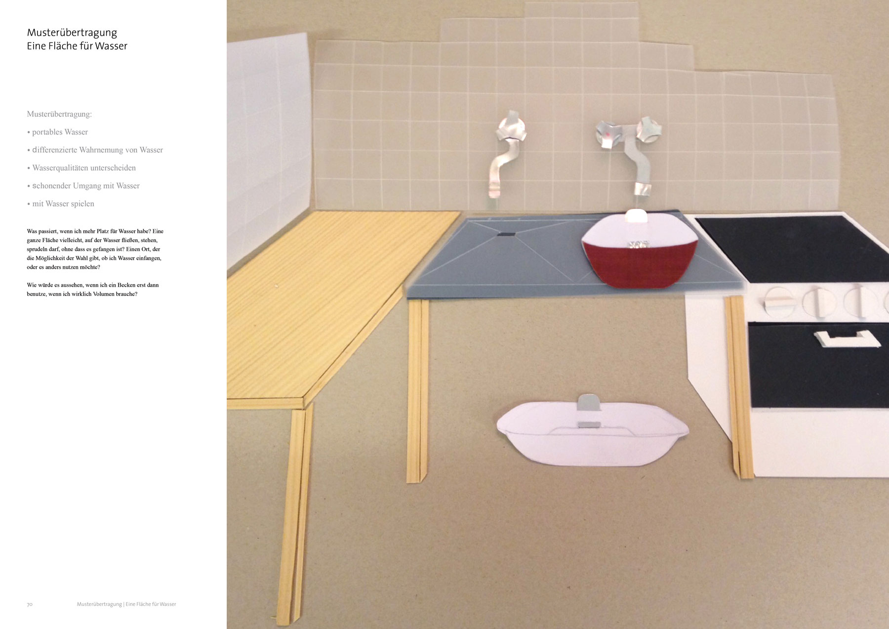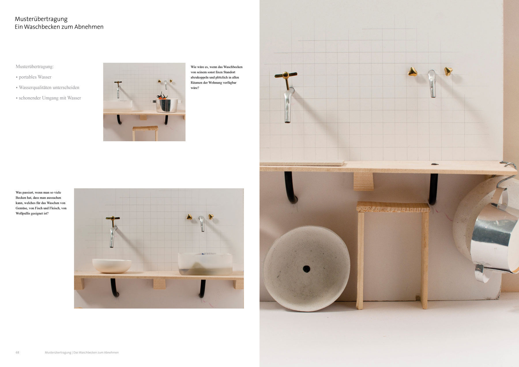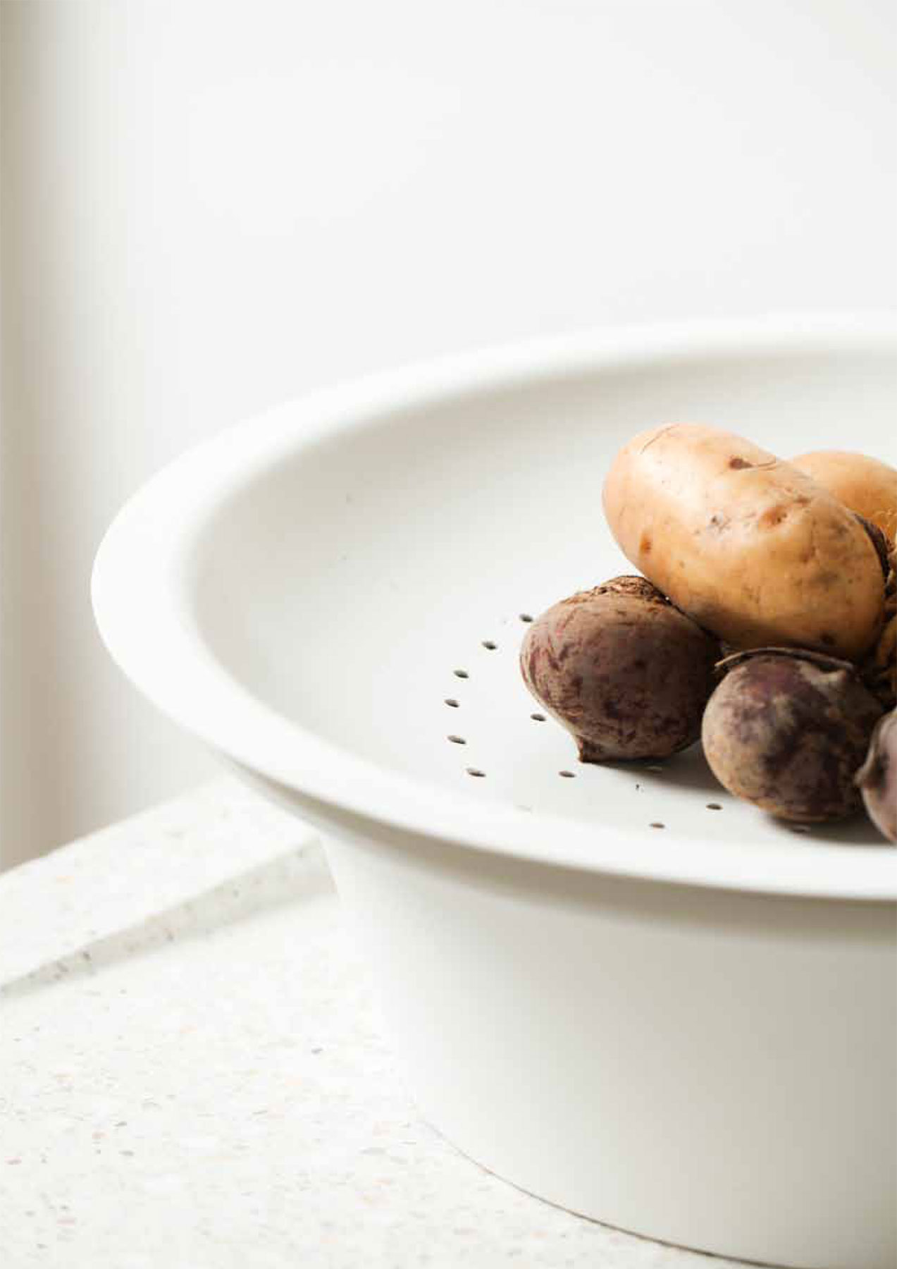 Für größere Mengen Wasser gibt es verschiedene Schüsseln, die differenzierte Einsatzmöglichkeiten in Volumen, Anzahl und Gebrauch zulassen – je nachdem, ob ich den Salat oder meinen Wollpulli wasche, im Stehen arbeite oder das “Waschbecken” auf den Küchentisch stelle, um im Sitzen die Kartoffeln zu waschen. Durch den in den Gefäßen integrierten Ablauf wird das Anheben und Ausgießen überflüssig. Der Abfluss in Form eines Siebes hält feste Elemente auf, die dann entnommen oder direkt über dem Mülleimer ausgekippt werden können.