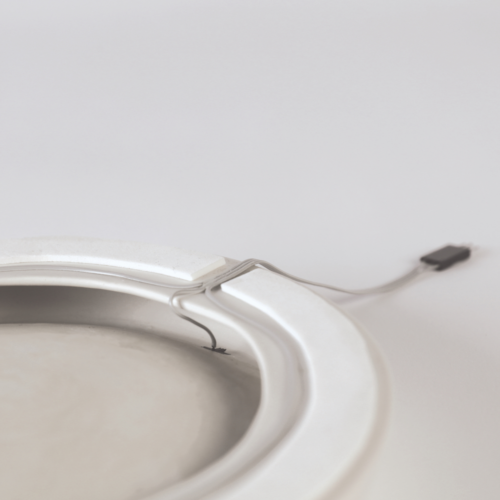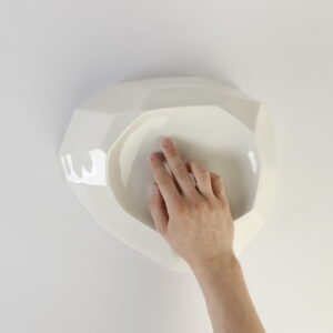 Das finale Objekt ist eine Zusammenkunft des Beschriebenen. Ein skulpturales Porzellanobjekt, definiert durch klare, kristalline Flächen, einzig durchbrochen von einer konkaven Mulde, welche die Hand zum Verweilen und Erforschen der Oberfläche einlädt. Das unwissende Auge mag dieses Objekt als reinen Teil einer geschmackvollen Einrichtung wahrnehmen, doch die Bewohner dieses Zuhause kennen die Feinheiten von Berührung und Gesten, die diesem Objekt komplexe Steuerung verschiedenster häuslichen Technologien ermöglichen, von Beleuchtung über Medien, Temperatur und vielem mehr. Die Steuerung selbst bleibt dabei stets intim und nahbar, ganz im Gegensatz zu den meisten aktuellen Alternativen.