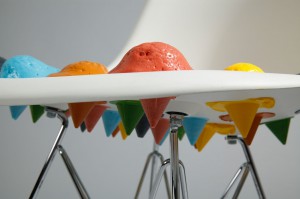 Die Basis in diesem Projekt war für alle gleich, nämlich der Klassiker der Entwerfer Eames, das Eiffelturm-Gestell. Die zweite Hälfte eines Stuhl, die Sitzschale stand zur freien Interpretation. Entstanden sind vielfältige Ideen, die das Spannungsfeld zwischen Tradition und Aktualität, industriell gefertigtem Markenprodukt und individueller, entwerferischer Autorschaft abdecken.