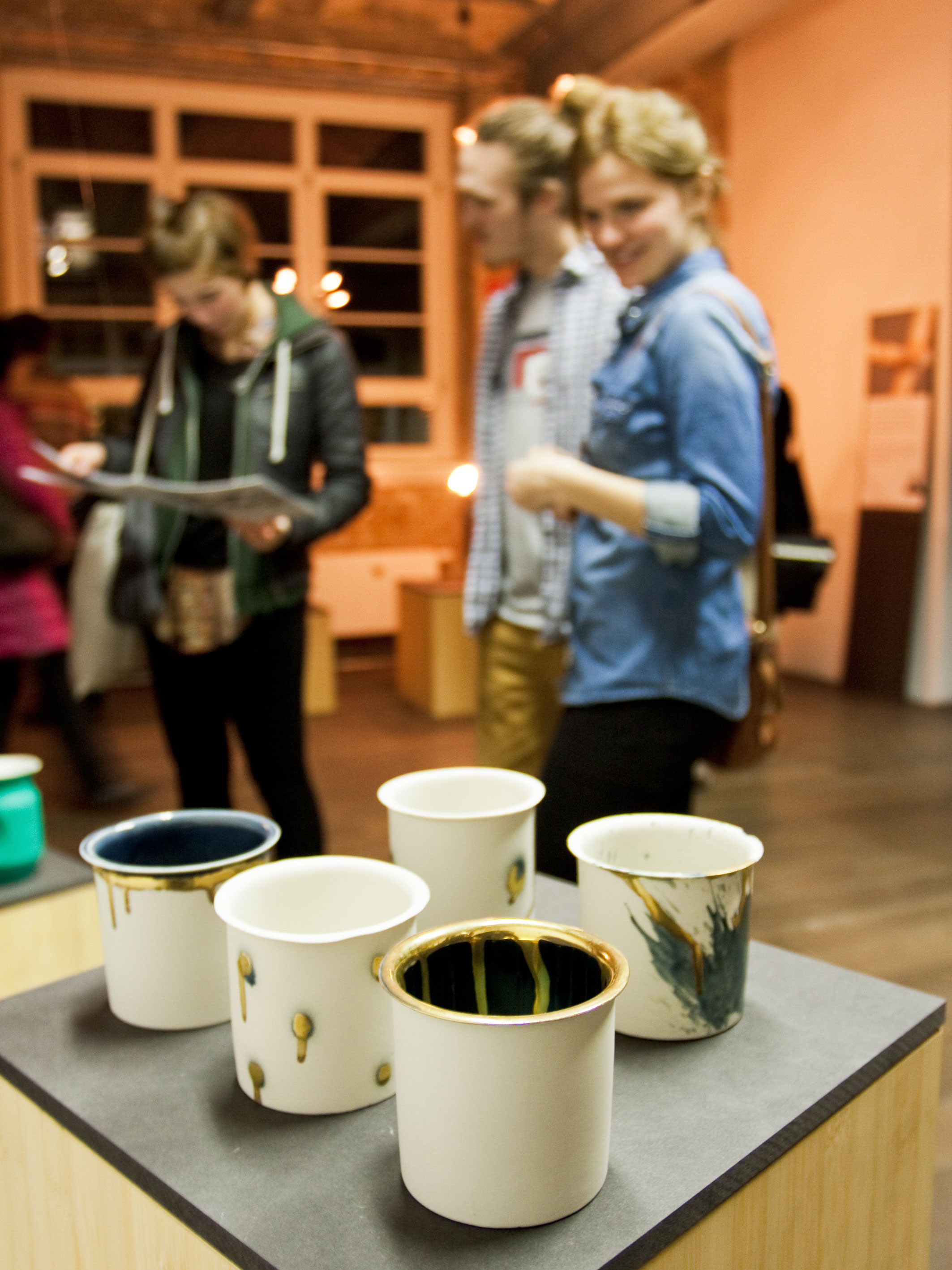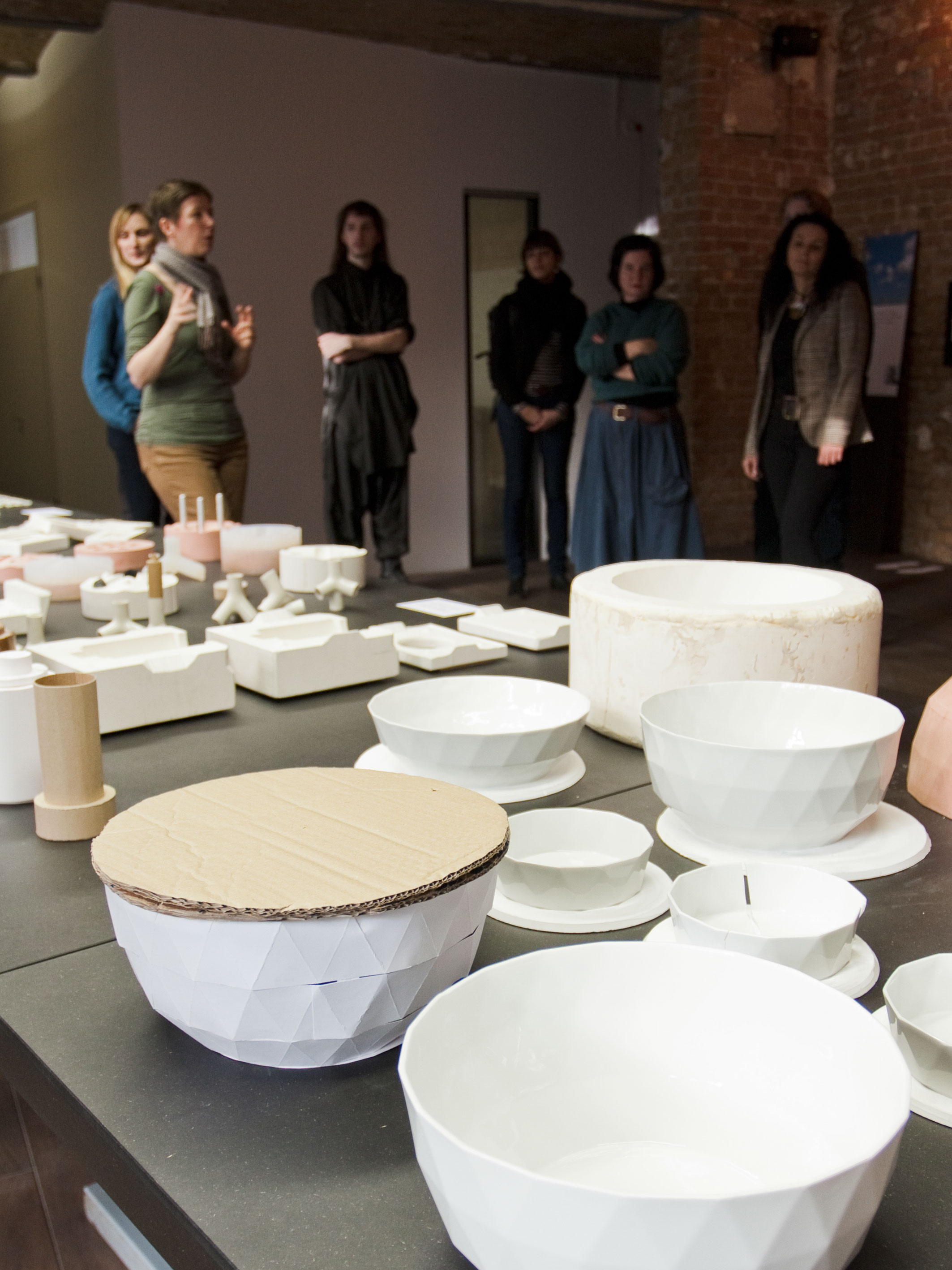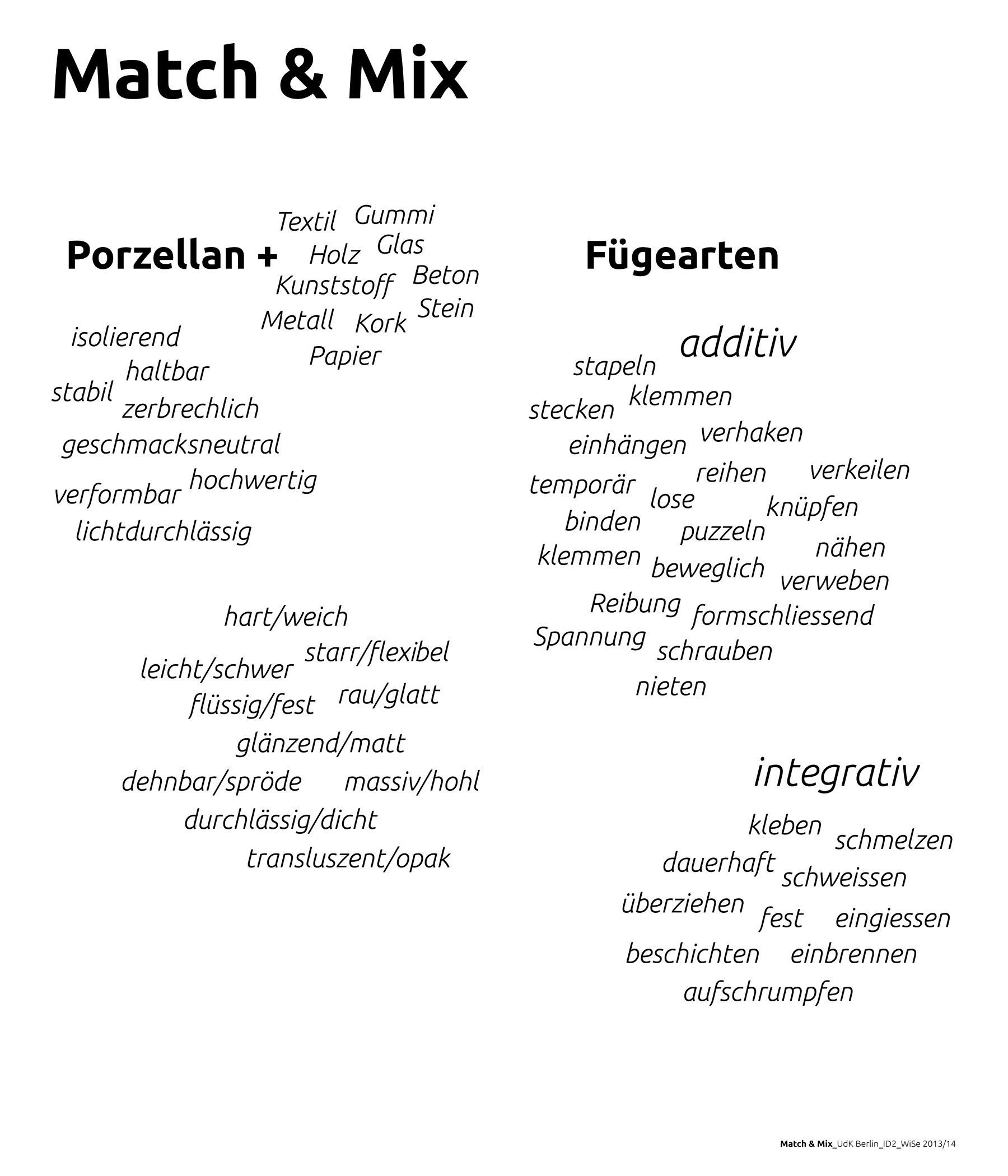 An diesem Punkt wollen wir ansetzen und untersuchen, welche anderen Materialien auf welche Weise mit Formteilen aus Porzellan verbunden werden können. Welche Möglichkeiten ergeben sich zum Beispiel, wenn wir die ausgemachten Eigenschaften durch die Kombination mit anderen Materialien ergänzen oder kontrastieren – beispielsweise mit der Flexibilität von Silikon, der Weichheit von Textil, der Transparenz von Glas, der Rauheit von Holz oder der Präzision von scharfkantigem Metall? Nach einer ausgiebigen Experimentierphase sollen, basierend auf den gewonnenen Erkenntnissen, passende Produktkonzepte für einen Materialmix entworfen werden.