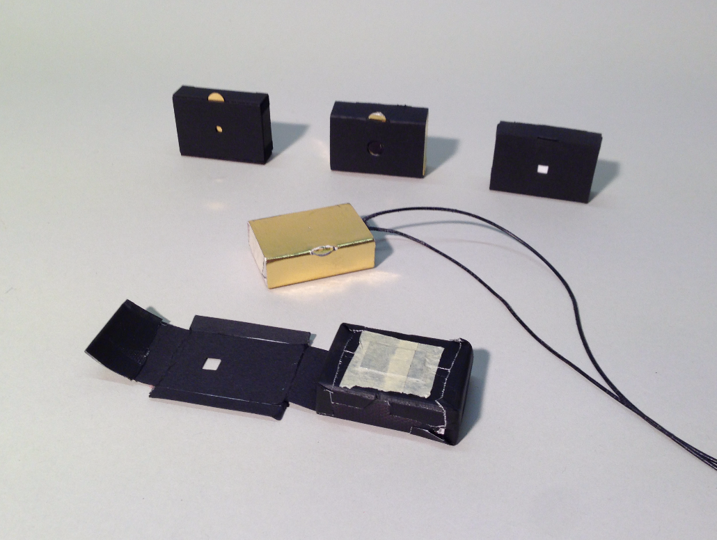 Auf der Interaktions-Ebene hat die Entwicklung hauptsächlich zu hochautomatisierten und komplizierten Menüs geführt, die sich aber im Wesentlichen noch der Sprache der analogen Fotografie bedienen: Parameter wie Blende, erschlusszeit, etc.. Das Hauptstudium entwickelt innovative Konzepte zum Aufnehmen und Aufbewahren von optischen Standbildern und denkt vom Gehäuse bis zur Interaktion neu. Bevor wir aber nach alternativen Lösungsansätzen suchen, beschäftigen wir uns mit dem Medium selbst – mit der Ur-Form der optischen Aufnahme-Systeme: Wir beginnen mit dem Bau einer Lochkamera, belichten Fotopapier und verschwinden zunächst in der Dunkelkammer…im Folgenden werden die Kurzzeitentwürfe der Lochkameras gezeigt, die innerhalb einer Woche mit Unterstützung des Fotografen, Sebastian Pfütze, entstanden sind.