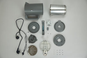 Meine Methode ist es zu allererst das gesamte Gerät zu zerlegen und alle seine Bestandteile in einer Explosionsdarstellung zu dokumentieren. Dabei kann man sehr viel über die Konstruktion von Geräten lernen und sowohl Stärken, als auch Schwächen von Herstellung und Material kennenlernen. Danach werden die Einzelteile nach Material sortiert.