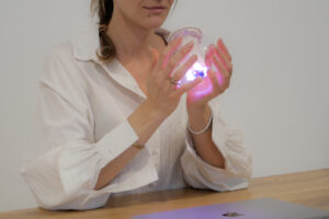 The light Buddy offers us the chance to calm our body physically and psychologically within a very short time. Through the visual feedback of the pink light, which we hold in both hands, on the one hand, nervous excess actions are banished, because the hands have a task and must remain calm. And for another, we can focus more easily on the rhythm of breathing. An interplay of taking control and giving it up, which makes the object a teammate, a buddy. The color pink symbolizes, among other things, playfulness, security and compassion. Also in therapies with adults and children, in the most diverse areas, the lamp could be an exciting auxiliary object.