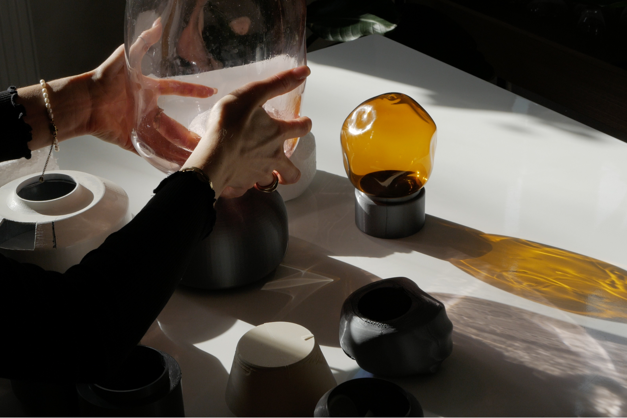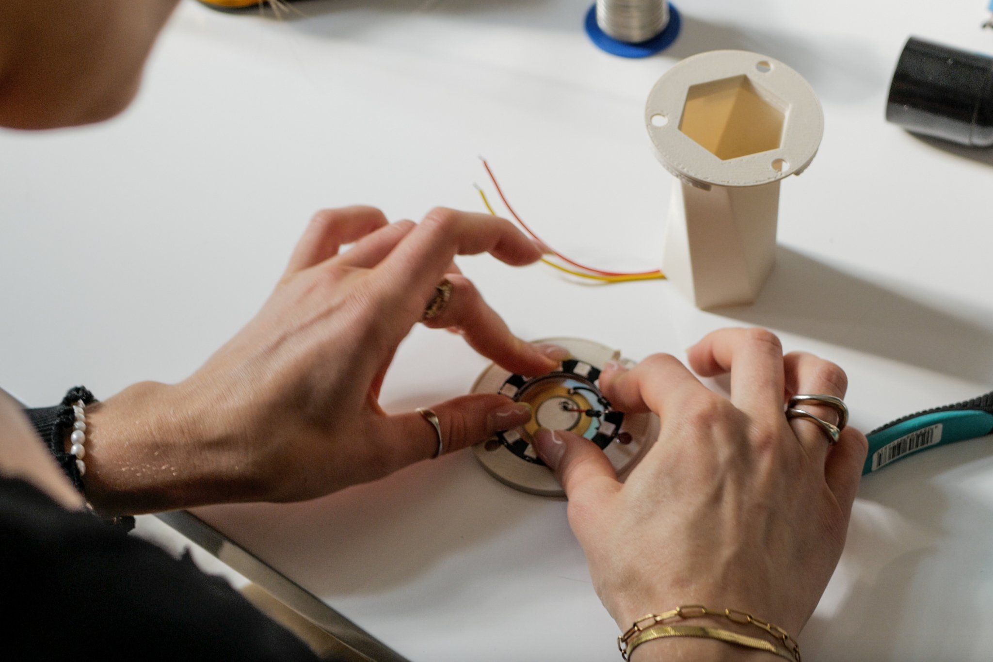 Buddy ist eine Leuchte, welche mit einem piezo-Vibrationssensor ausgestattet ist. Nimmt man die Leuchte in beide Hände und atmet durch halbgeschlossene Lippen vier Sekunden auf die Folie, leuchtet sie hell auf. Sie wird für vier Sekunden leuchten und dann vier Sekunden ausblenden. Mit ihr gemeinsam kann man Atemtechniken durchführen, die uns helfen Kontrolle wiederzuerlangen und den Fokus nach innen zu richten, sich zu sortieren und wieder gestärkt nach außen zu treten. Ist die ruhige Art der Atmung verinnerlicht, kann sie auch im Alltag unauffällig durchgeführt werden, um Herausforderungen gelassener zu bestehen. Mir war es wichtig, eine Auszeit zu gestalten, die nichts mit dem Eintauchen in eine Parallelwelt zu tun hat, wie es oft der Fall bei Realitätsflucht, dem sogenannten Eskapismus ist, in dem digitale Welten Zuflucht bieten. Stattdessen habe ich mich von Naturereignissen inspirieren lassen, die unseren Fokus fesseln und dennoch Platz für Gedanken machen. Wie zum Beispiel das Schauen in ein Lagerfeuer oder das Beobachten von Kaustik im Wasser.