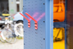 In my bachelor’s thesis, I developed a modular exchange point for neighborhoods. It is mobile, weatherproof and vandal-proof. Thanks to the grid of holes, many additional components can be attached to the exchange point, depending on what the specific community needs.