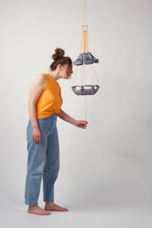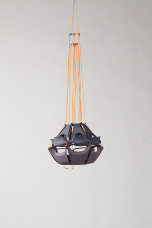 Die Kunststoffe der Radkappen sind thermoplastisch, das heißt, dass sie unter Hitze verformbar sind und nach dem Erstarren die Form beibehalten. Um dieses Ausgangsmaterial in eine neue Verwendung zu überführen, habe ich verschiedene Bearbeitungsmethoden ausprobiert. Mit einer Bandsäge werden die Radkappen eingeschnitten, die Oberfläche lässt sich mit der Sandstrahlmaschine glätten, die scharfen Kanten können mit einem Multimaster und verschiedenen Körnungen geschliffen werden. Das Erhitzen mit einem Heizstrahler lässt eine starke Biegung des Korpus zu. Mehrere Radkappen werden mit den bereits vorhandenen Drähten und neuen Drahtseilklemmen verbunden, so dass auch das Gewicht der Radkappenkonstruktion in eine notwendige Stabilität gebracht werden kann.
