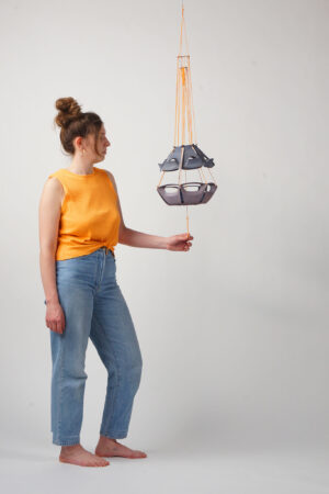 The plastic of the hubcaps is thermoplastic, which means that it can be formed under heat and retains its shape after solidification. I tried out various processing methods to transfer this raw material to a new use. The hubcaps are cut with a band saw, the surface can be smoothed with a sandblasting machine and the sharp edges can be sanded with a multimaster and various grit sizes. Heating with a radiant heater allows the body to be strongly bent. Several hubcaps are connected with the existing wires and new wire rope clamps so that the weight of the hubcap construction can also be given the necessary stability.